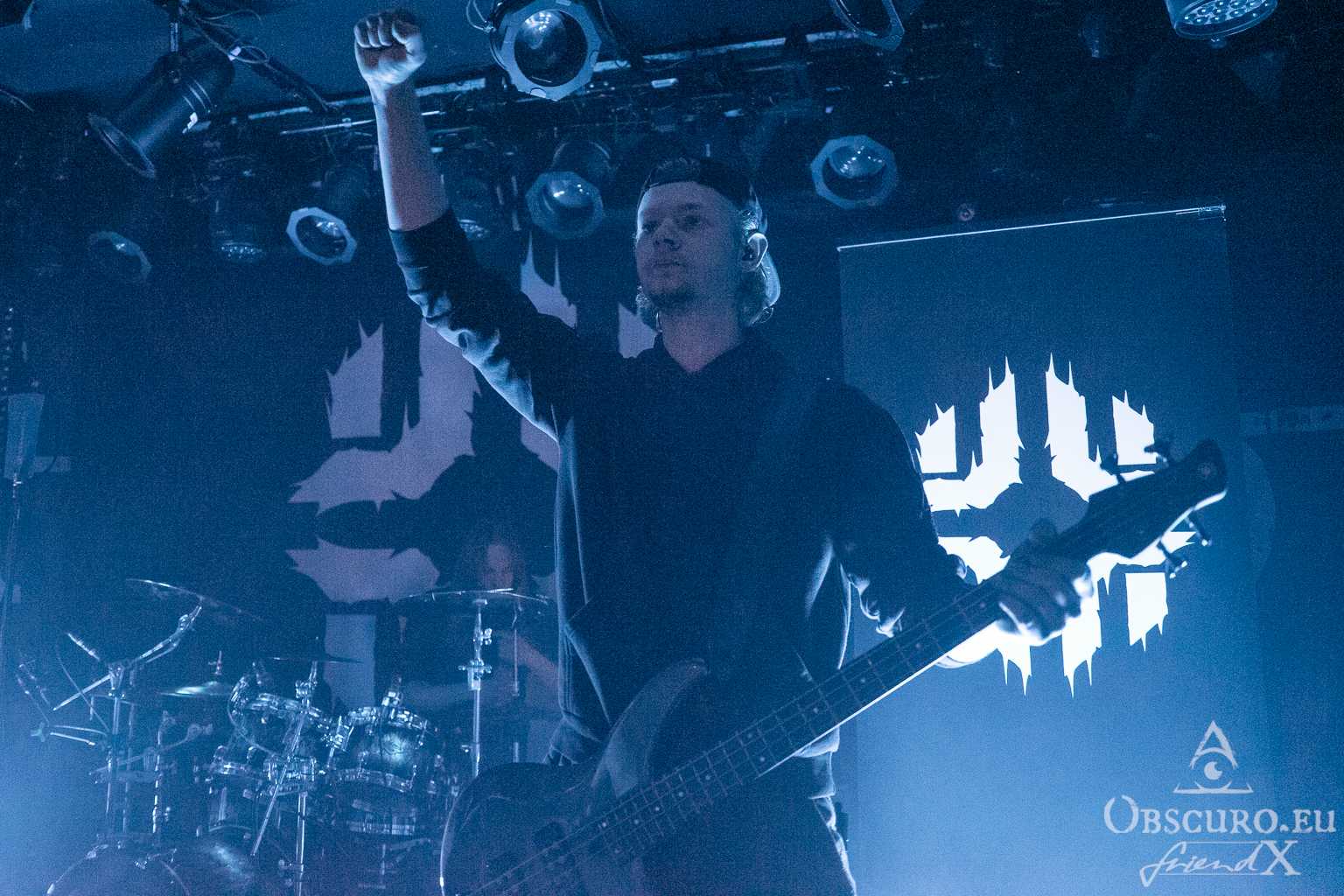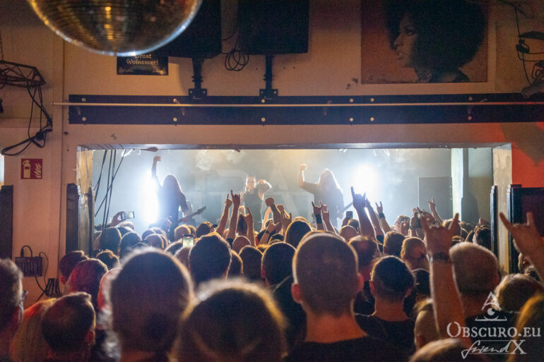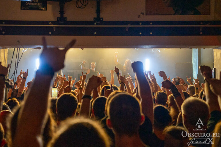 I loved that the venue was sold out — that means around 350 people squeezed in! It was airtight in the middle, while the front of the stage was reserved for serious mosh pits and headbanging — it was hot and steamy! There was a little more space next to the bar at the back, but of course your view was quite limited. The sound and lighting could have been better; it was very loud, more of a dull rumble than a clear, nuanced sound. Both support bands lacked a good light show. Maybe give them two more headlights next time – they deserve it!