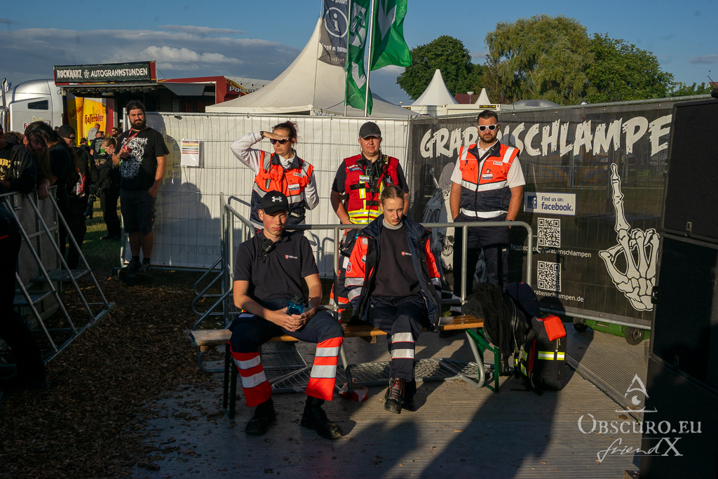 Keep in mind that most of the volunteers are doing their job during the Rockharz festival for free or they took time off from their regular nine to five jobs. Be kind to them, they are metalheads like us and share the same passion. I will never forget the two policemen who queued up for the merch like everyone else “because we are metalheads like you”. These guys are just the best and deserve all the respect. They are there for you when you need them, no matter who you are, where you come from, what your problem is. They will help you solve it.