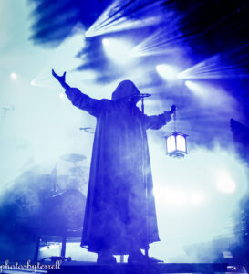Lead singer Johannes Eckerström held up a lighted lantern. As the platform moved closer to the front of the stage, lights from the back of the stage lit up. The closer they got, the more lights lit up. Reaching the front of the stage, each member stepped off and took their place while Johannes stayed on the platform. Opening the set with, “Silence in the Age of Apes” the back of the stage lit up with spot lights all across the back of the stage into the heavy fog.