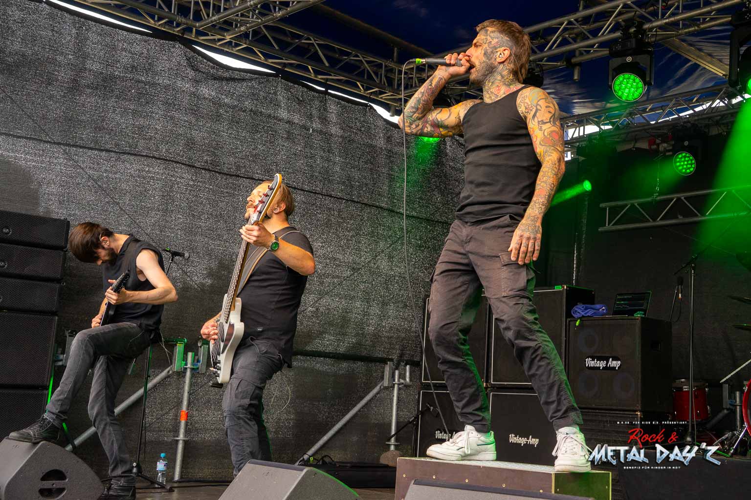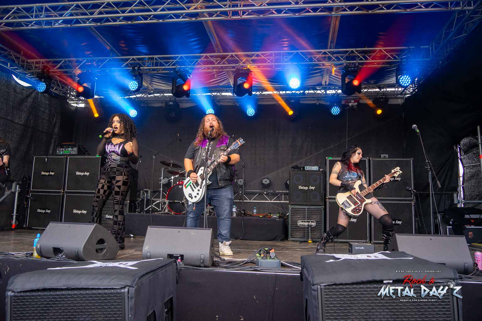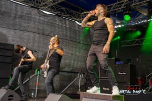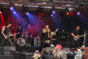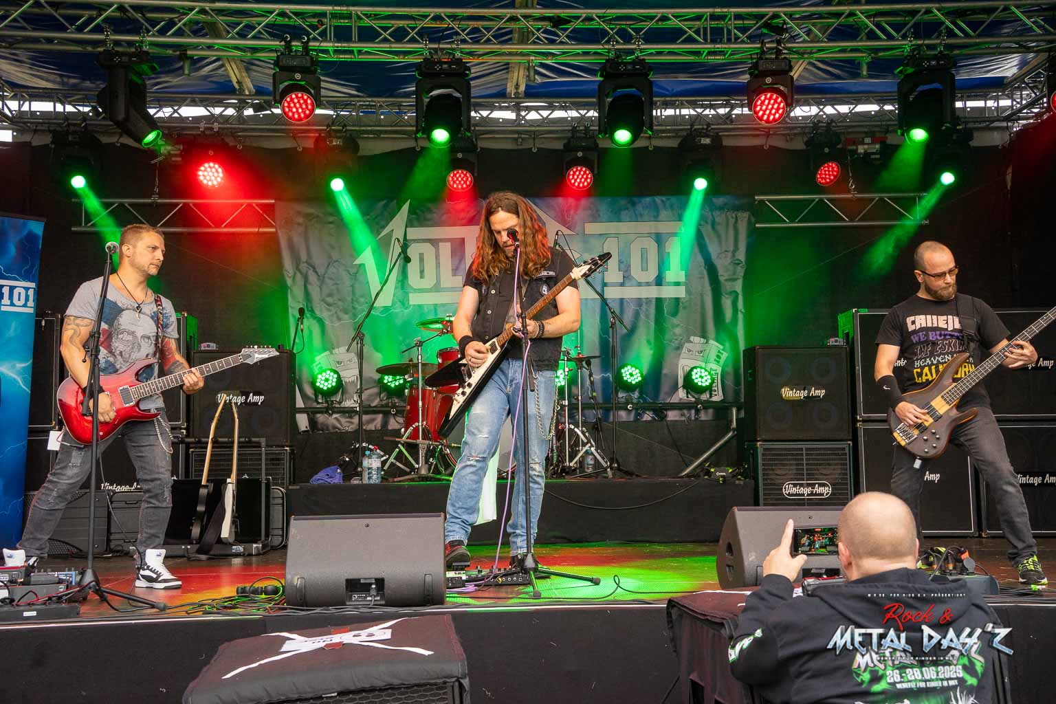 Um 13:40 ist es dann soweit, pünktlich steigen Voltage 101 die Treppe zur Bühne hoch und legen fulminant los. Ihr schnörkelloser, gradliniger Musikstil in bester Metaltradition lässt aufhorchen und treibt den einen oder anderen Zuhörer auf dem Camp Ground dann letztendlich doch zu so früher Stunde aufs Infield.
