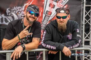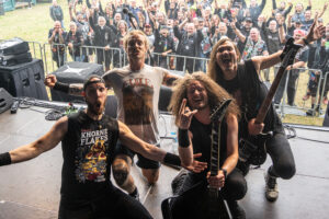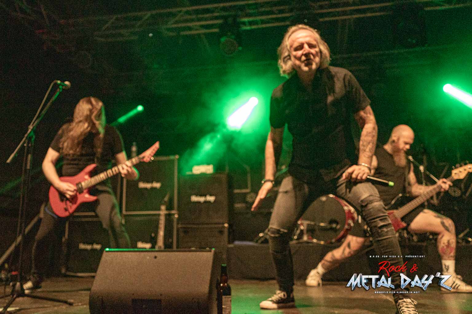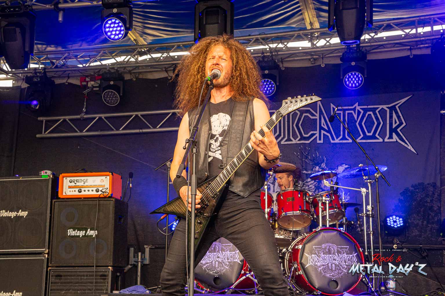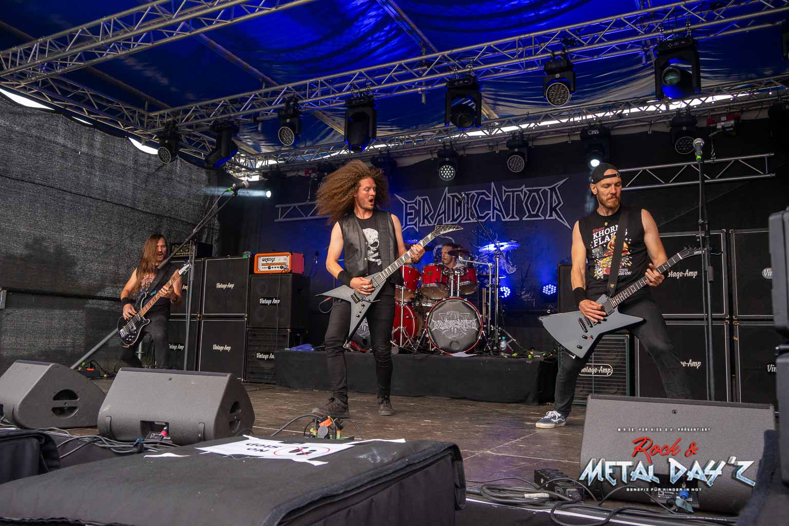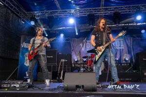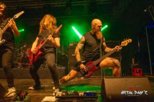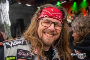 Etwas „ruhiger“ und weniger hektisch wird es danach mit Thrash-Legende Eradicator. Optisch besonders auffällig ist natürlich die Haarpracht von Sänger und Gitarrist Sebastian Stöber. In 21 Jahren Bandgeschichte haben die vier Thrasher nichts verlernt und geben Vollgas von der ersten bis zur letzten Minute. Darüber hinaus zeigen die Jungs, eigentlich ja trotz des noch jungen Alters schon Veteranen, sich später als sehr publikumsnah und mischen sich einfach unter das Publikum. So ist das halt, wenn man seine Band im Alter von um die 15 Jahre gründet…