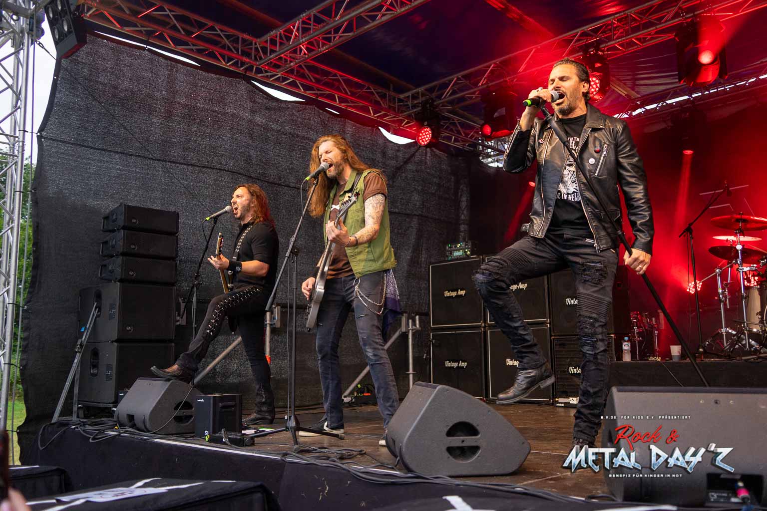Mit Darkness, es ist mittlerweile wirklich dunkel, wird es dann wieder metallisch. Die Mannen um Lee Weinberg brillieren mit feinsten Thrashmetal zu später Stunde. Mit ebenfalls über 40 Jahren auf dem Buckel spielen sie auf wie junge Götter denen man eine Gitarre in die Hand gegeben und alle Knöpfe auf zehn gedreht hat. Bei der Gelegenheit, am 27. September spielen sie in Essen ihre offizielle 40jährige Jubiläumsshow, merkt euch den Termin mal vor, es rentiert sich.