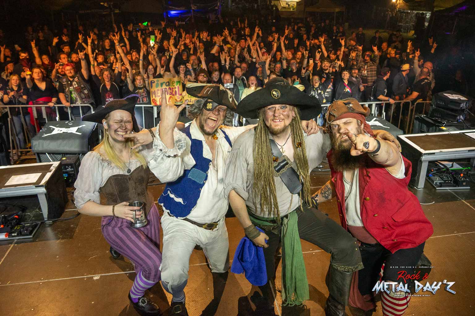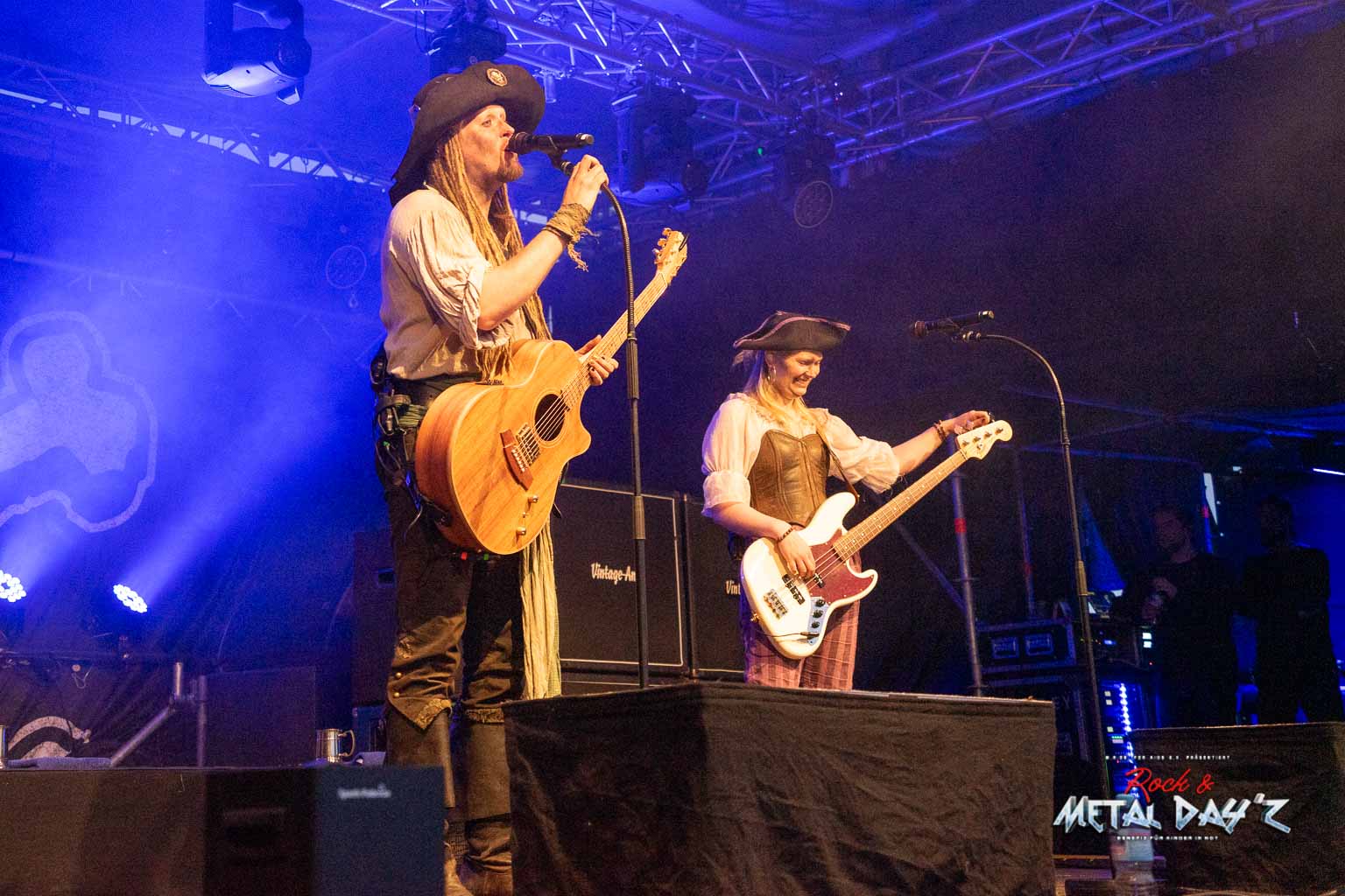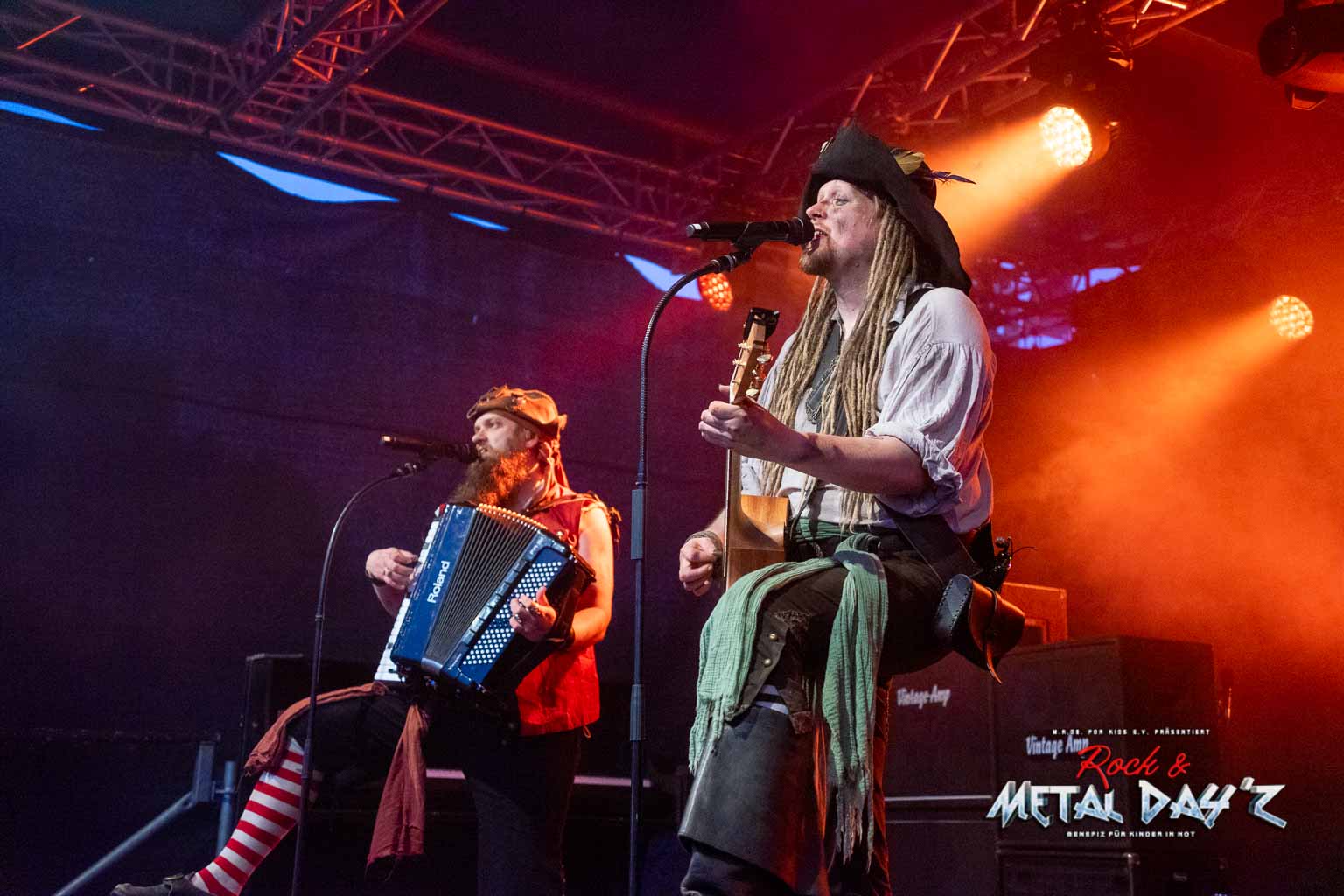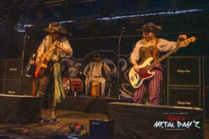 Nun ist es endlich soweit, es wird etwas karibisch. Zwar handelt es sich nicht um Jamaica, sondern Osnabrück, aber Mr. Hurley und die Pulveraffen verwandeln die Bühne und das Festivalgelände in Tortuga und die Elemente der sieben Piratenweltmeere. Professionell und routiniert spielen sie ihr gewohnt Spass machendes Set, angepasst natürlich an unser kleines Festival. Immerhin befindet sich die Band mit ihrer Crew gerade auf Festivaltour. Sie ist also eingespielt und funktioniert präzise wie ein Uhrwerk. Jede Bewegung, jede Geste sitzt perfekt, ohne eine gewisse Spontanität zu vernachlässigen.