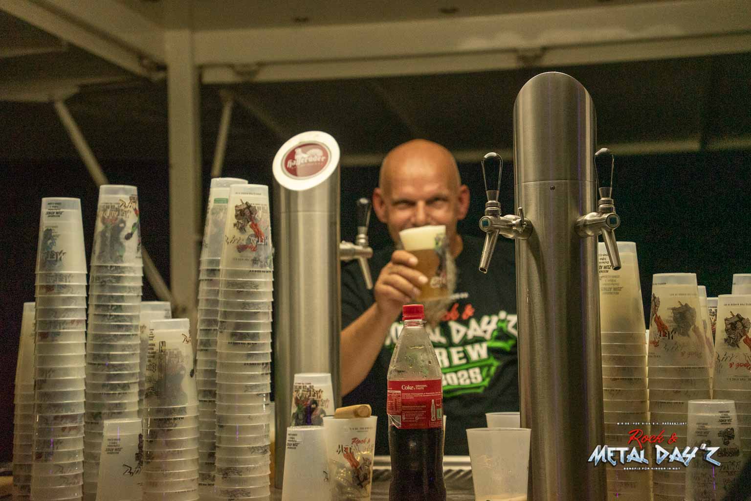 Ein langer Tag ist vorbei, nicht für alle, noch stehen die Gäste an Bier- und Whiskystand an um einen Absacker oder ein Weggetränk ins Camp zu geniessen. Danach folgt für uns noch ein kurzer Abstecher in das Backstagezelt, ein verdientes Feierabendbier genossen und kurz den ereignisreichen Tag resümiert und dann „Zähne putzen, pullern, ab ins Bett“ 😉.