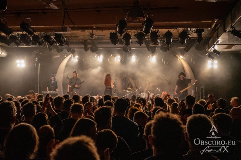 Doors open one hour before the show, which gives the audience sufficient time to have a look at the merch, meet old and new faces, have a sip on a drink and fill the venue to its limit. Then it is about time for the concert to begin. Starting with Marc, one after the other enters the stage during the intro until finally Fabienne joins the four of them for tonight’s show of Illumishade’s first full tour.