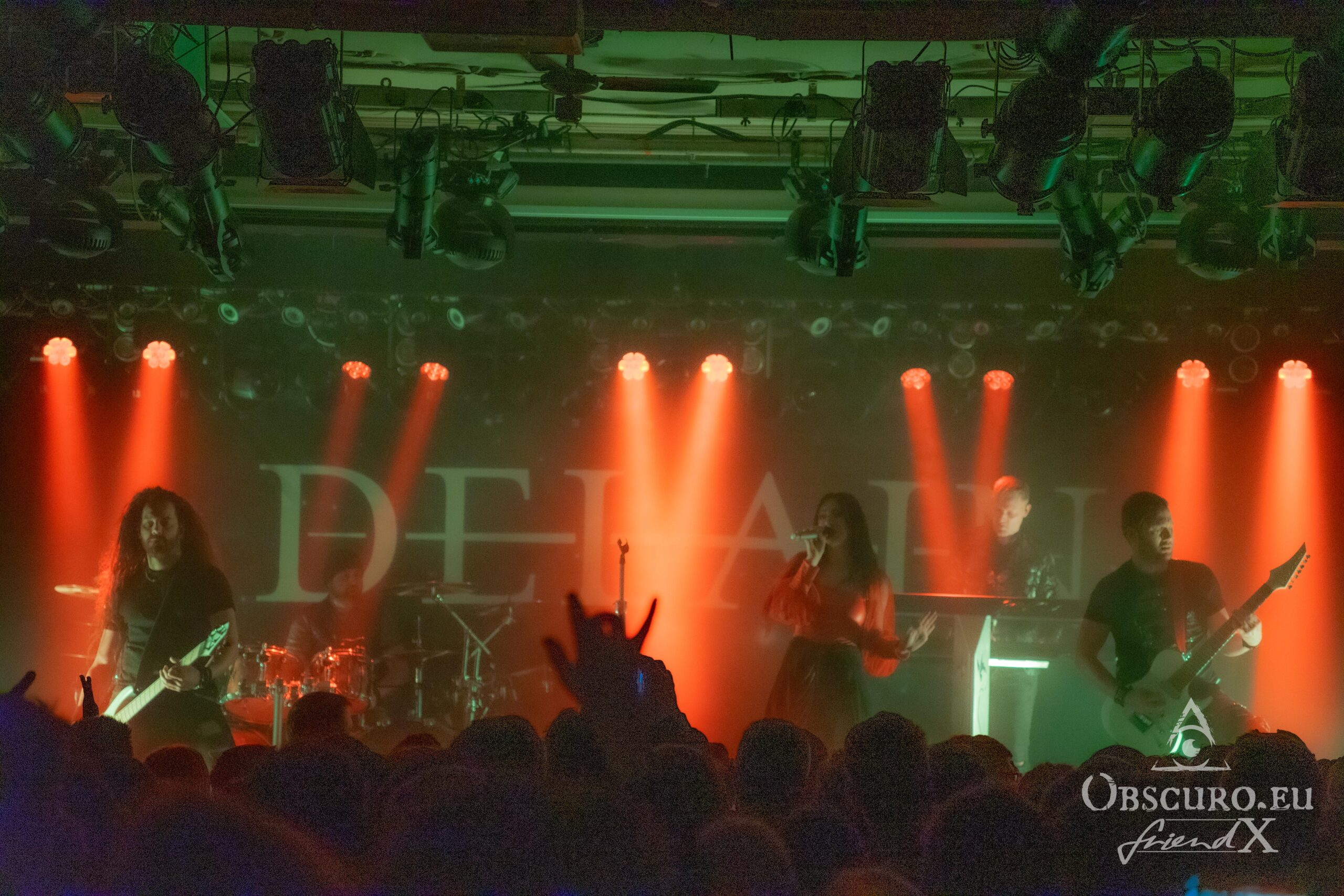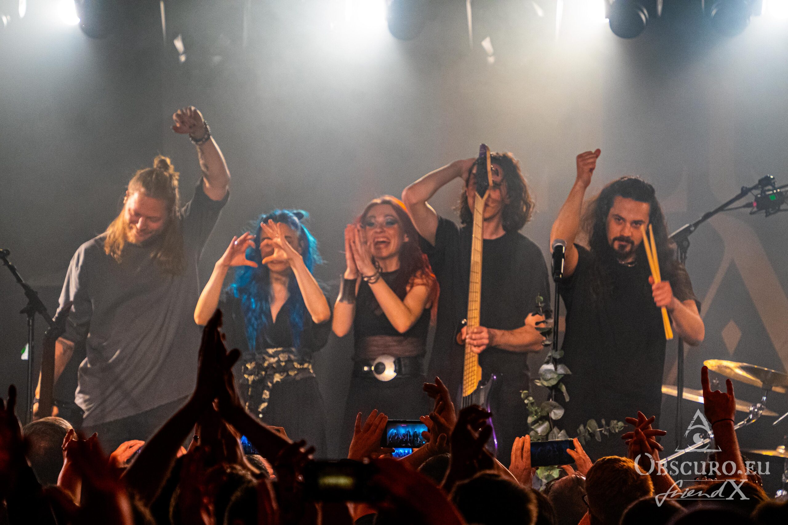 Doors open one hour before the show, which gives the audience sufficient time to have a look at the merch, meet old and new faces, have a sip on a drink and fill the venue to its limit. Then it is about time for the concert to begin. Starting with Marc, one after the other enters the stage during the intro until finally Fabienne joins the four of them for tonight’s show of Illumishade’s first full tour.