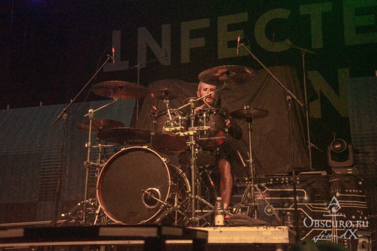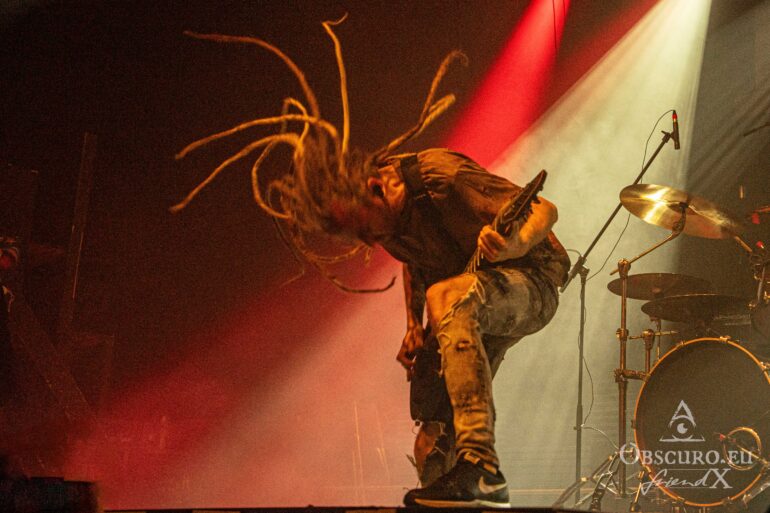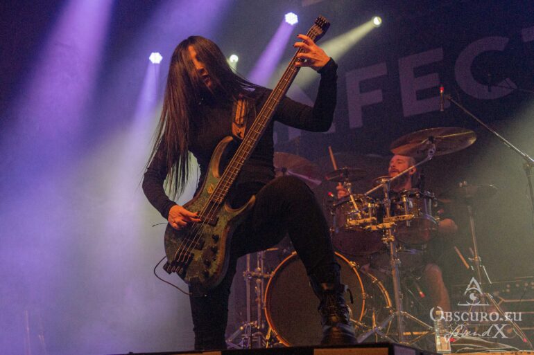 Vidick doesn’t stand back a lot. I wonder, how he manages to dance around like crazy with his dreadlocks and still hits the notes on his guitar. Alice on bass is much calmer and it is pure eye pleasure watching her fingers rushing over the fretboard. The real backbone is Eugene on drums with his precise drumming style, he steers the band from the back while the three front musicians command the audience. Sadly, Infected Rain’s set is “just” barely 45 minutes long. I can only recommend looking out for their next headline tour and a full set!