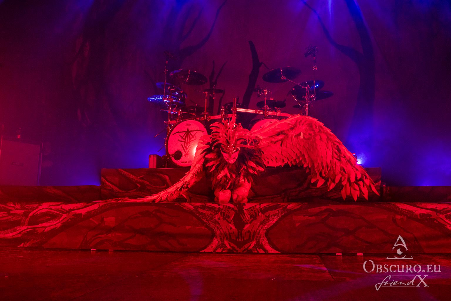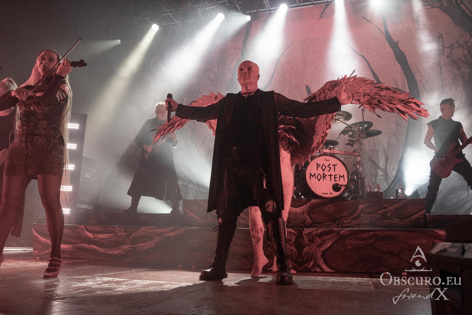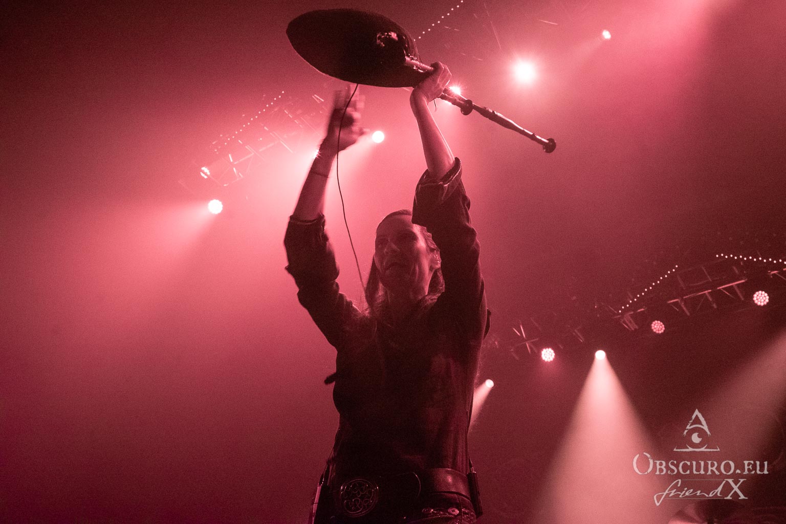 Then it is time for the band that has hosted Eisheilige Nacht since 2009. A fantasy bird, perhaps inspired by the phoenix, dances in front of the drum kit until the band members join the stage one by one. We are, of course, more than happy to welcome Eric Fish and Subway to Sally to the stage. They are the longest-running band on the tour, having been active since 1992 — although the original members have known each other for 12 years longer than that. Subway to Sally is the heaviest band on the tour, although they are still far from bands like Metallica or Slayer. Medieval instruments take centre stage for the next 90 minutes of the finest German folk metal. The show is great and entertaining; everyone in the audience can sense the fun on stage and the excitement of being back at Z7. For the finale, all three previous bands are invited to join Subway to Sally on stage, creating one big family.