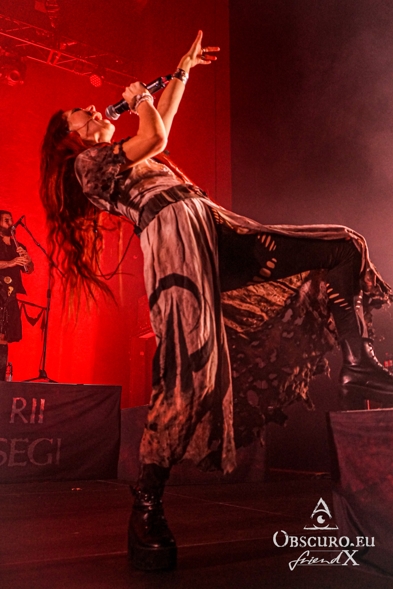 I can’t remember the exact time when the first headliner Eluveitie enters the stage, probably around 20:00. I do remember, it is the first of two complete set-up changes so it took longer than before. Nine musicians with all their selection of instruments need space… Then we are ready for the first of the two headliners. It is always somewhat risky to open a show with a new song but not this time. Eluveitie open with their new single “Exile Of Gods” sung by Fabienne. I must admit, an opener to my taste. It is unbelievable how powerful Fabienne’s vocals are, how dainty she is. In many ways she reminds me of Pat Benatar in the early 80ies though the music is completely different. The second song is much rougher but – just as good – Chrigel takes over for “Nil” and – more on the melodic side – “Deathwalker”.