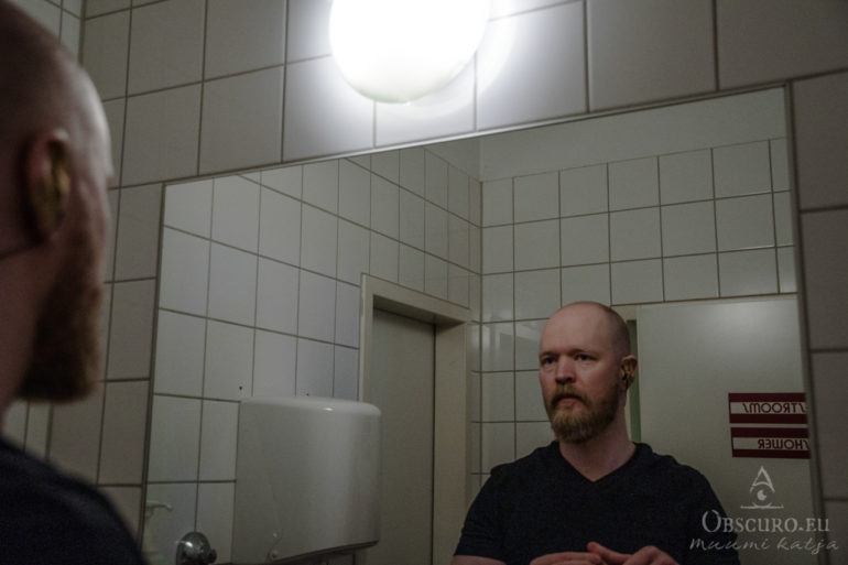 Tape straps secure the mic wires on backs and necks while Saku proudly presents his new skirt-like leather-and-chains piece. Once he stepped into it and closed the zipper in front, he takes of his pants. “Can you help me with that?” he asks me for I am the only one not busy getting dressed for the show. I look at him with a large question mark lingering mid-air right above my head. “The bag for my micro receiver got stuck with chains yesterday. Could you perhaps untie it from the chains and fix it up here?” he says pointing the straps for a belt on the upper end. We find a sufficient position. “Well, perhaps you could widen the chains up here, too. It’s too narrow to step wider to the sides and stand comfy.” – “Sure.” I open the middle snap hook to switch it to the next wider chain link. “One or two?” – “Well, one will do, wouldn’t to show too much.”