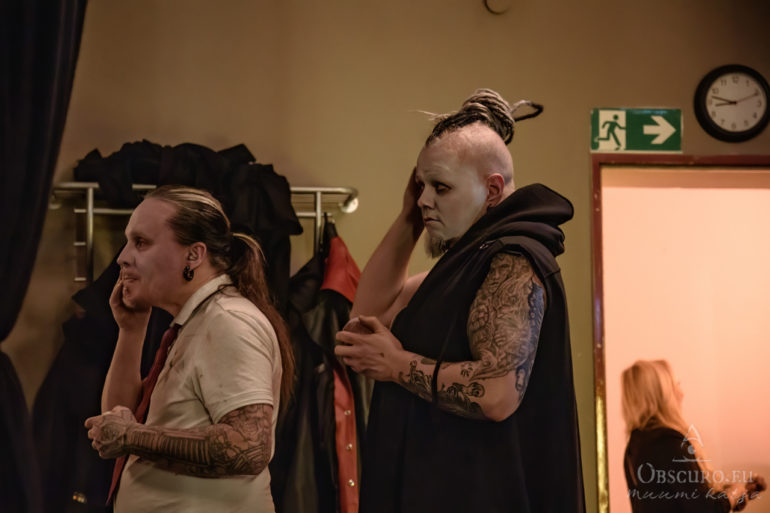 Long have I hoped to one day get my go to experience the mysterious transformation into Turmion Kätilöt’s stage creatures. As Saku is returning from the nightliner with an additional suitcase I expect the magic to be about to happen. But the metaphosis essentially needs some energy that cannot be extracted from a couple of sandwhiches and apples. Something more substantial is needed which arrives in flat cardboard boxes and foil bowls. Soon the seductive smell of melted cheese fills the air pulling the musicians as much as their helping hands together in the backstage, save for BRHG and Janne. The other Janne. The one at the light desk. Obviously that one has a tendency to miss the dinner.
