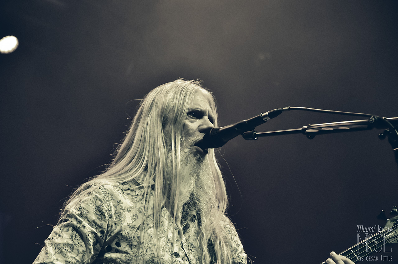 Less known perhaps, Marko has also participated in some cover projects, such as Sappattivuosi. Thus it is not surprising that he adds some cover songs to his setlist. The first still might come as a bit of a surprise. Only slowly, like a warm and very gentle summer rain, we begin to recognise David Bowie’s “Starman”. A perfect choice, I am tempted to say as it demands the instrumentalists and voice we see on stage. I see sparkling eyes in the crowd, many of them. 1970’s vibes linger in the air, the demanding tunes of Bowie’s song are taken easily, filled with all the power of Marko’s voice, carried by the Vili’s and Tuomas’ incredible performance. A worthy cover. Undoubtedly. Another worthy cover marks the beginning of the encore: Black Sabbath’s anti-war anthem “War Pigs”. He makes it his message to those in power to make the world a better place but are engaged in dirty wars!