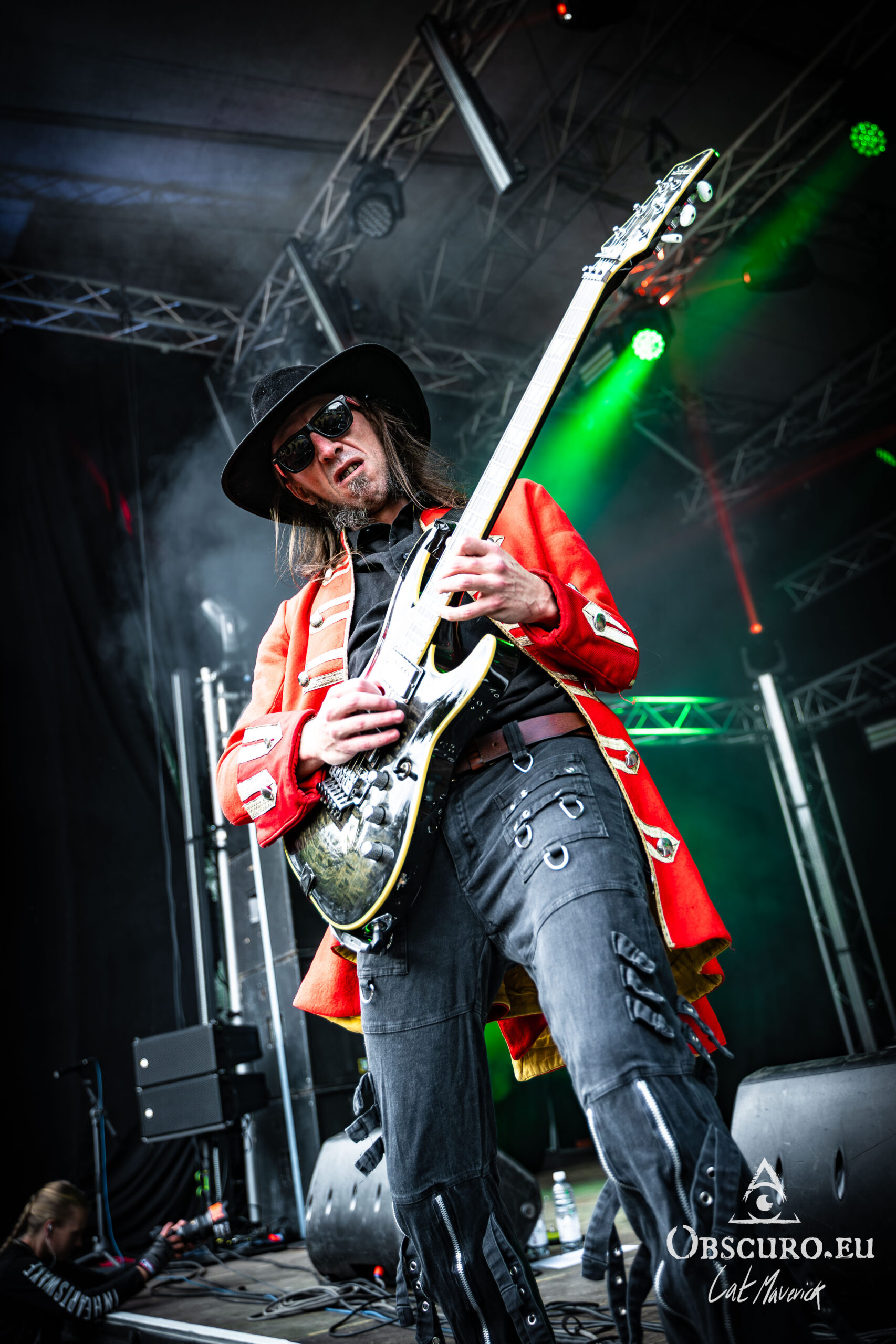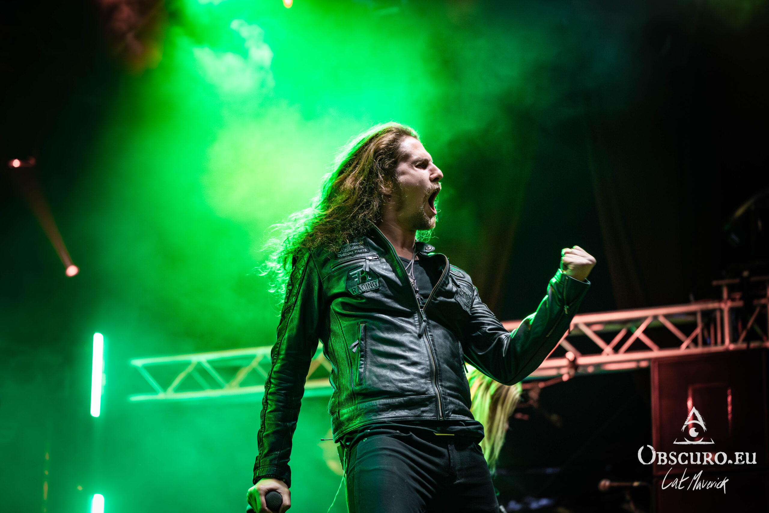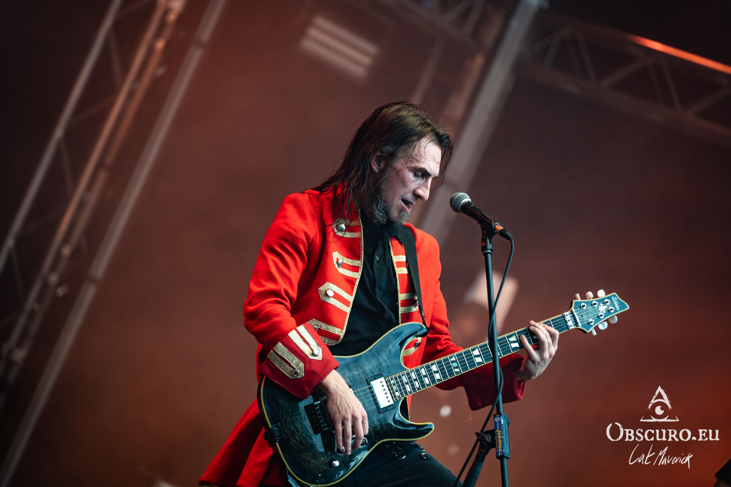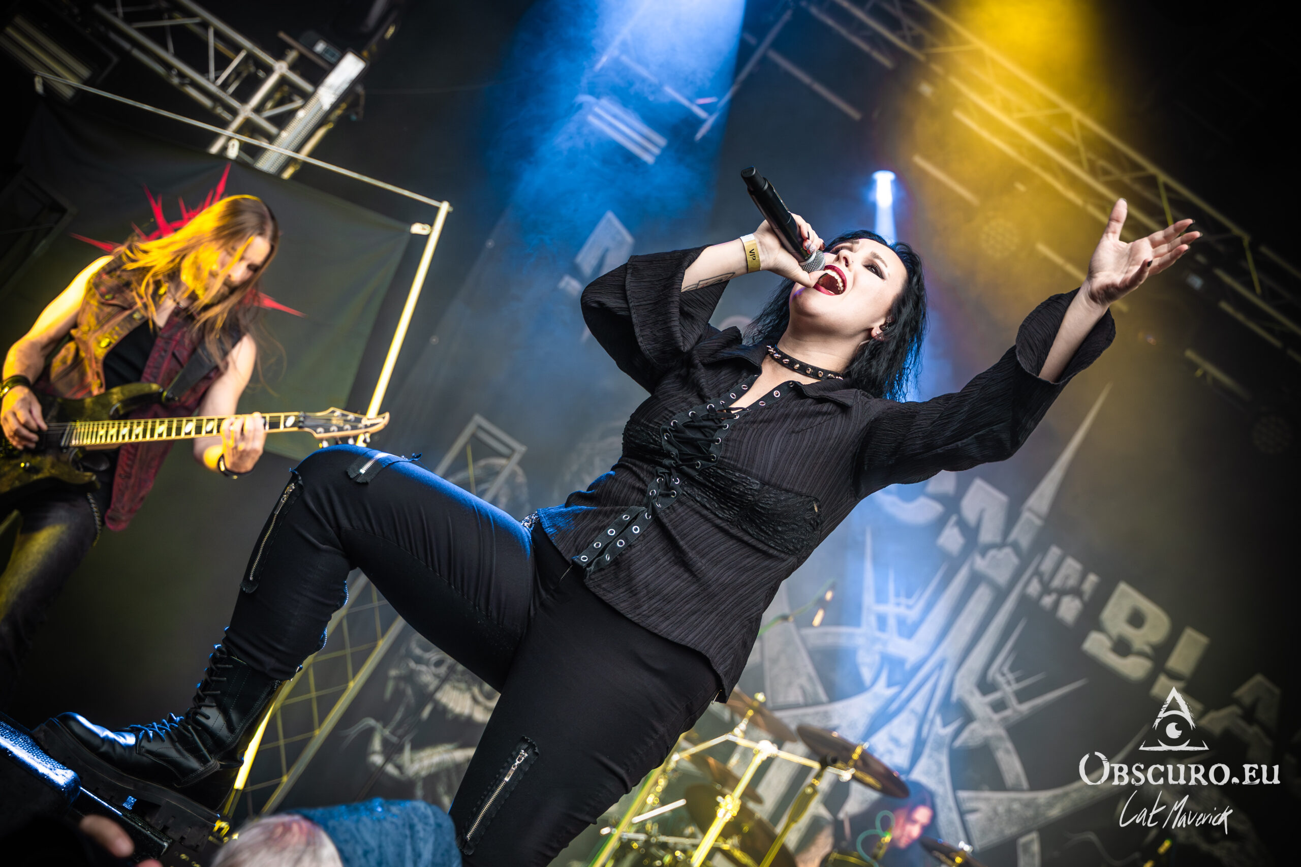The first proper festival day starts with Darker Half. The power metal band from Sydney, Australia, delivers a great performance. Their guitarist jumps around the stage and demonstrates his flexibility with the energy of two bands. As they play, the hillside is still empty, but on the top and down in the valley in front of the stage, the crowd is already filling up to witness their energetic show.