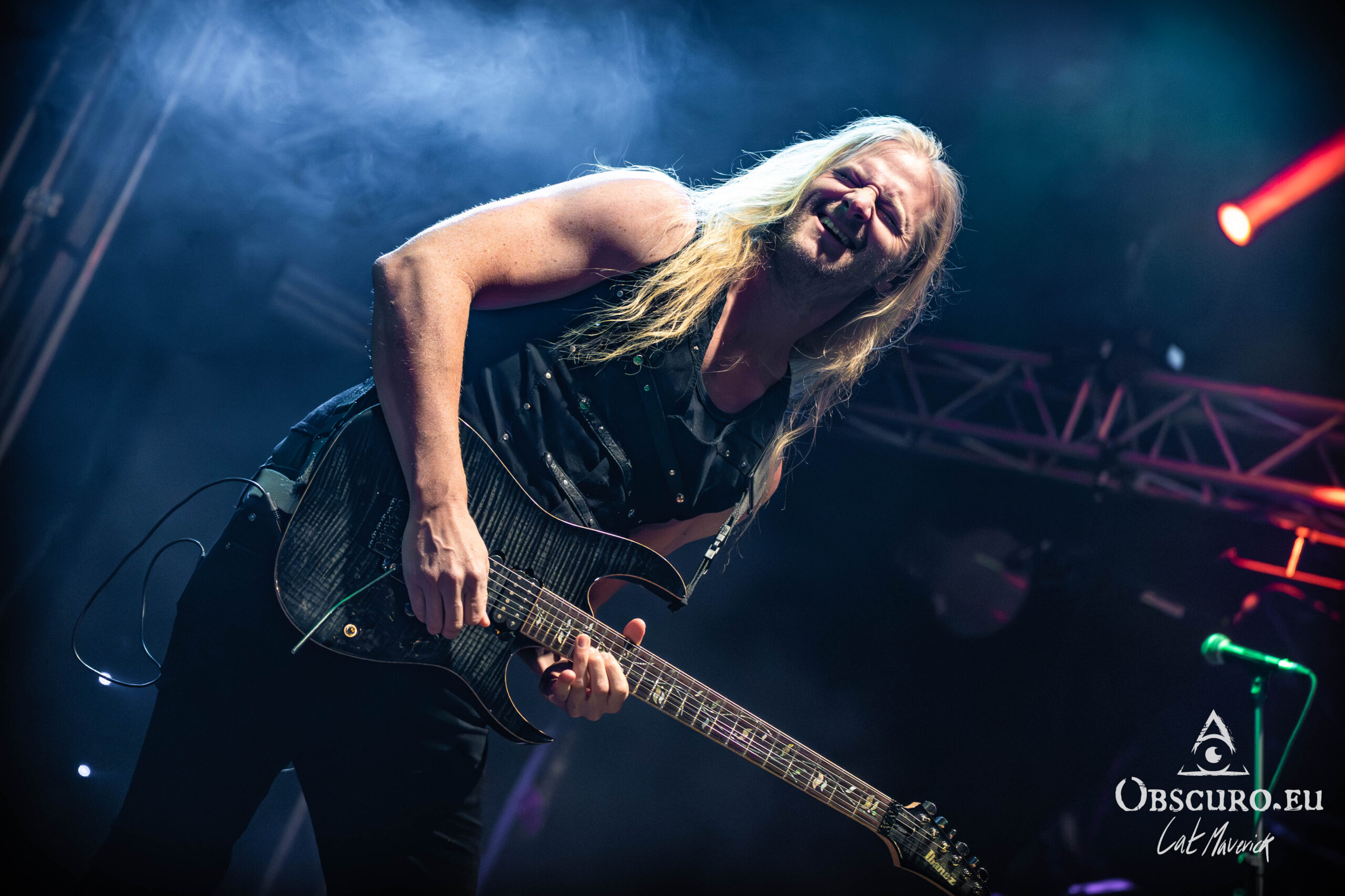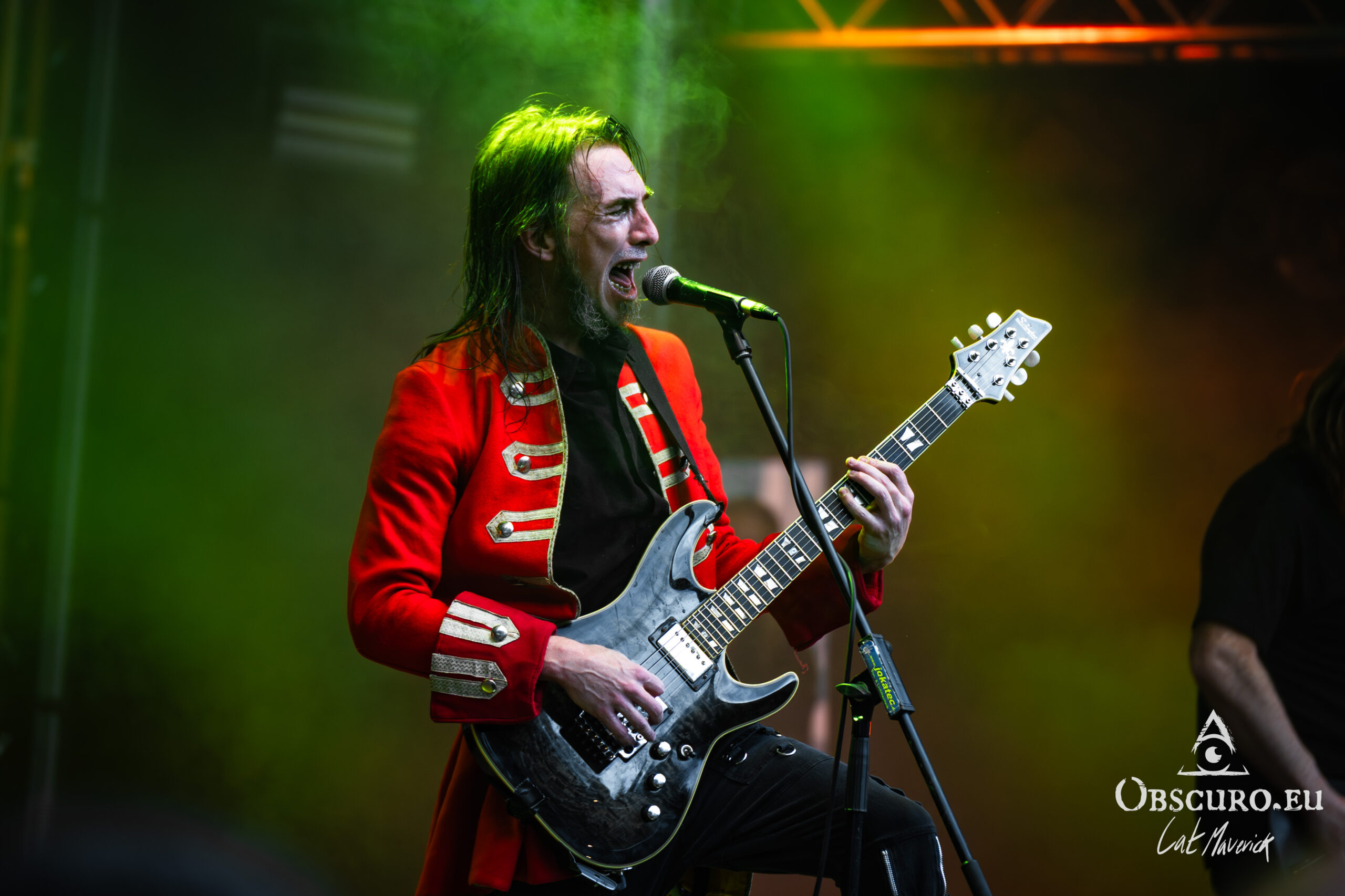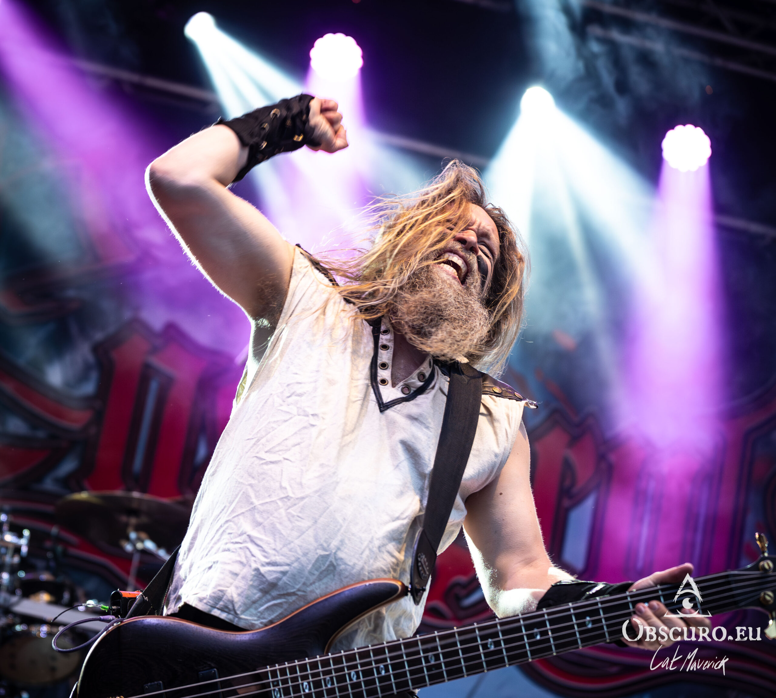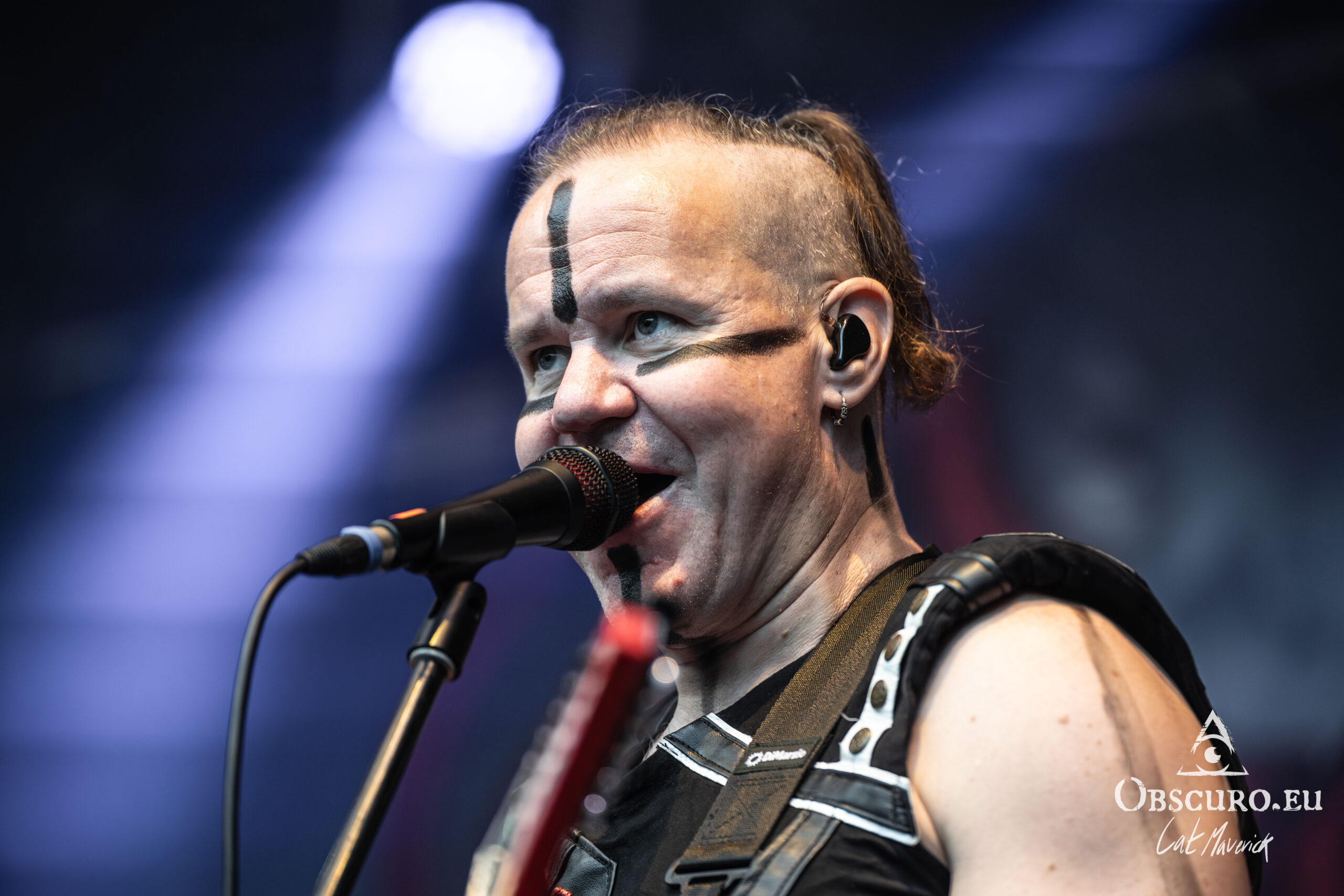 The first proper festival day starts with Darker Half. The power metal band from Sydney, Australia, delivers a great performance. Their guitarist jumps around the stage and demonstrates his flexibility with the energy of two bands. As they play, the hillside is still empty, but on the top and down in the valley in front of the stage, the crowd is already filling up to witness their energetic show.