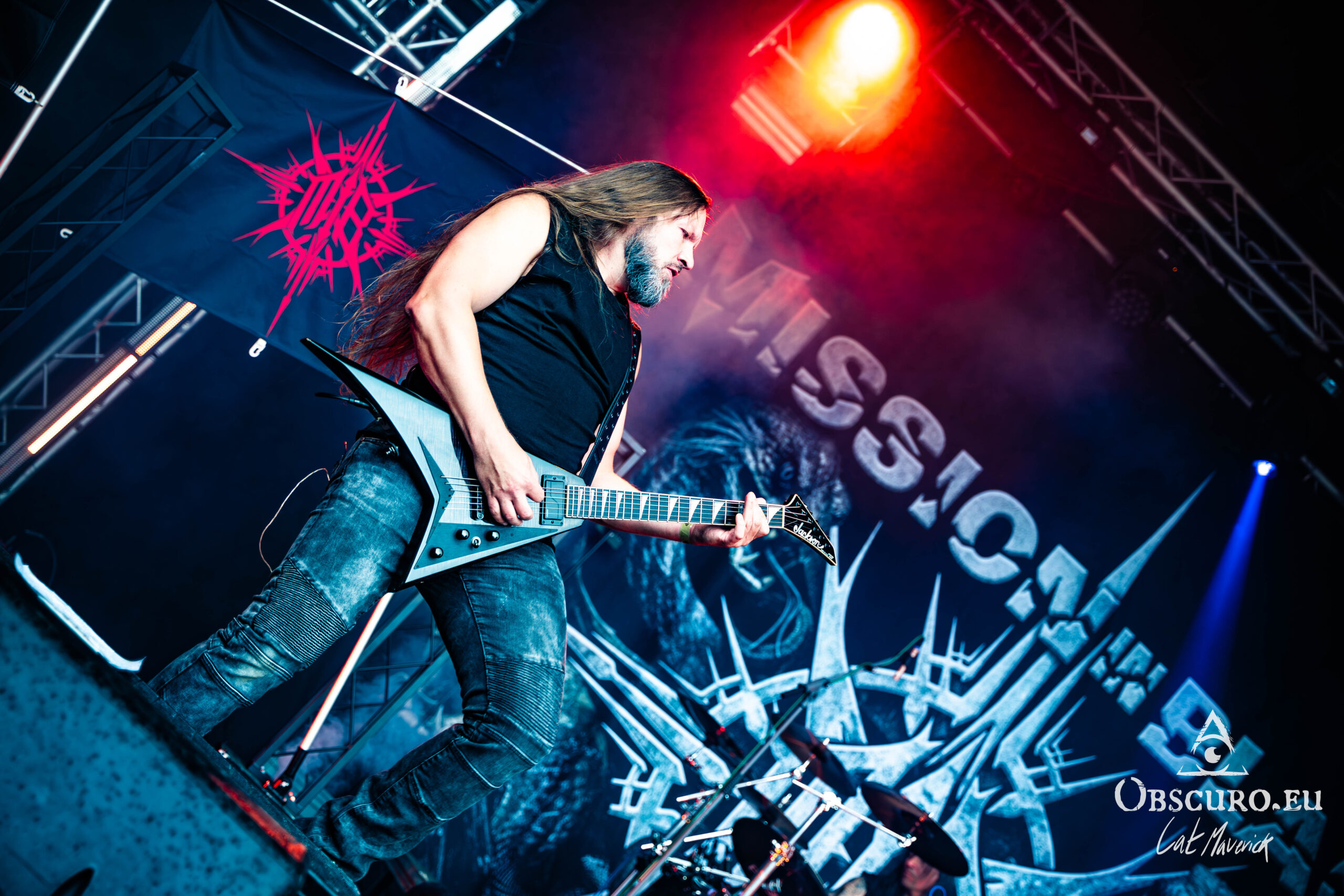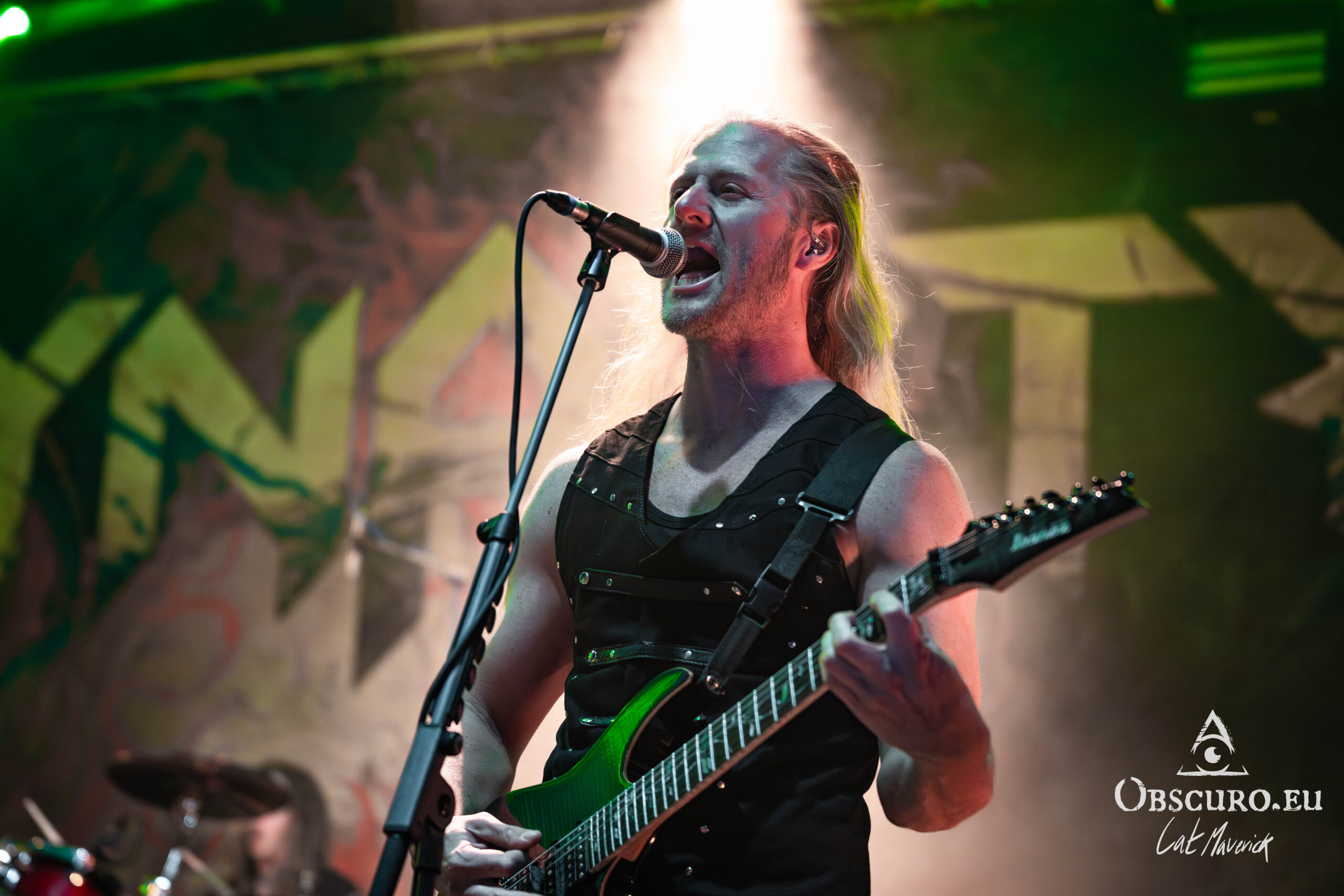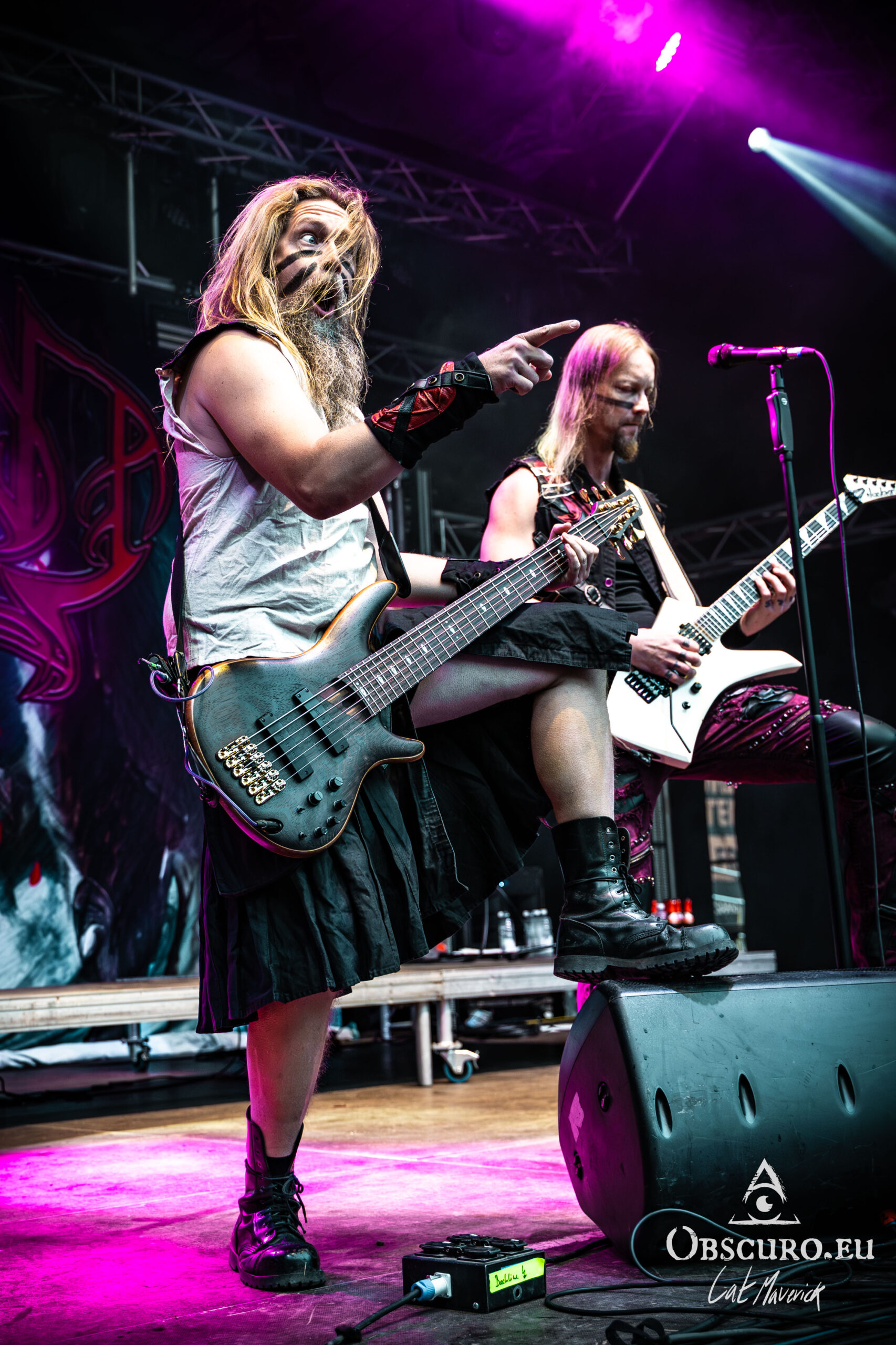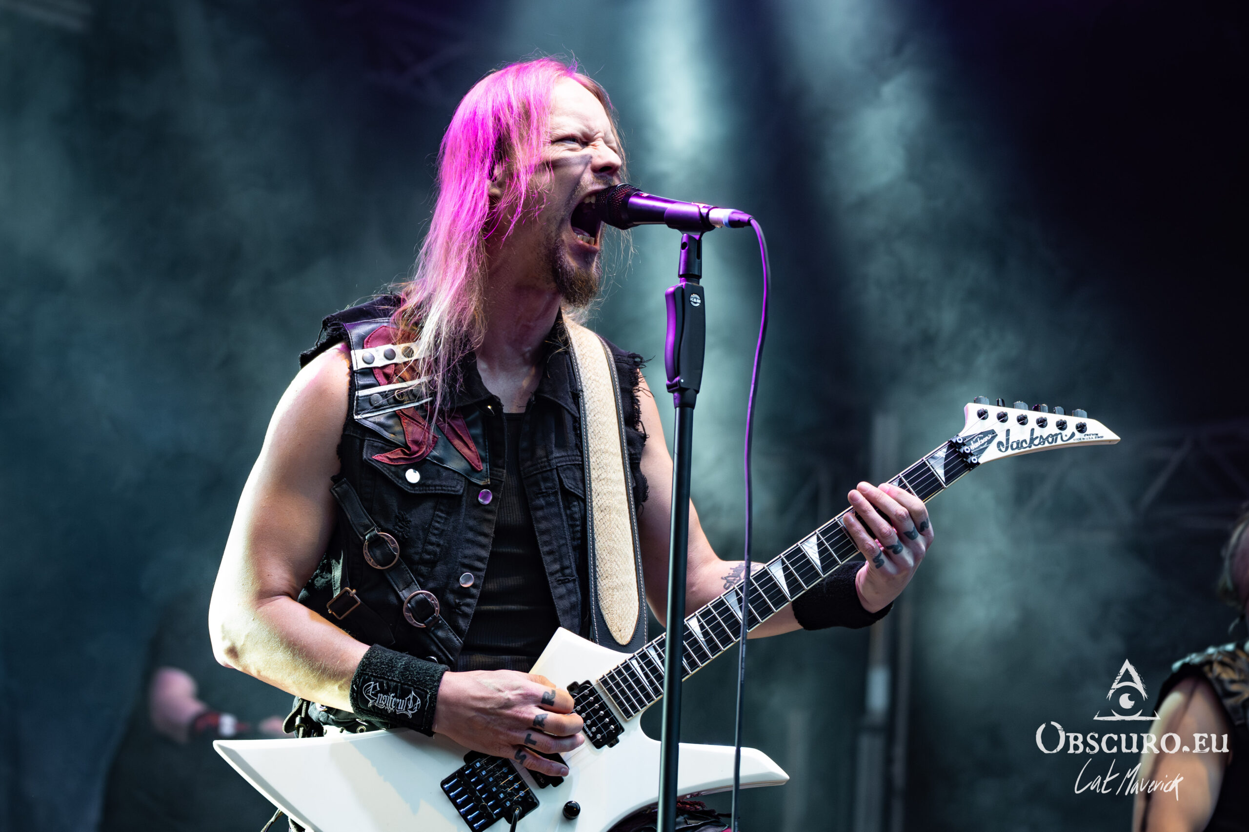 The first proper festival day starts with Darker Half. The power metal band from Sydney, Australia, delivers a great performance. Their guitarist jumps around the stage and demonstrates his flexibility with the energy of two bands. As they play, the hillside is still empty, but on the top and down in the valley in front of the stage, the crowd is already filling up to witness their energetic show.