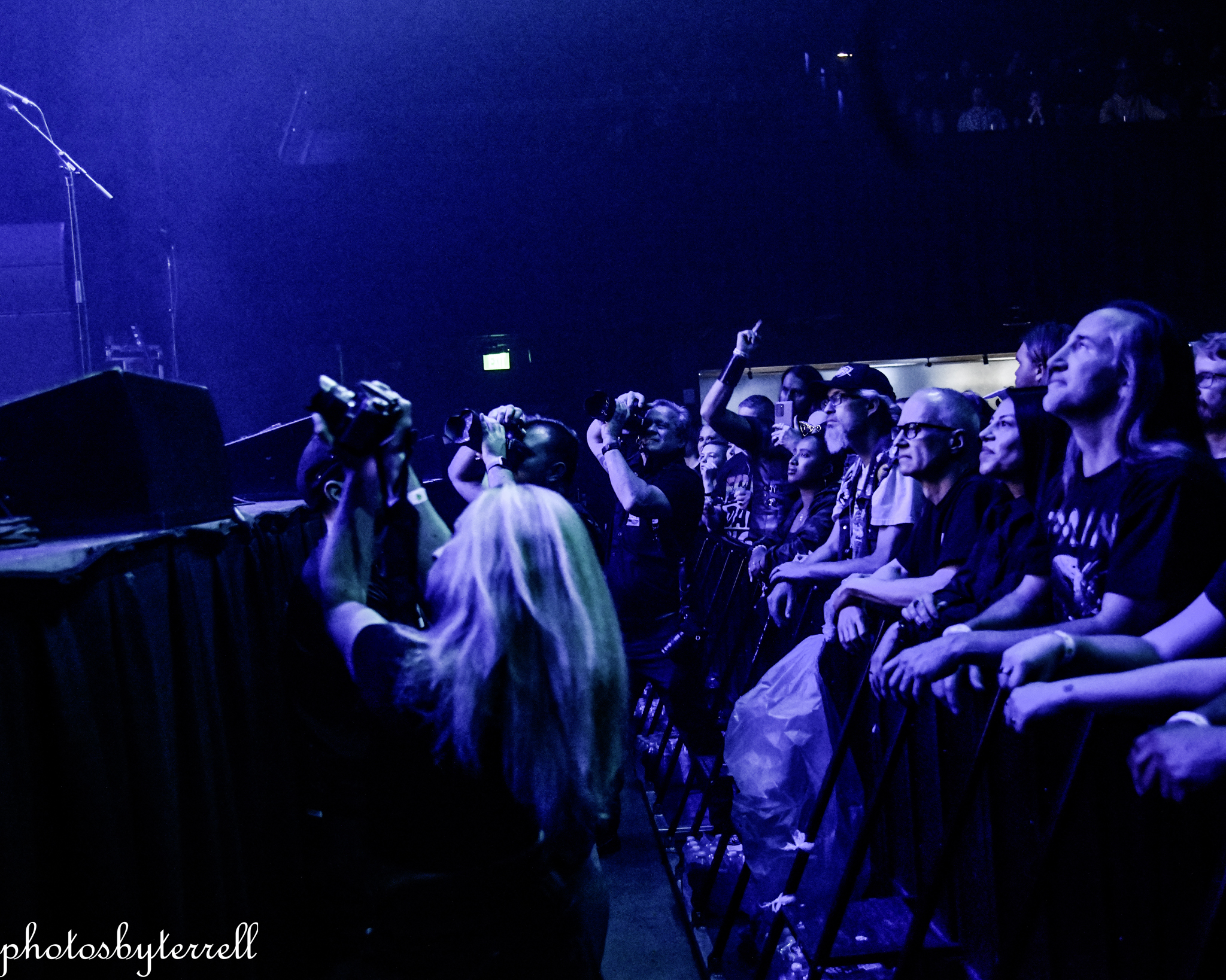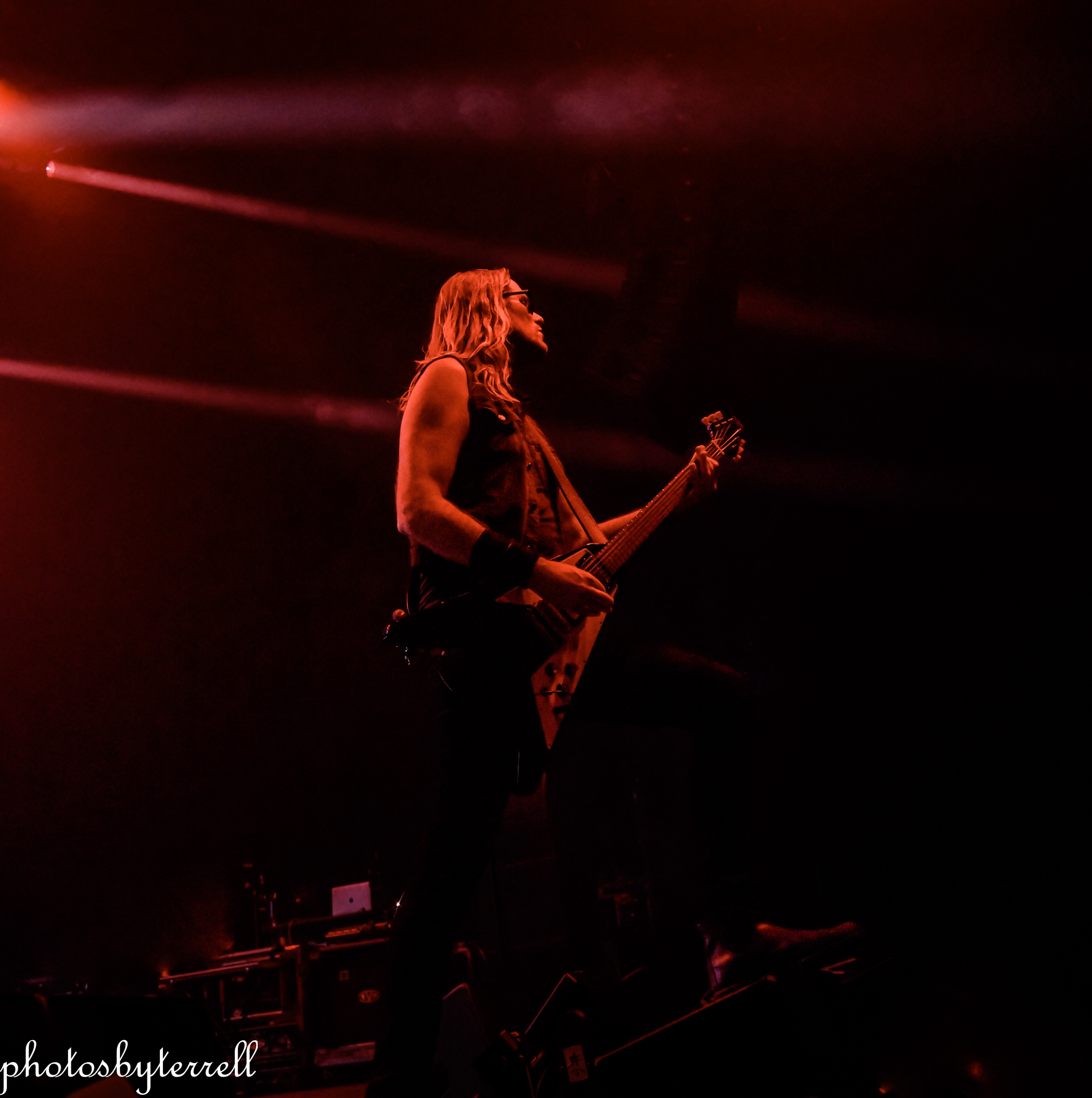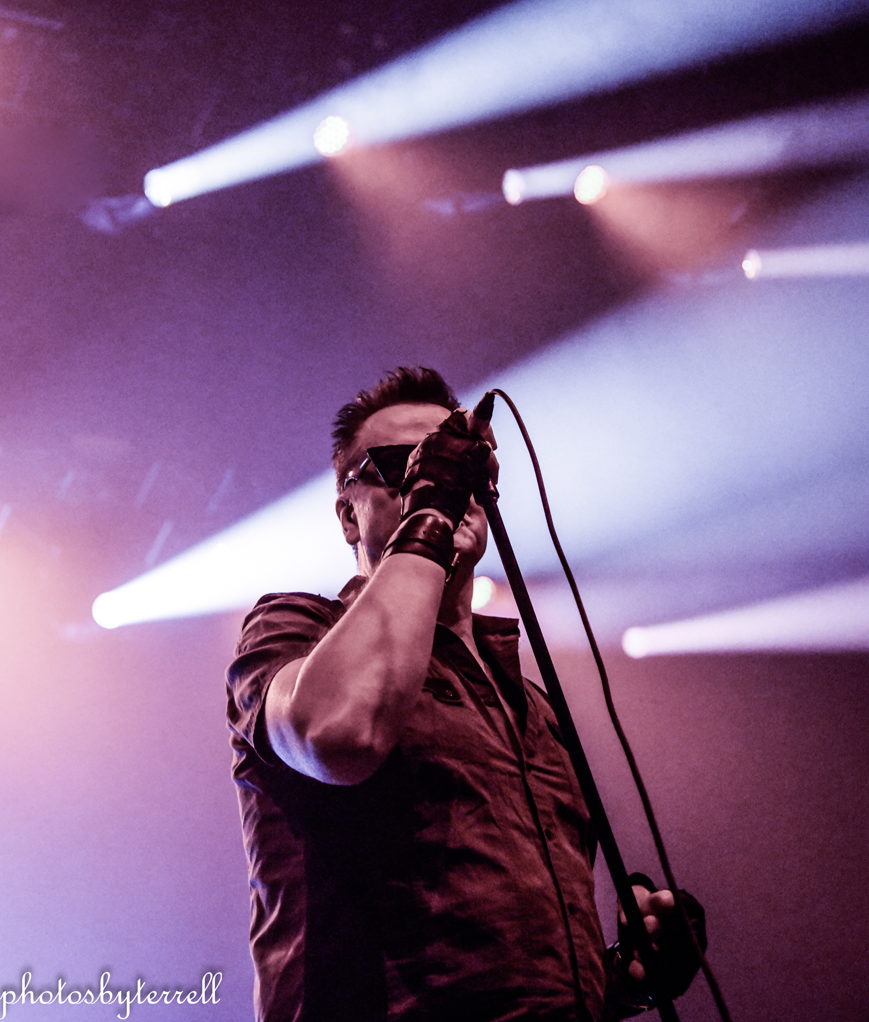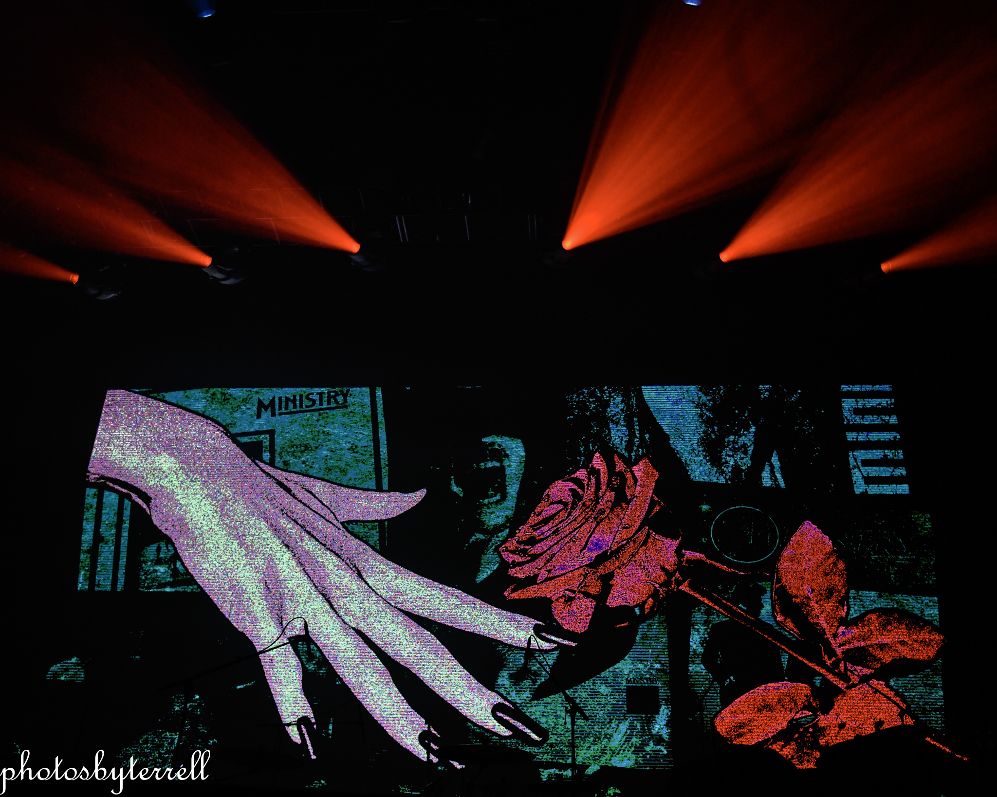 The first song set the tone for their night and the energy level in the venue was on the rise as Al moved about the stage. The music was mostly from Ministry’s early days with albums, With Sympathy from 1983 and Twitch from 1986, and their fans loved every song. As a photographer Ministry is always a fun band to photograph. Their stage presence is second to none and keeping an eye on Al and his facial expressions and those moments when he stops and poses are priceless. (see photo gallery) The stage at the Mission Ballroom is very roomy for band members to move about and with the lights dancing everywhere and the large video screen in back of the stage constantly changing colorful designs, makes for some interesting photographs.