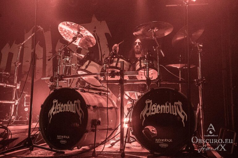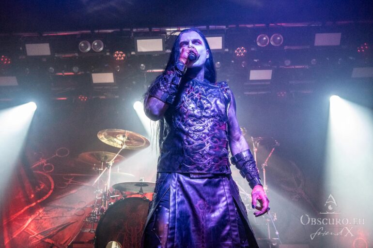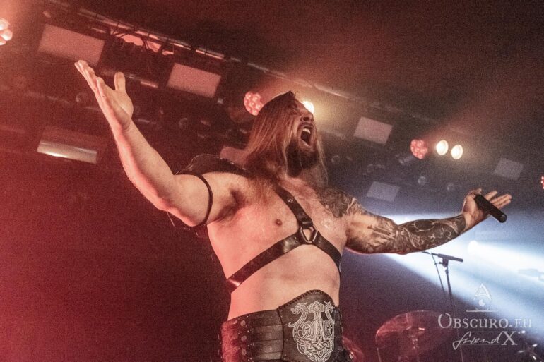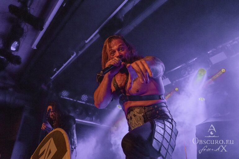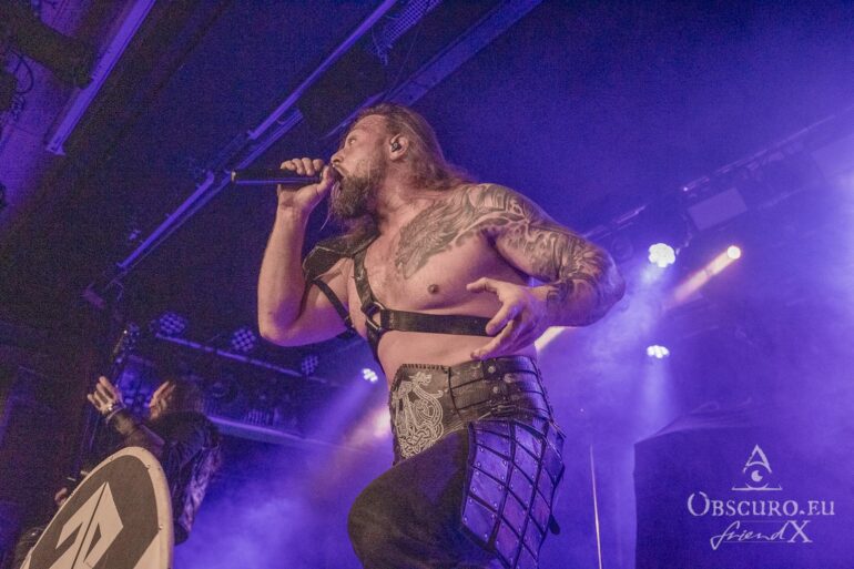At precisely 20:00, the lights dim for the first time tonight. Asenblut’s musicians enter the stage, which is protected by Asenblut‘s Viking shields that will be used later in the show. Tim ‘Tetzel’ joins his bandmates and waves his battle axe microphone. What follows is about 45 minutes of the finest pagan metal — or is it viking metal? Or teutonic metal? Or is it just Tetzel? From the outset, it’s clear that not everyone has come for Nachtblut only. The audience is eating out of his hands. There’s no doubt that Tetzel knows how to be a good entertainer and showman.
