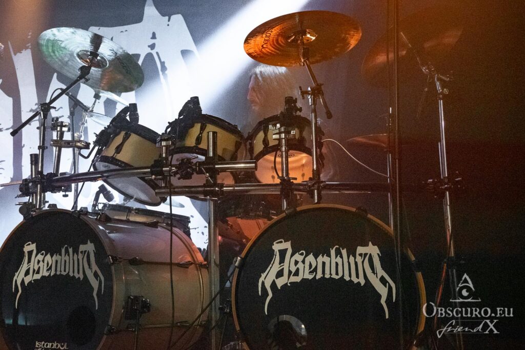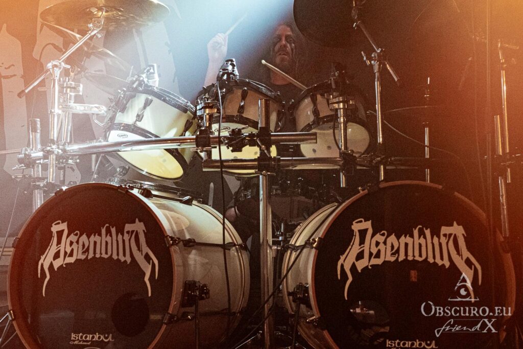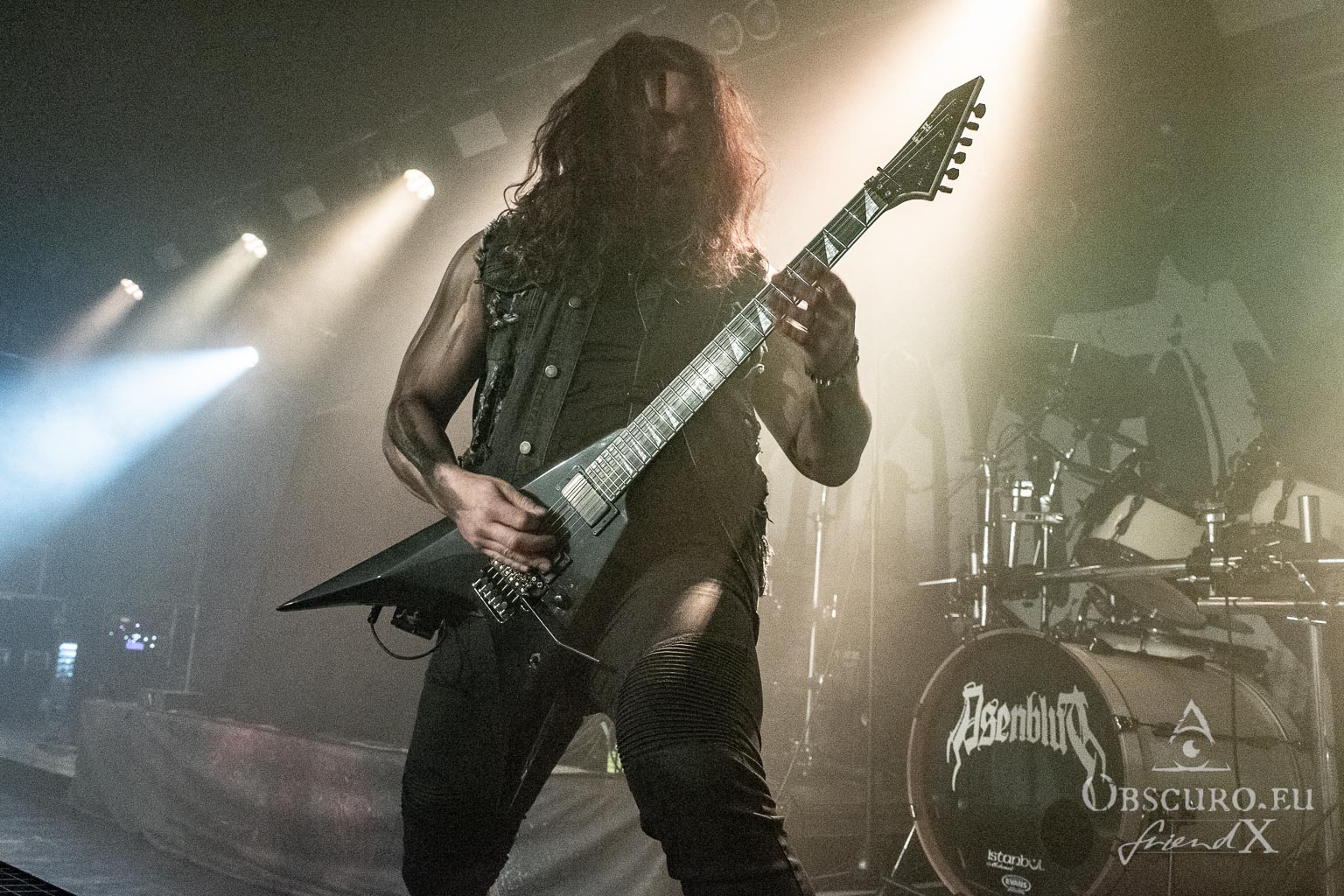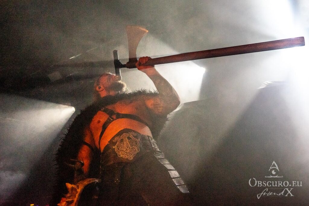At precisely 20:00, the lights dim for the first time tonight. Asenblut’s musicians enter the stage, which is protected by Asenblut‘s Viking shields that will be used later in the show. Tim ‘Tetzel’ joins his bandmates and waves his battle axe microphone. What follows is about 45 minutes of the finest pagan metal — or is it viking metal? Or teutonic metal? Or is it just Tetzel? From the outset, it’s clear that not everyone has come for Nachtblut only. The audience is eating out of his hands. There’s no doubt that Tetzel knows how to be a good entertainer and showman.