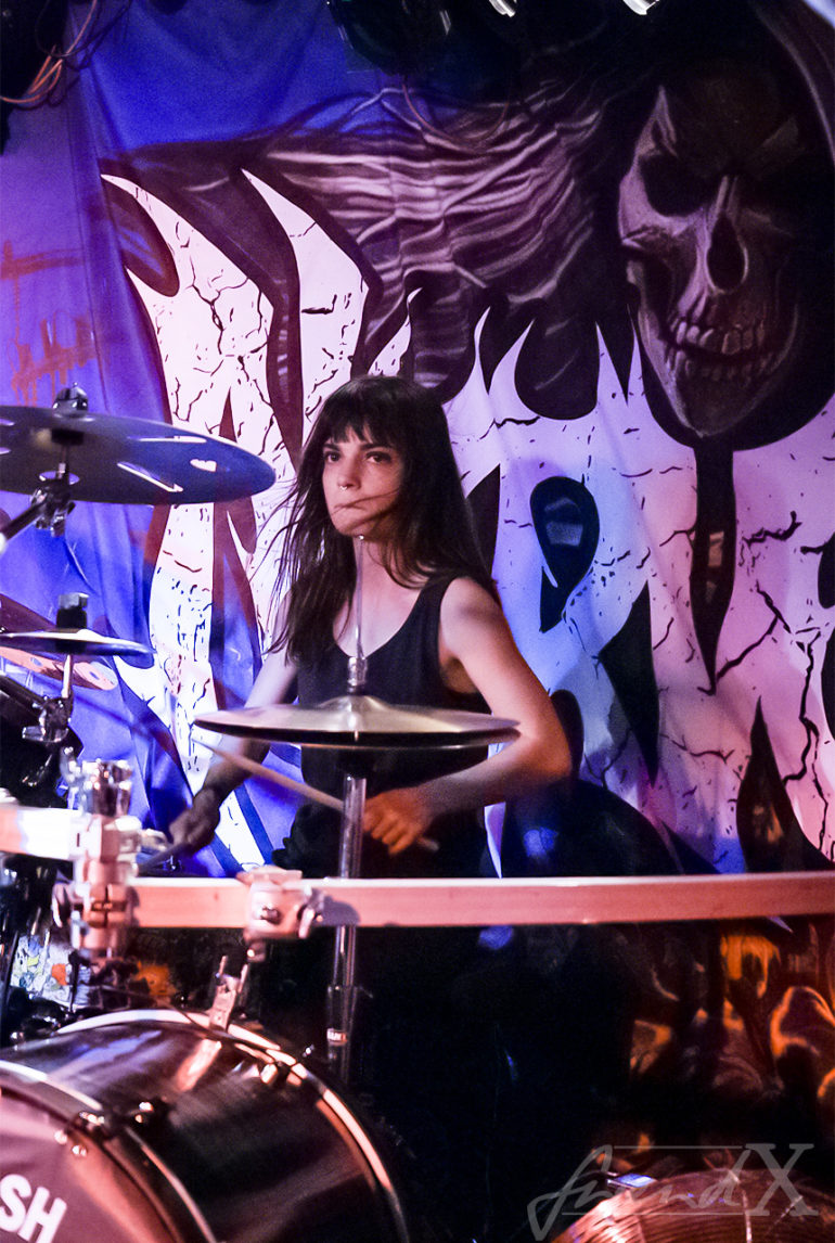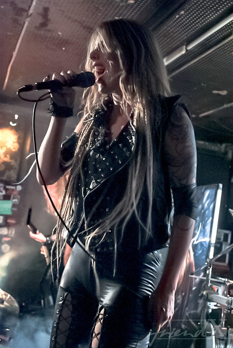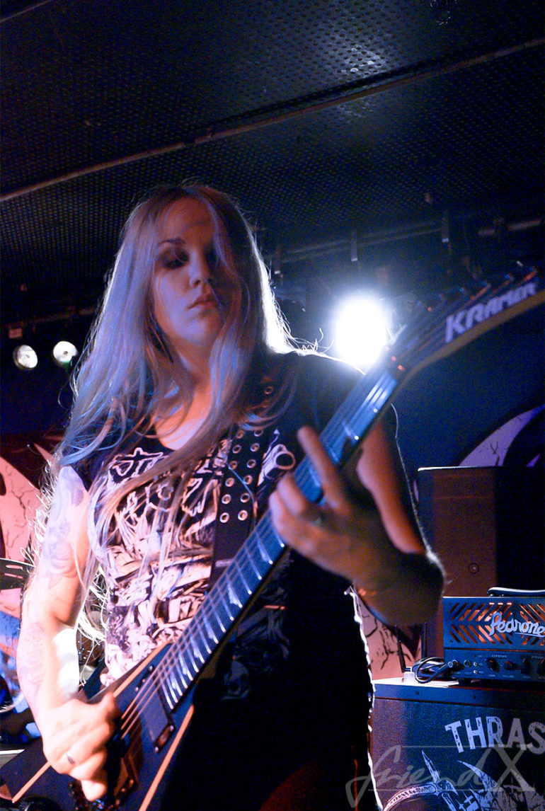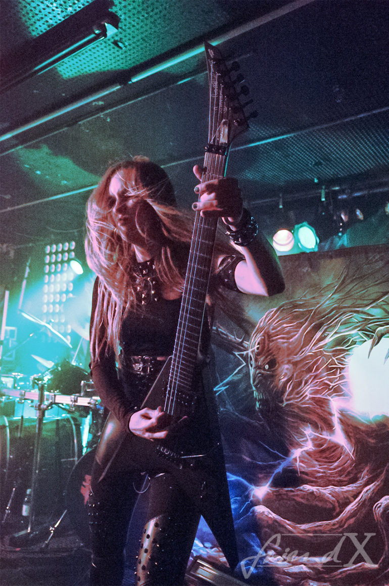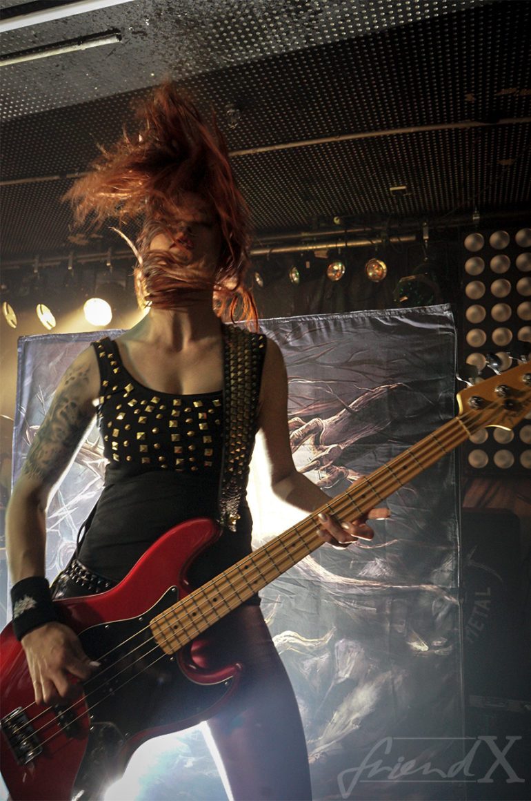 It is wonderful to see Mia Wallace ruling the left side of the stage with her brutal bass lines. It seems like five strings are not enough. She really is what I would call a metal predator. Mia’s stage persona is so strong, nearly unbearable, lesser co-musicians would disappear and fade away beside her like dust in the wind.