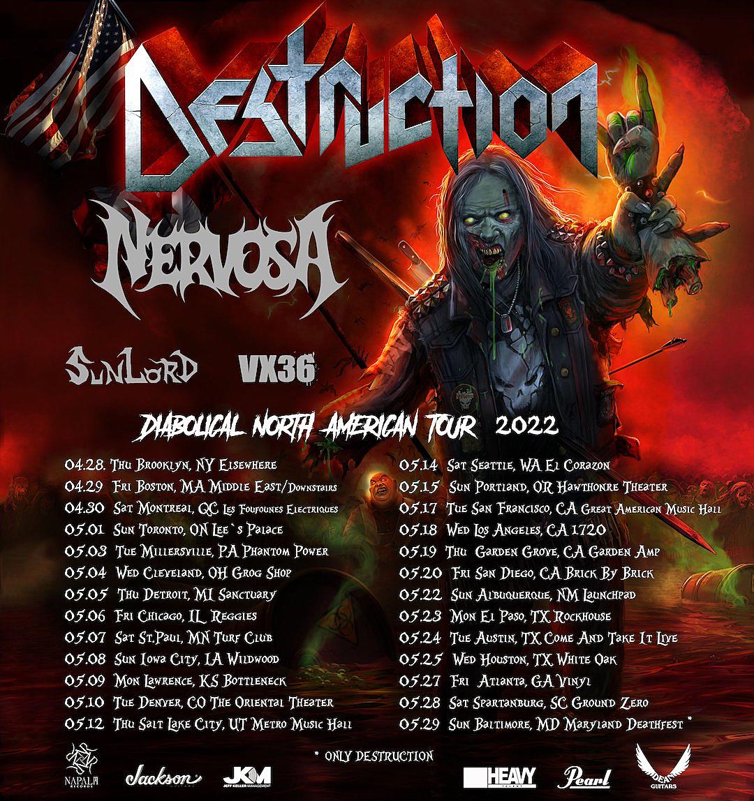 Early spring 2022 Nervosa and Burning Witches are on the road with their European Double The Metal tour and the paths also lead them to Frankfurt Rock City, the well-known cellar club Nachtleben in the middle of the city. The club belongs to the even more legendary Batschkapp. It is surrounded by lots of food stores so if you want to feed your hunger for food before you follow your appetite for metal, here you are. It is the very same day the local football club Eintracht Frankfurt will play FC Barcelona in the Football Europa League, so the area is even more crowded than usual.