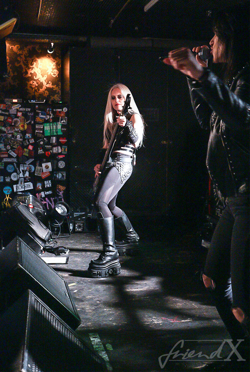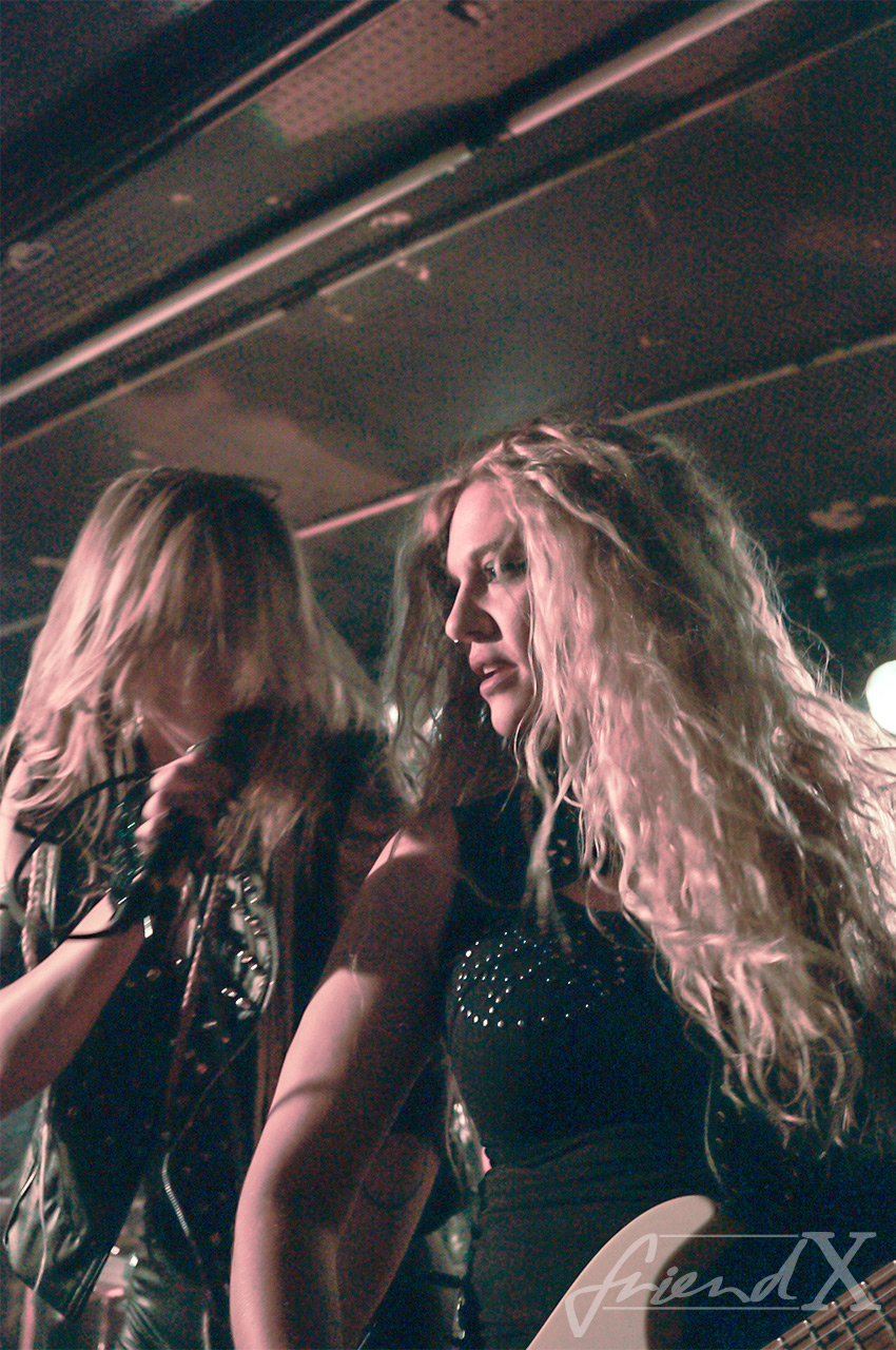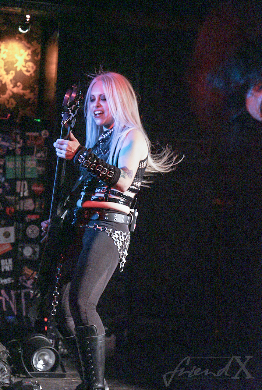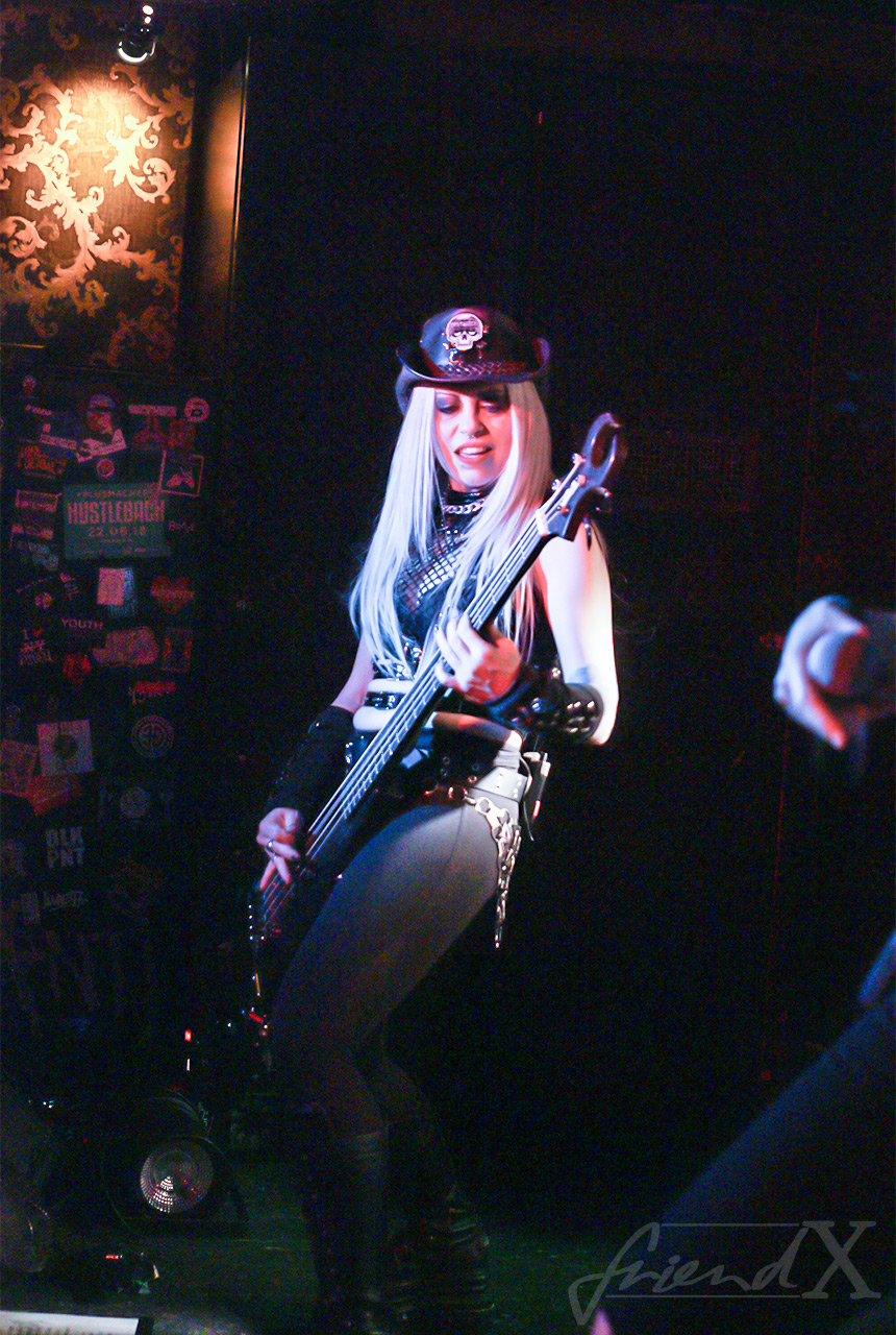 It is wonderful to see Mia Wallace ruling the left side of the stage with her brutal bass lines. It seems like five strings are not enough. She really is what I would call a metal predator. Mia’s stage persona is so strong, nearly unbearable, lesser co-musicians would disappear and fade away beside her like dust in the wind.