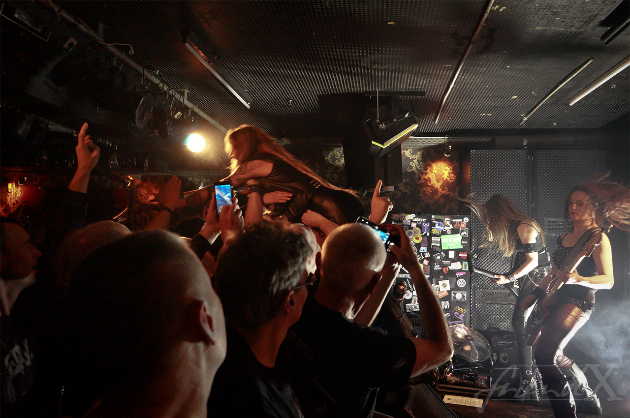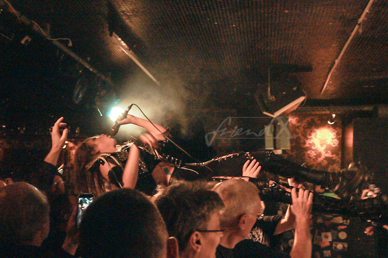 We come to another highlight, yes of course the “Hexenhammer”! It more or less is the unofficial hymn of Burning Witches. If I remember right, it was during this song that Laura stage dived twice in two minutes. Everybody who knows how low the ceiling of Nachtleben is realizes that it is not completely harmless even if you trust your audience. You could easily crash your head or bump against a spotlight. But Laura proves to not only survive but continue singing while she dives through the ocean of helping hands.