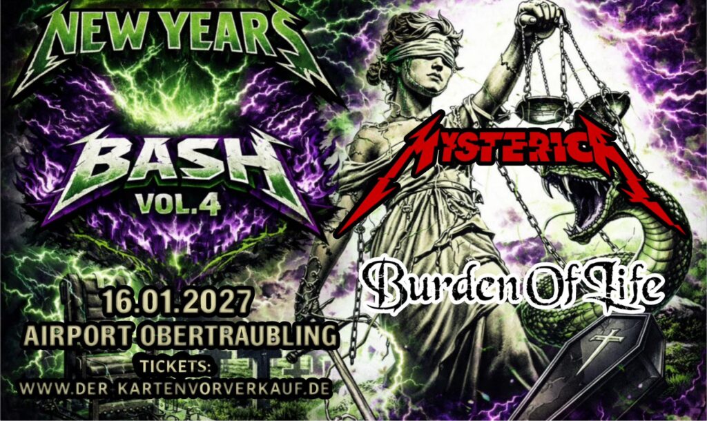 As some of you may have noticed, I finished the 2025 concert year with the Swiss band Fire Rose‘s Finale Furioso at KIK in Sissach. I told you about traditions, so here we go again: we will begin the 2026 concert year with a Swiss headliner at MystericA’s New Year’s Bash Vol. 3 at Eventhall Airport Obertraubling. It’s a bit of a family reunion because members of the Rock & Metal Day’z festival crew will either be performing on stage or watching the three bands from the front. All of them have already played on this cosy festival and one will perform as this year’s Friday night headliner…