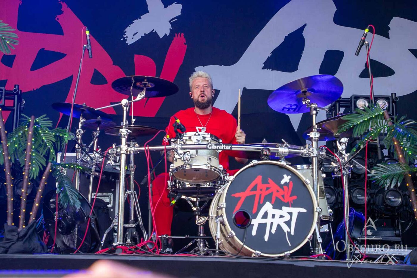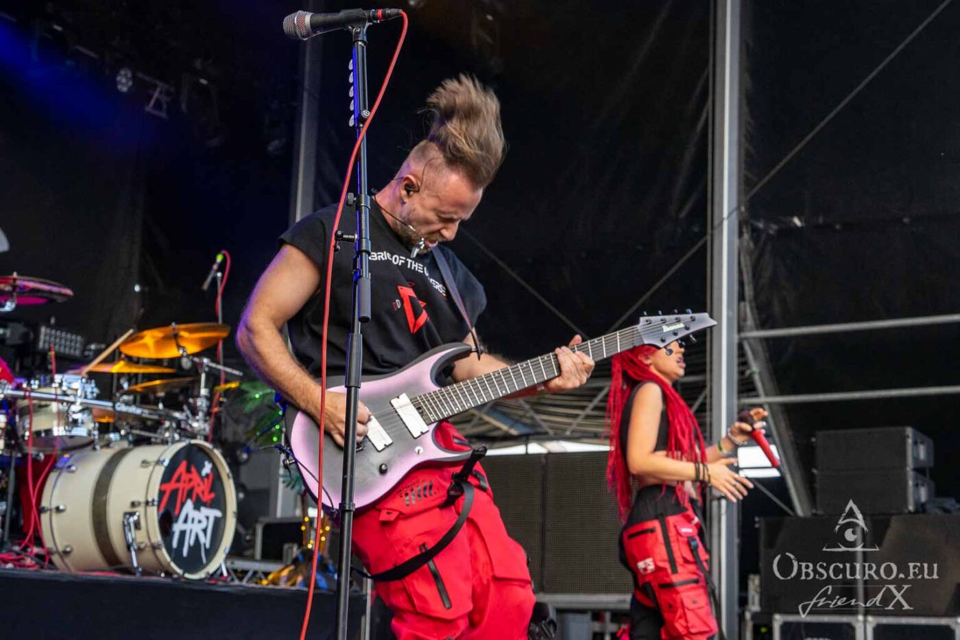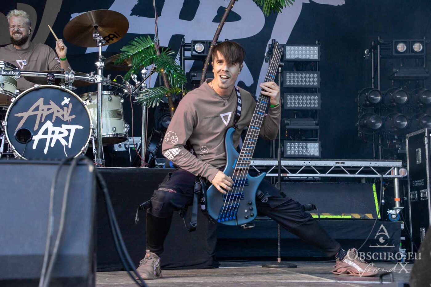 The infield is tightly filled when Hessen’s metal combo sensation one April Art start a firework display of crossover alternative metal. Lisa, Julian, Chris and Ben have been rising high above the sky ever since their breakthrough song “Break Out”, which also opens their set. Lisa describes April Art’s music as ‘sports metal’, which means there’s a lot of exercise to be done on and in front of the stage: jumping, running and exercising at high speed. There’s a good reason why adrenaline and April Art both start with an ‘A’… Sadly, it heavily starts raining after a little over half of the set, so some people seek shelter under the food tent’s roof. Microphones and monitors are moved closer to the centre of the stage, and the show goes on as if nothing else matters. And it’s true — nothing else matters.