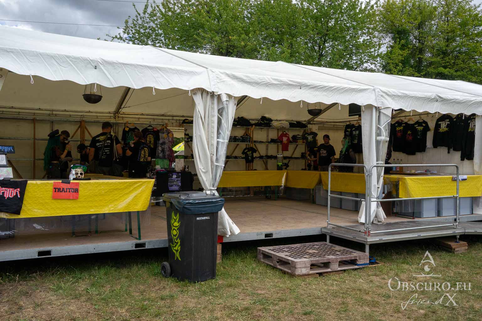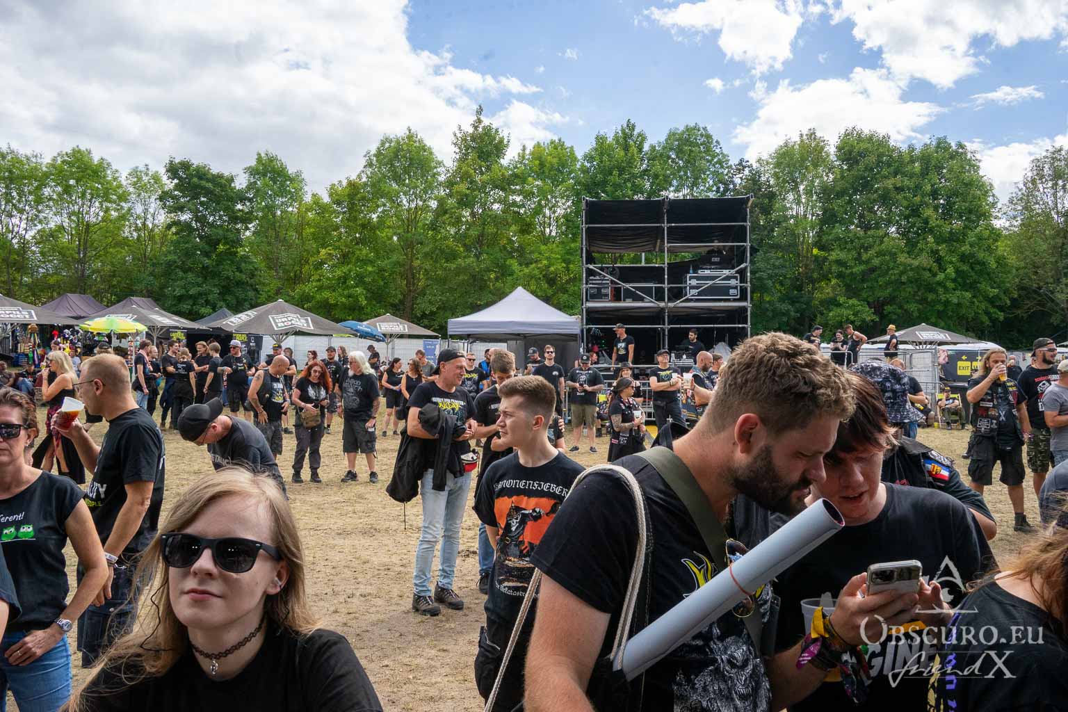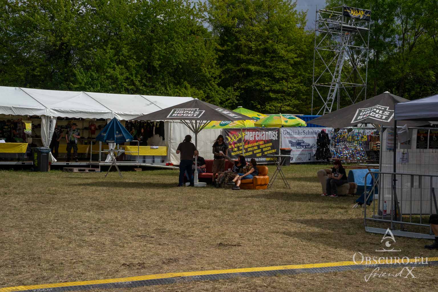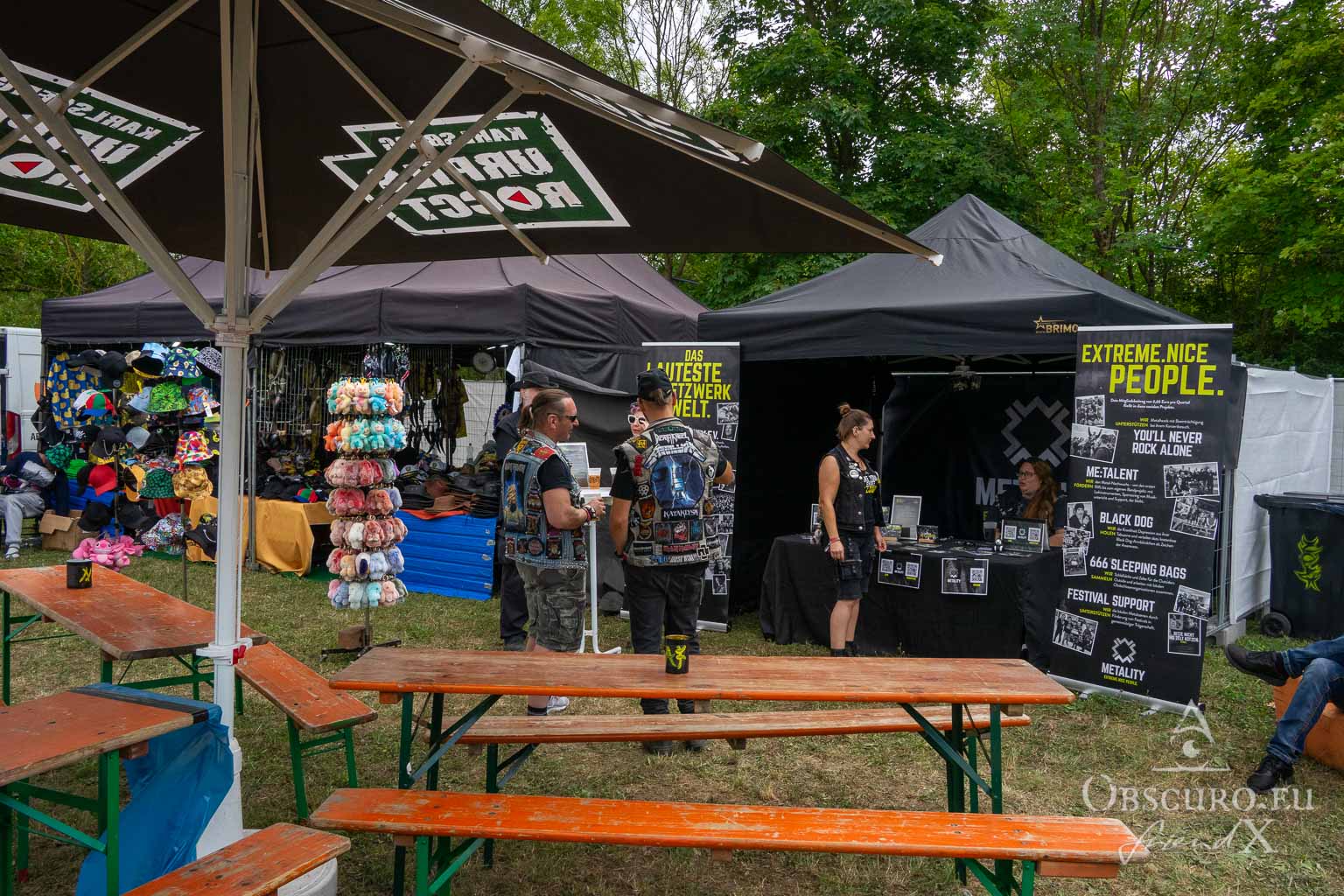 The whole area is surrounded by trees and feels more like a cosy forest glade than a metal festival site. You can smell the grass and trees of the German countryside — it’s very picturesque! I take a look around, checking out the stalls selling merchandise, food and drink, and I bump into some familiar faces from other concerts and festivals. I am happy to mention Metality of course. They have the stall there too, check their website to find our more about this association.