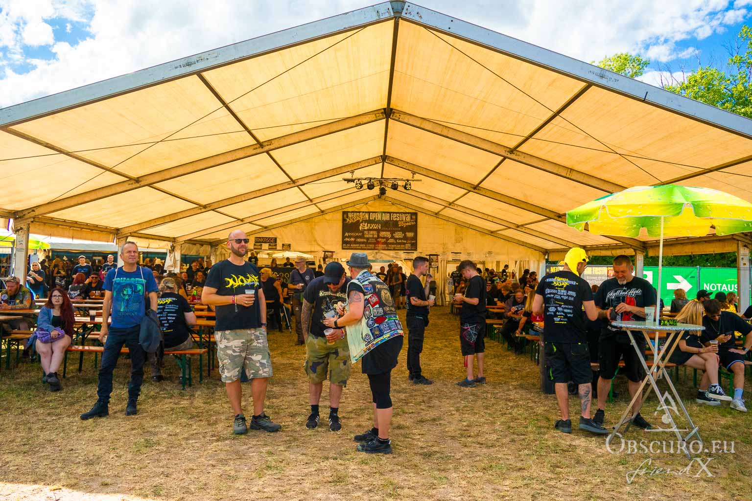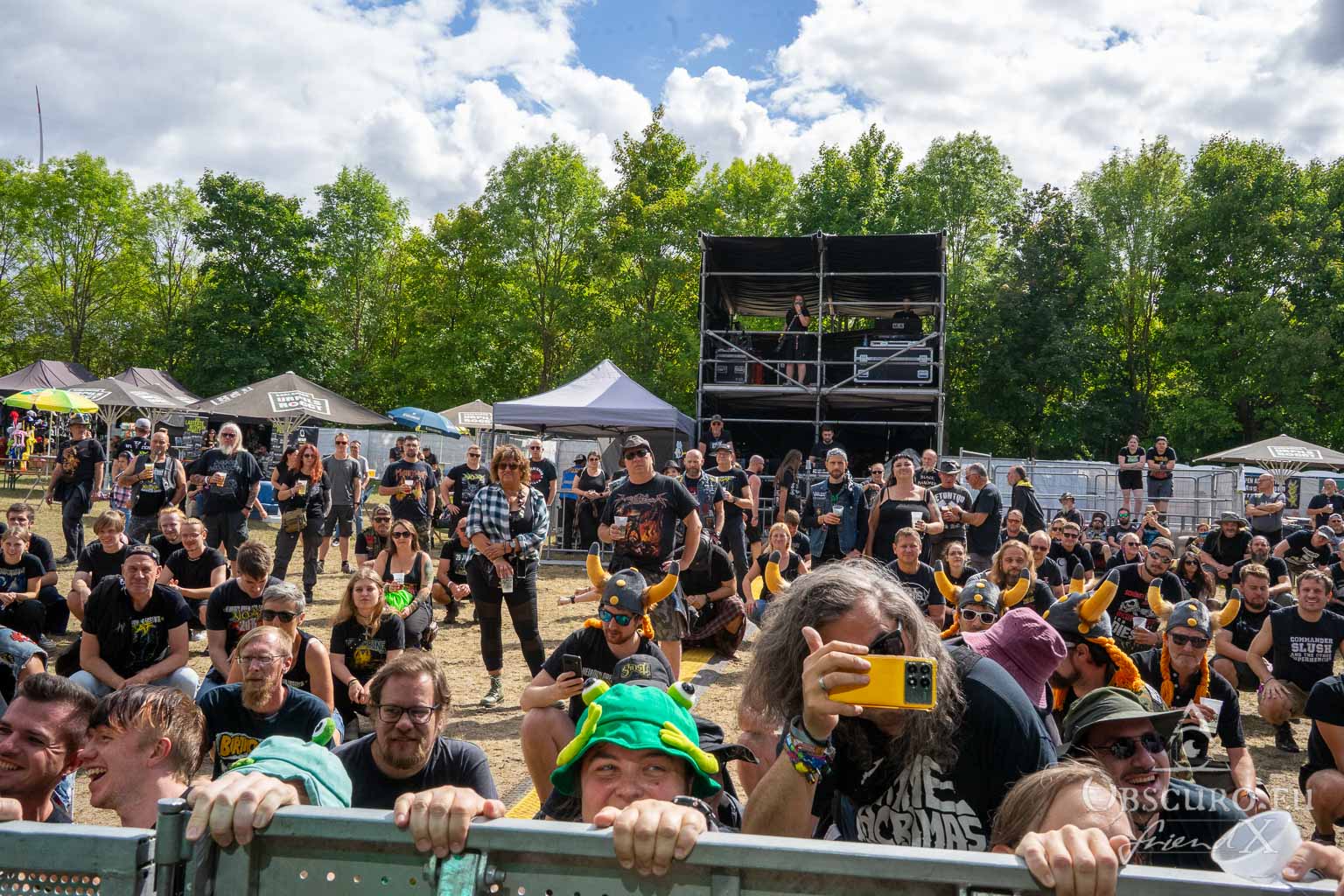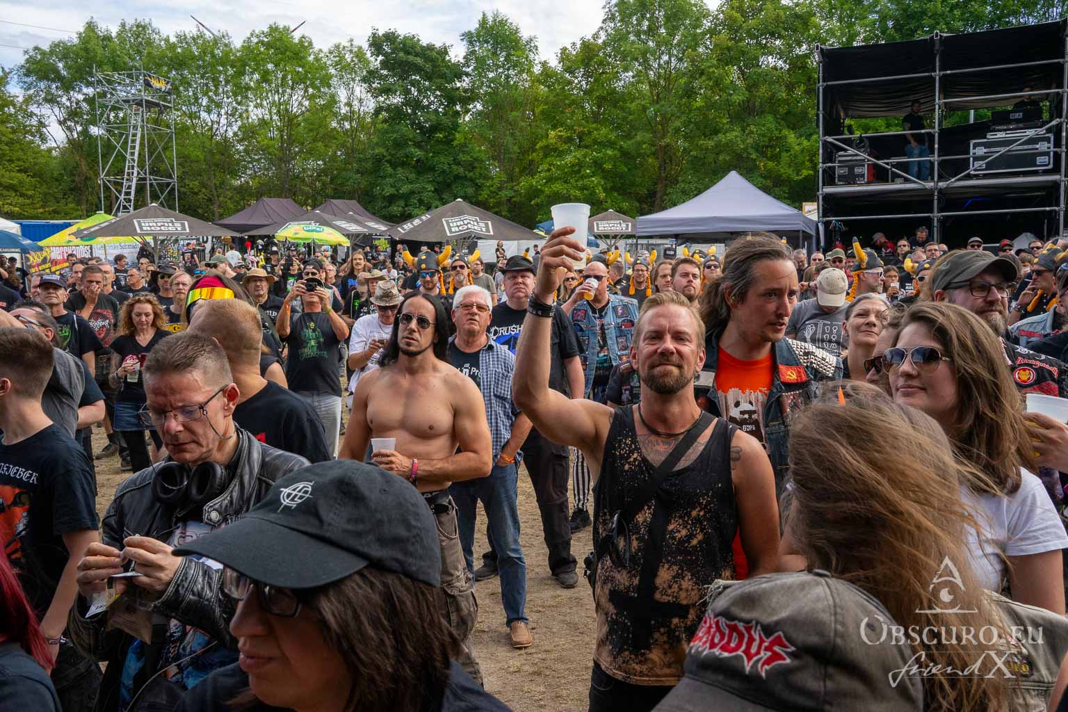 The whole area is surrounded by trees and feels more like a cosy forest glade than a metal festival site. You can smell the grass and trees of the German countryside — it’s very picturesque! I take a look around, checking out the stalls selling merchandise, food and drink, and I bump into some familiar faces from other concerts and festivals. I am happy to mention Metality of course. They have the stall there too, check their website to find our more about this association.