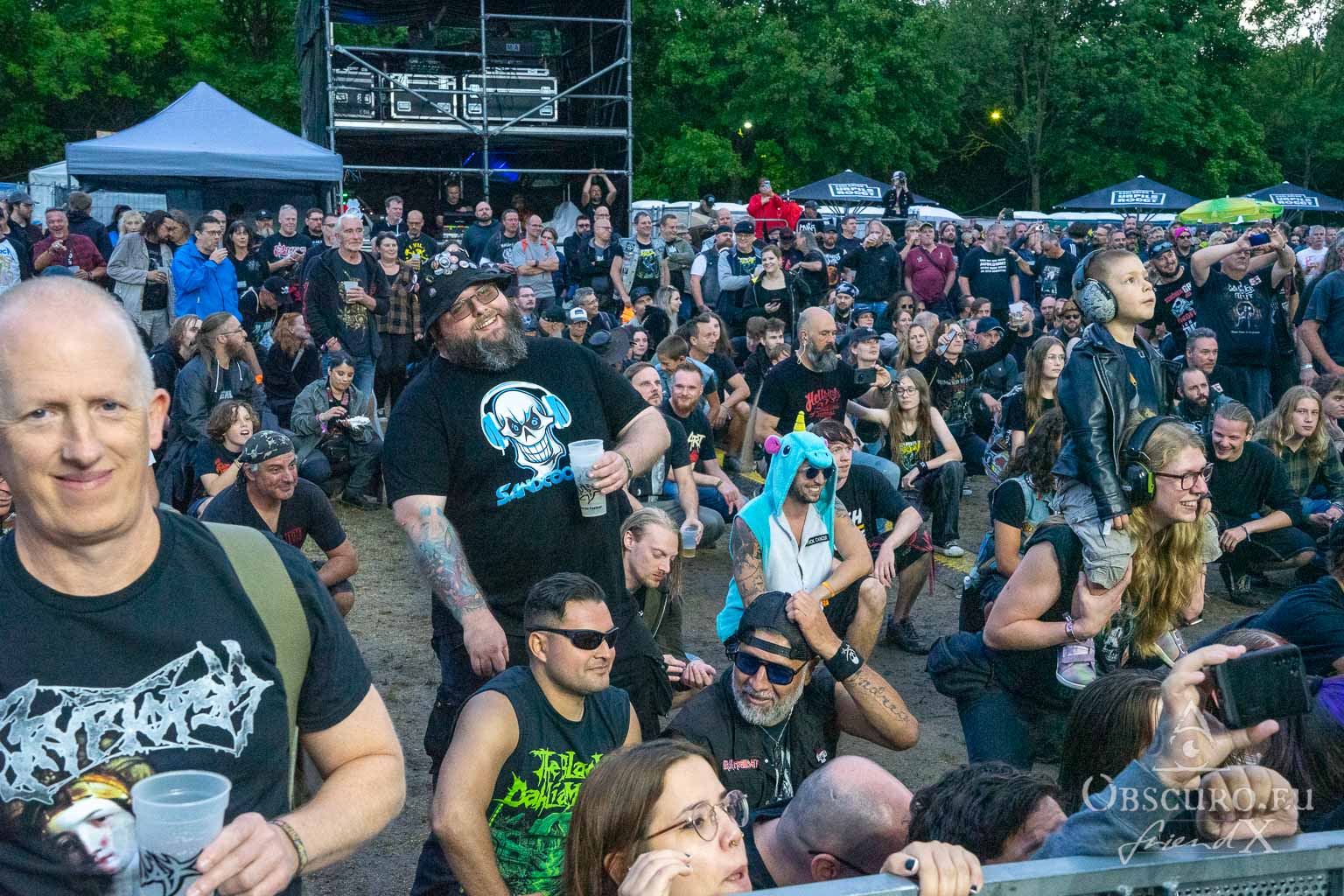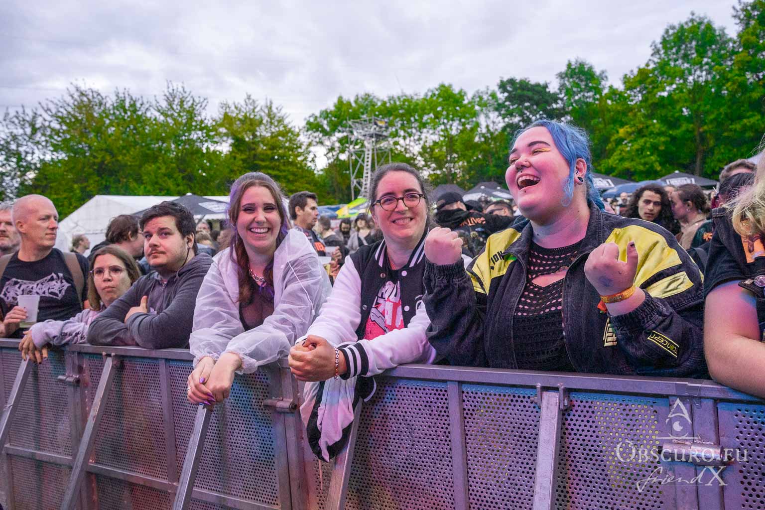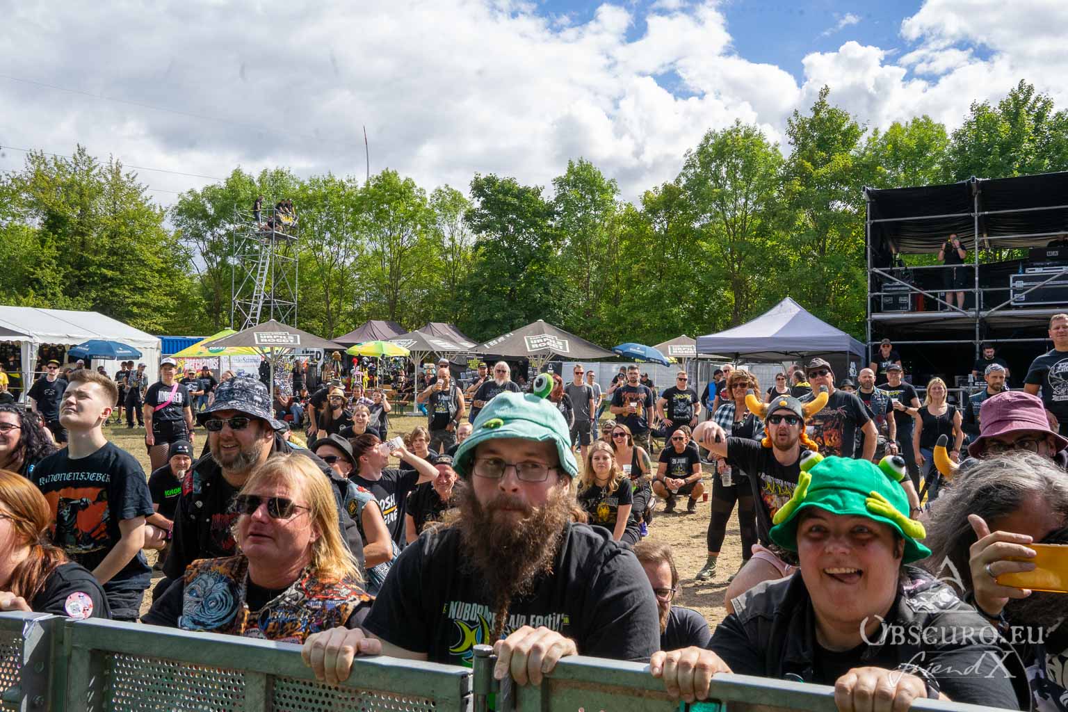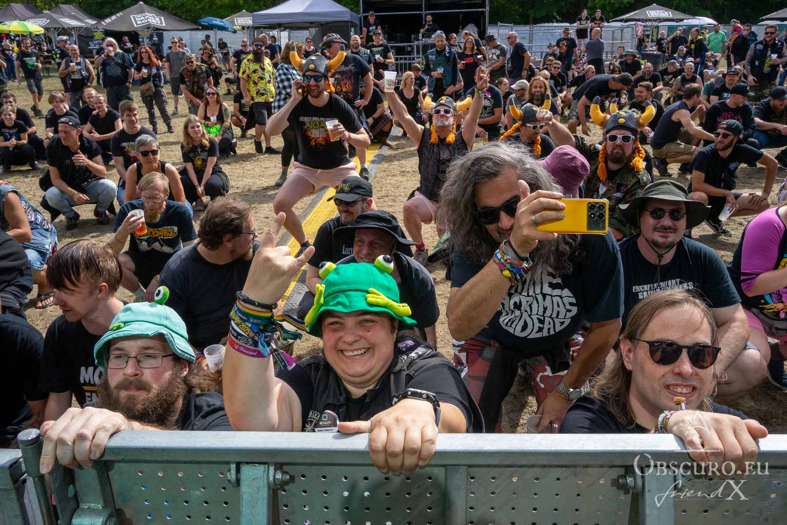 The whole area is surrounded by trees and feels more like a cosy forest glade than a metal festival site. You can smell the grass and trees of the German countryside — it’s very picturesque! I take a look around, checking out the stalls selling merchandise, food and drink, and I bump into some familiar faces from other concerts and festivals. I am happy to mention Metality of course. They have the stall there too, check their website to find our more about this association.