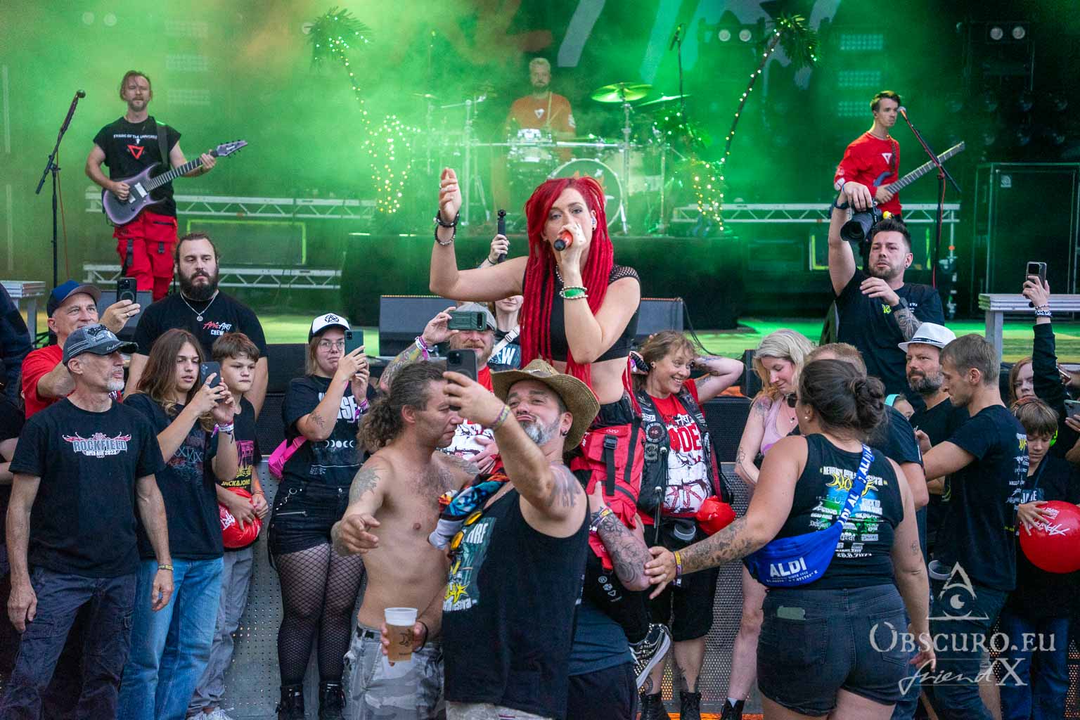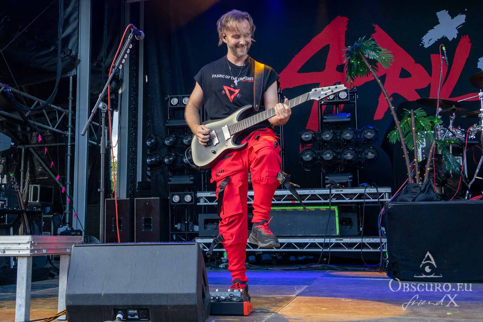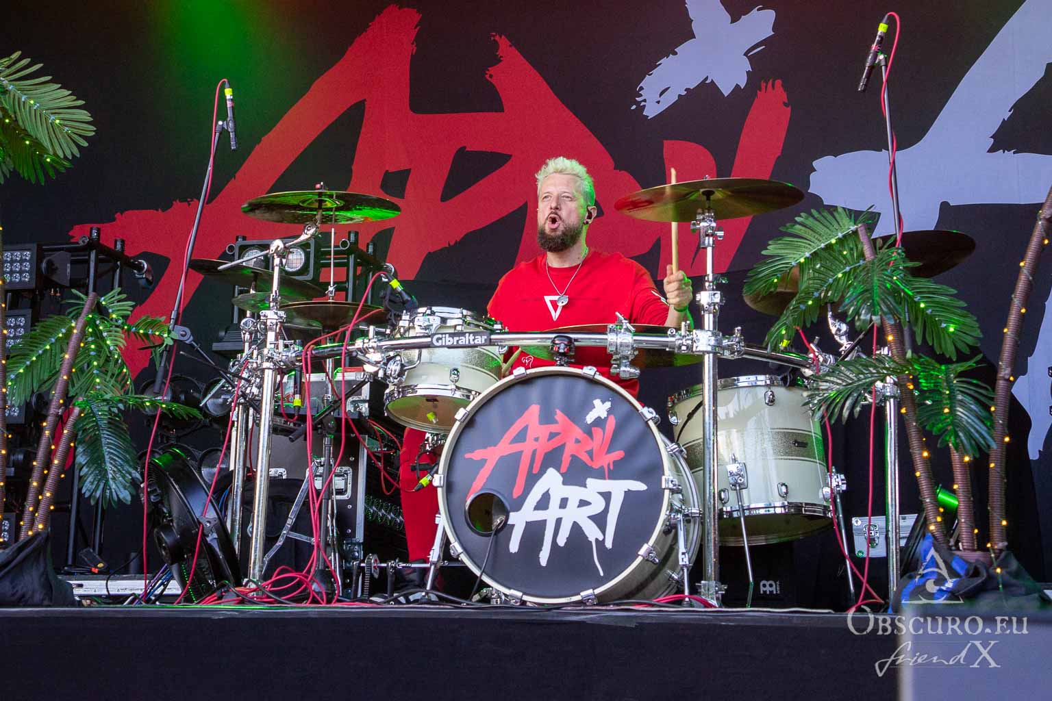 The infield is tightly filled when Hessen’s metal combo sensation one April Art start a firework display of crossover alternative metal. Lisa, Julian, Chris and Ben have been rising high above the sky ever since their breakthrough song “Break Out”, which also opens their set. Lisa describes April Art’s music as ‘sports metal’, which means there’s a lot of exercise to be done on and in front of the stage: jumping, running and exercising at high speed. There’s a good reason why adrenaline and April Art both start with an ‘A’… Sadly, it heavily starts raining after a little over half of the set, so some people seek shelter under the food tent’s roof. Microphones and monitors are moved closer to the centre of the stage, and the show goes on as if nothing else matters. And it’s true — nothing else matters.