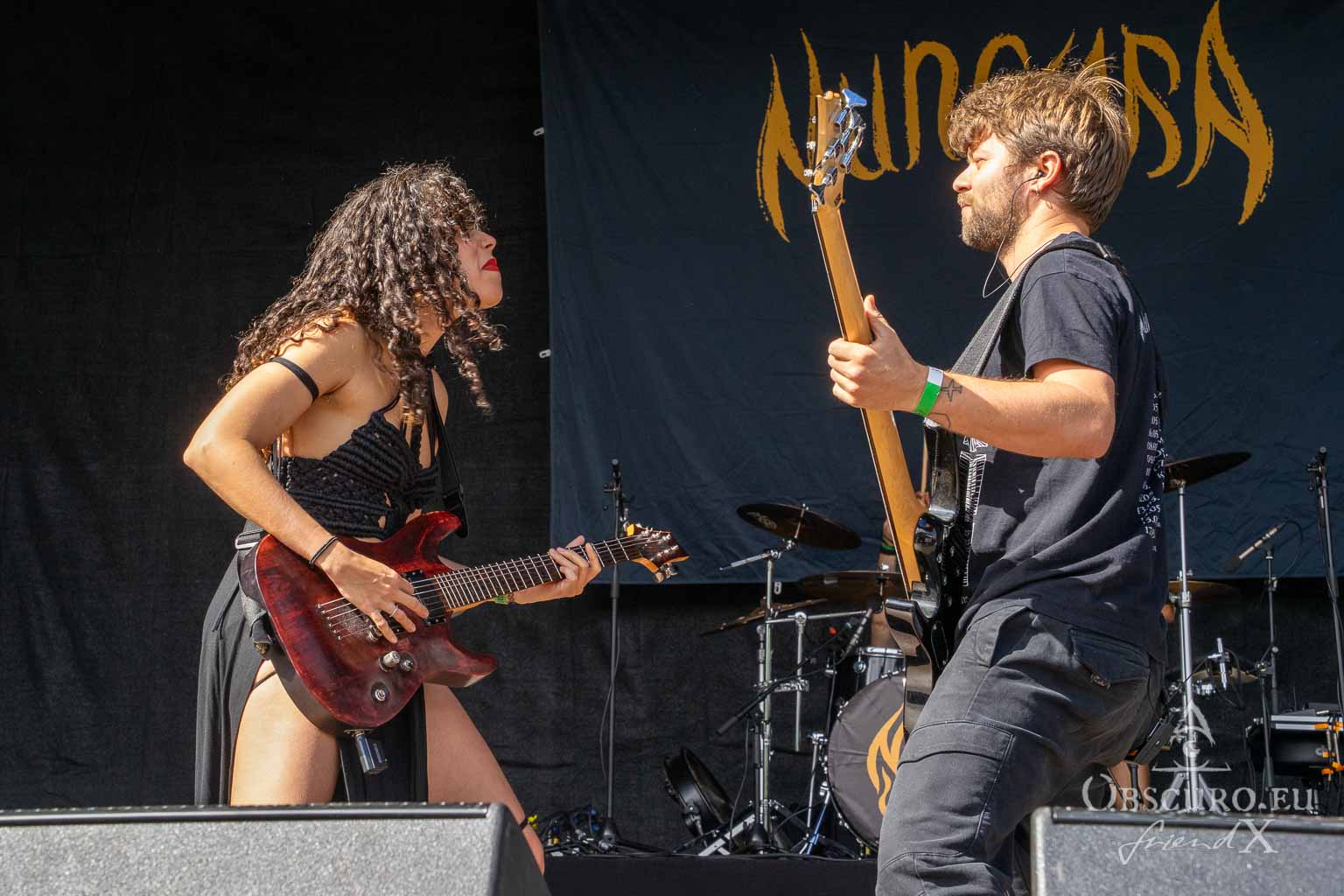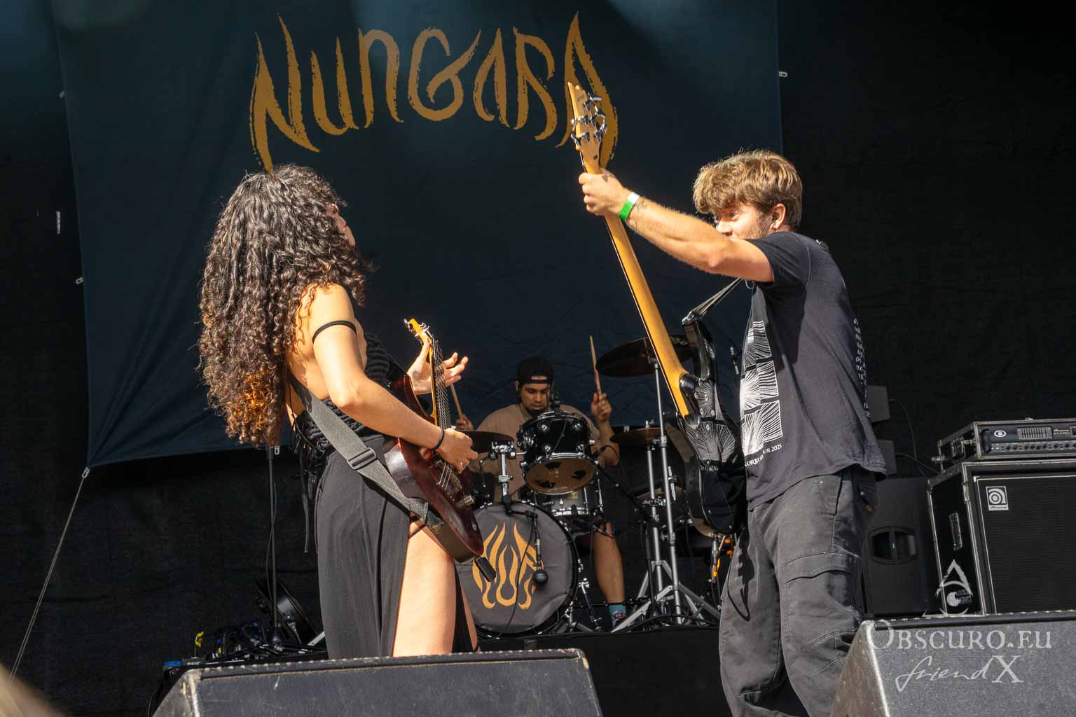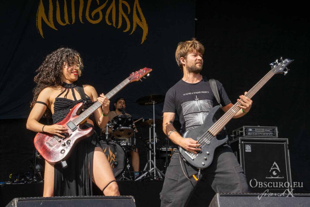 We catch up with an old acquaintance while Nungara prepare for their show. Their vocalist and guitarist, Noelle dos Anjos, was previously one of the two guitarists in Cobra Spell. Nungara are a Brazilian/German power trio who perform an excellent set of dark groove metal with slight progressive and doom metal influences. Noelle’s performance as a vocalist is excellent, ranging from bittersweet clean vocals to harsh growls. It seems that she was underchallenged in her former band. Well done, Nungara!