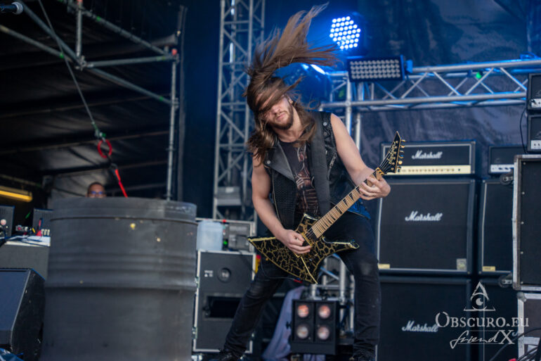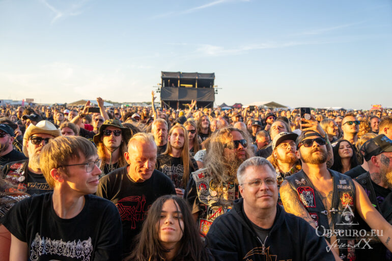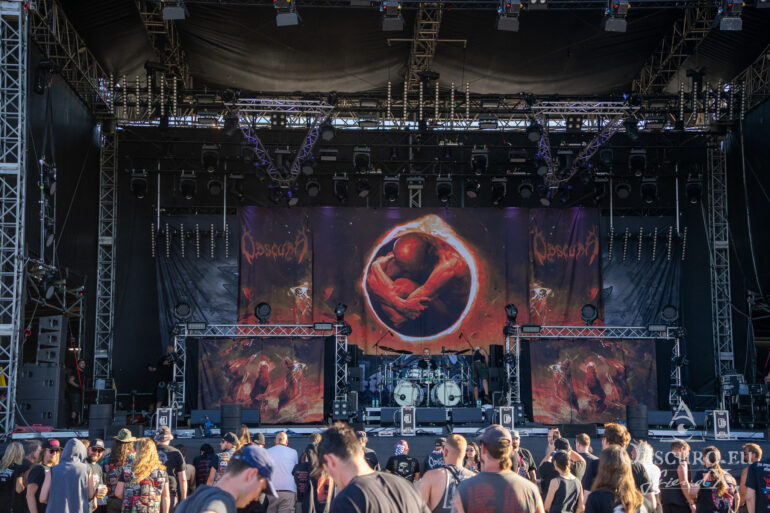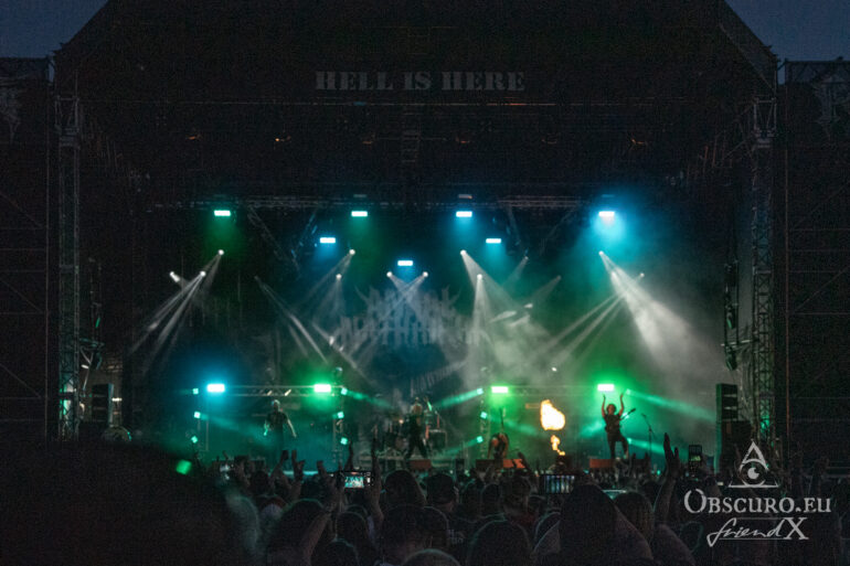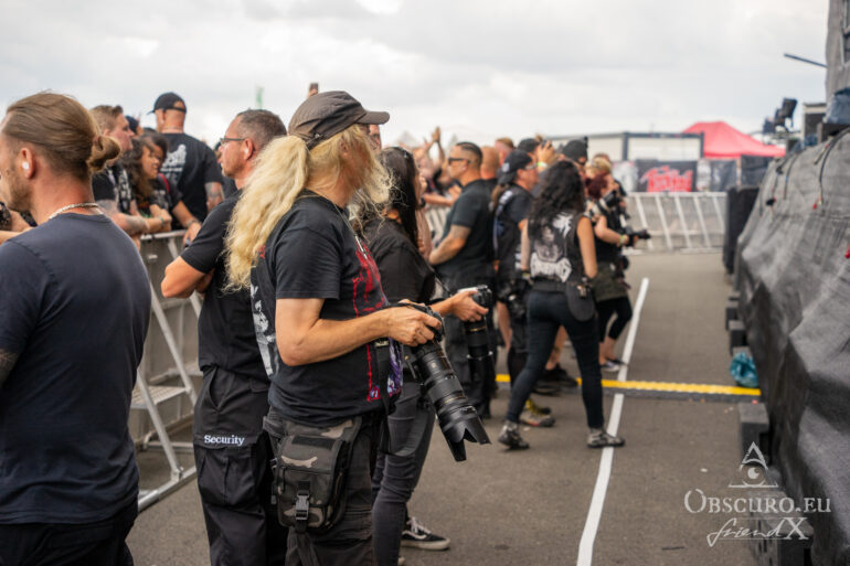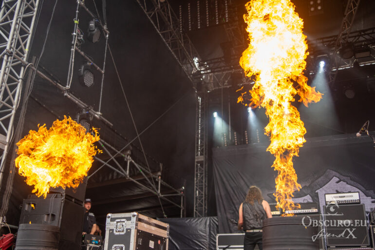 Each festival day at Party.San begins and ends with gun shots from the two guns flanking the main stage, one of them actually being called Esmiralda. The area is very spacious, surrounded by merch, drink, and food stalls. Behind the tower of the sound and light crew were two tents where you could sit and have some shade, while being able to watch and listen to the bands on the main stage. And there were even more benches to rest on or to have some food, all in good sight of the stage. The main stage was placed near the runway, so the area between the tower and the stage was tarred without any crowd barriers except the last one right in front of the stage. The second stage, tent stage, was just some 100m away, so you could have jumped stages within three to five minutes easily.