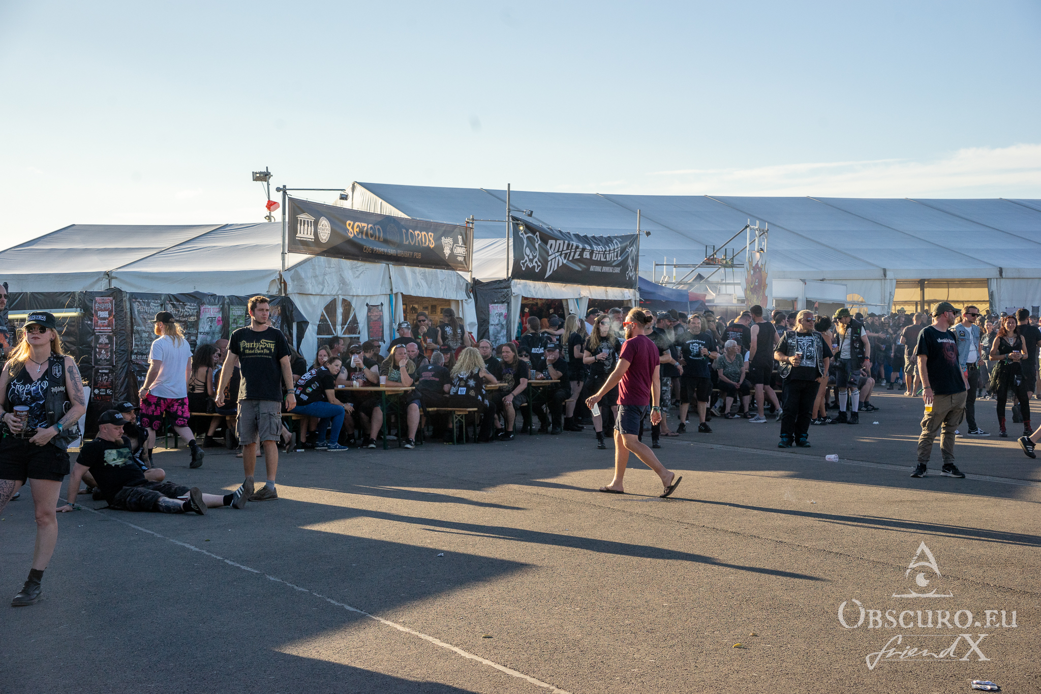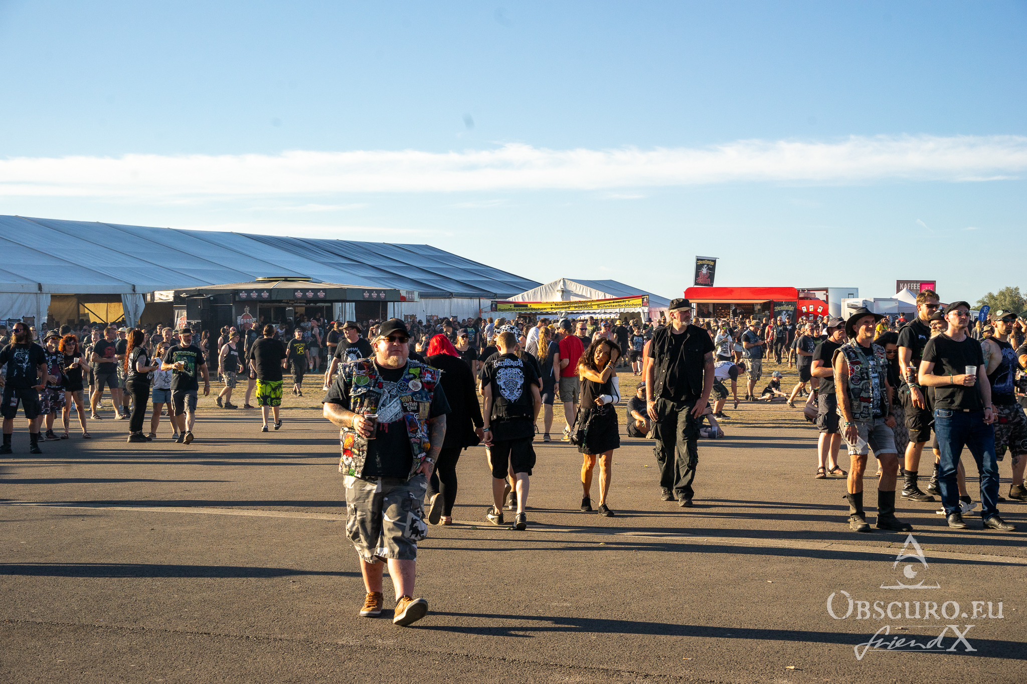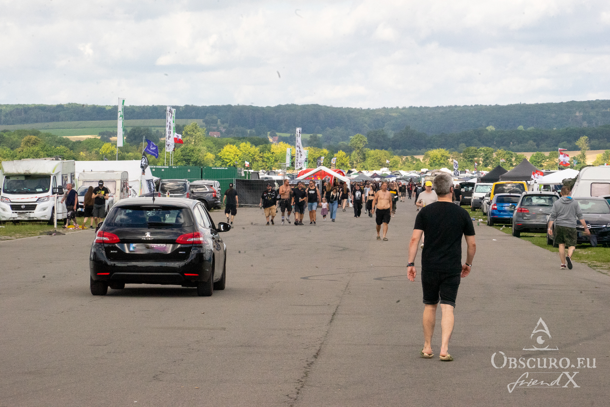 Wednesday was an easy day. I picked up a friend from Frankfurt airport to meet with the rest of our group at a supermarket in Schlotheim. We got on the campsite without any real long waiting lines. The area, where Party.San is located, is an airfield with two huge, tarred runways. The campsites are placed along and between the two runways. Party.San usually hosts between 9.000 and 10.000 metal heads but the available space on this airfield is much bigger so there is no squeezing at all.