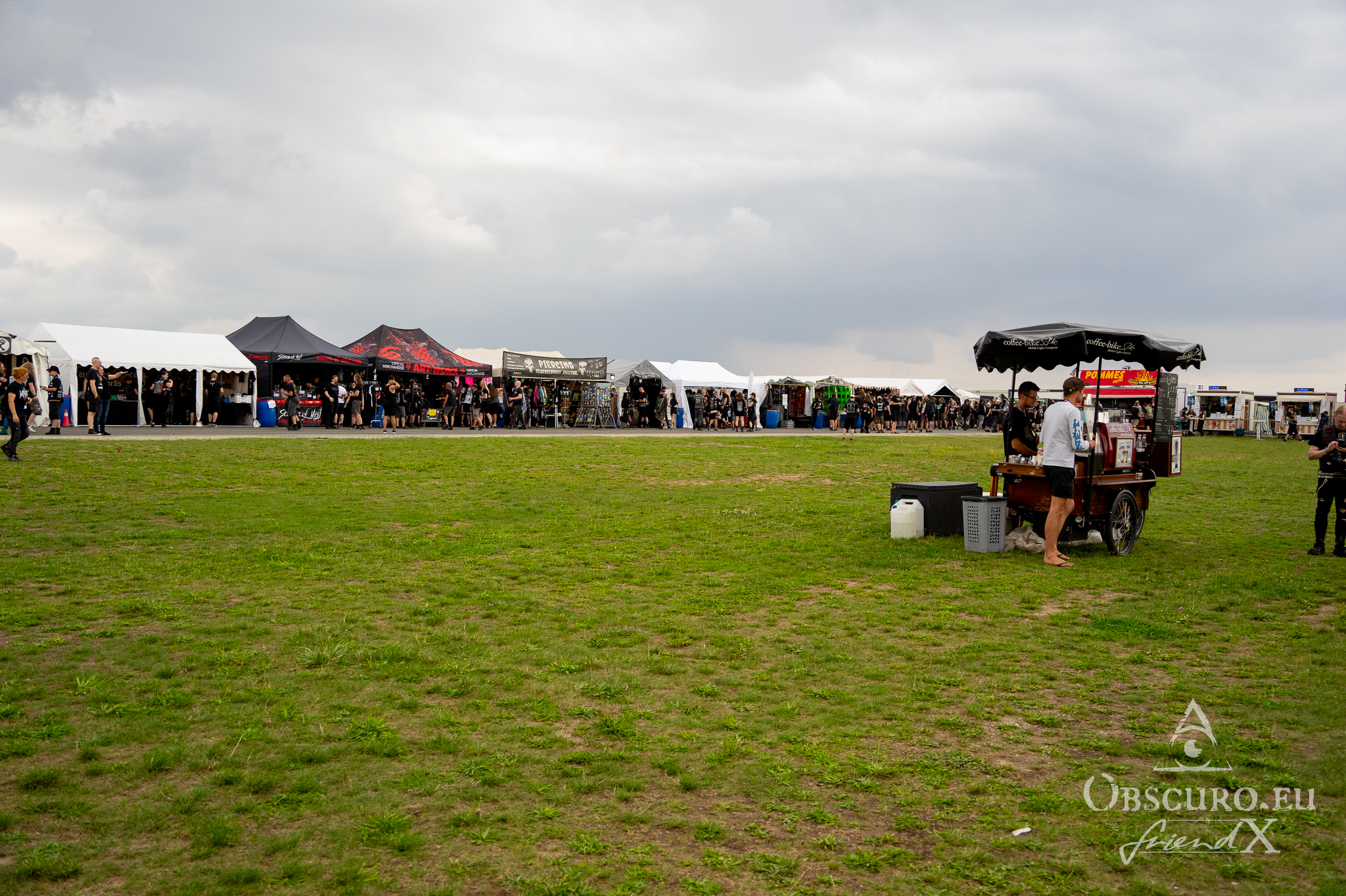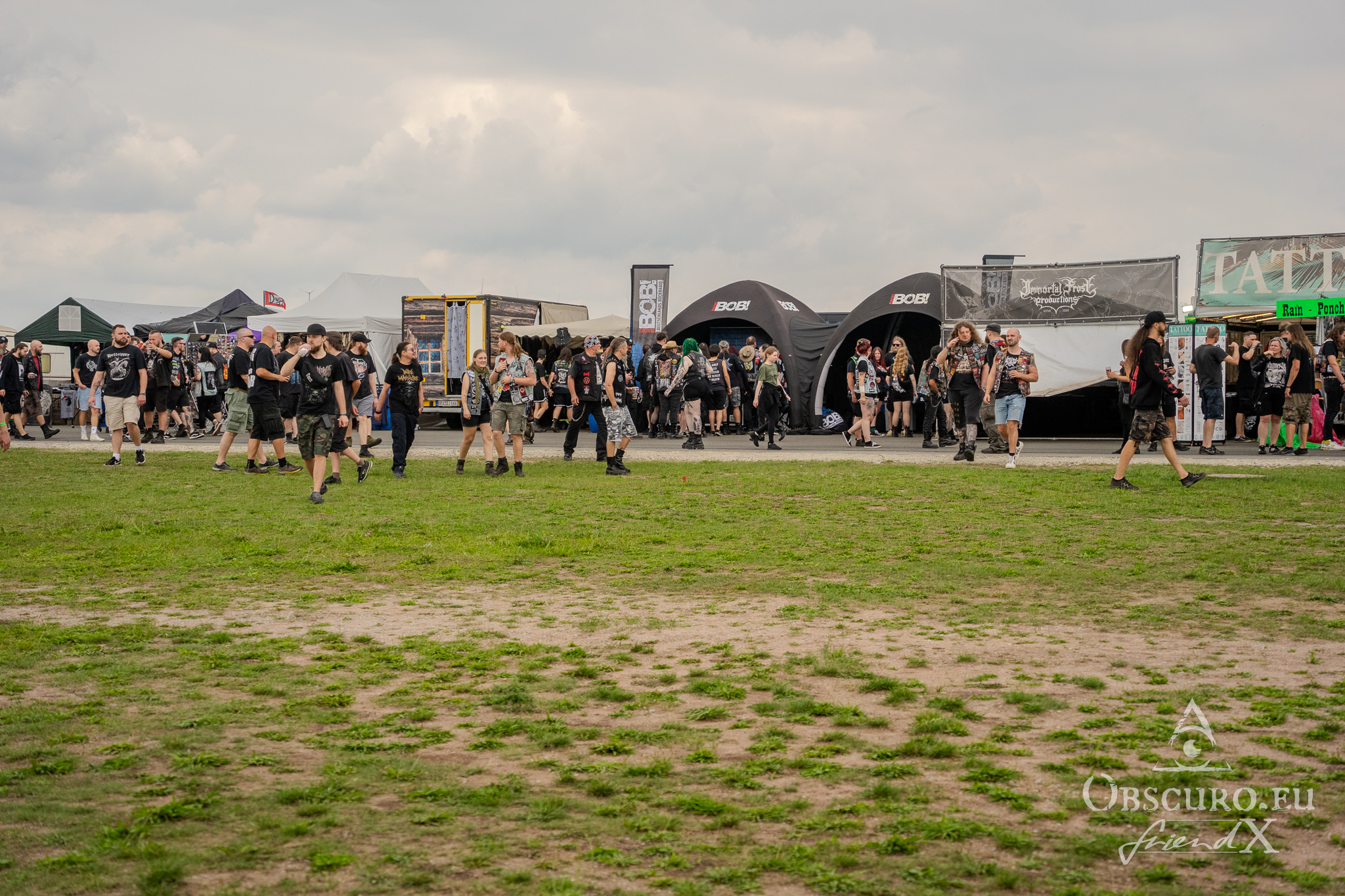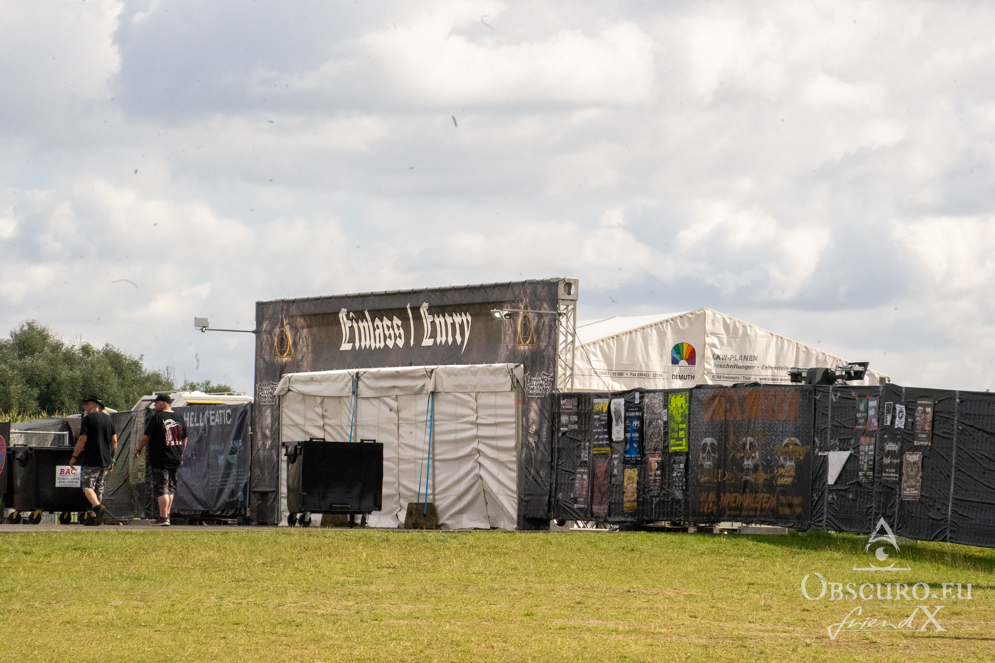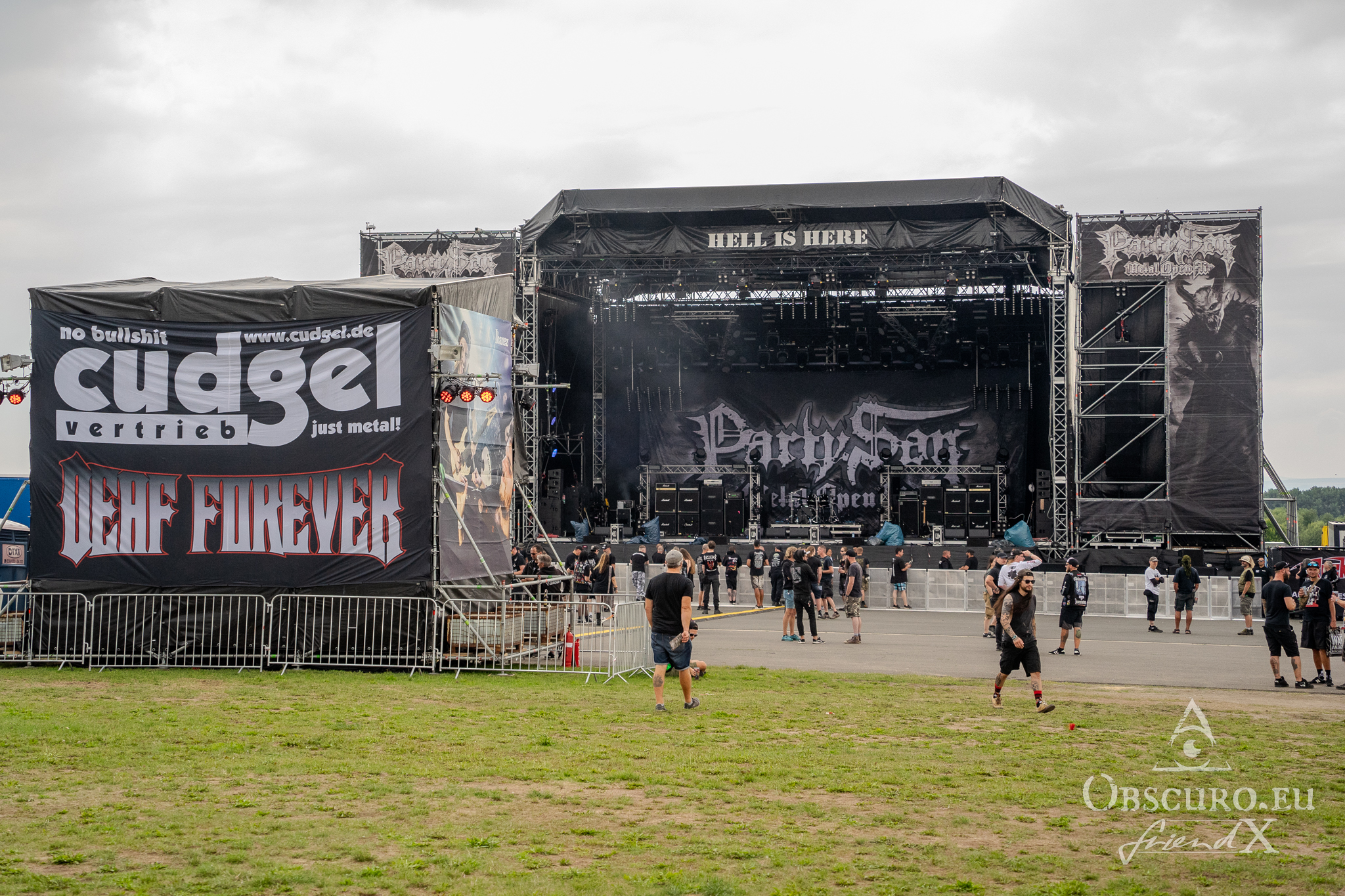 Wednesday was an easy day. I picked up a friend from Frankfurt airport to meet with the rest of our group at a supermarket in Schlotheim. We got on the campsite without any real long waiting lines. The area, where Party.San is located, is an airfield with two huge, tarred runways. The campsites are placed along and between the two runways. Party.San usually hosts between 9.000 and 10.000 metal heads but the available space on this airfield is much bigger so there is no squeezing at all.