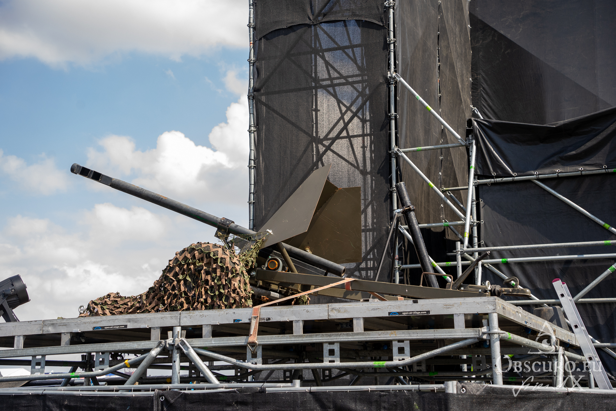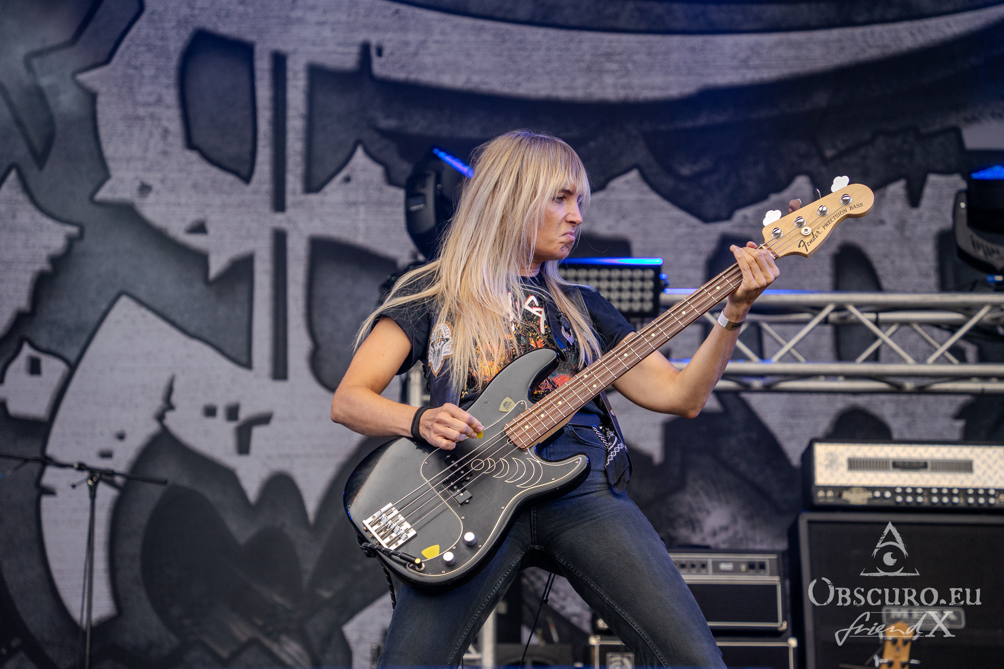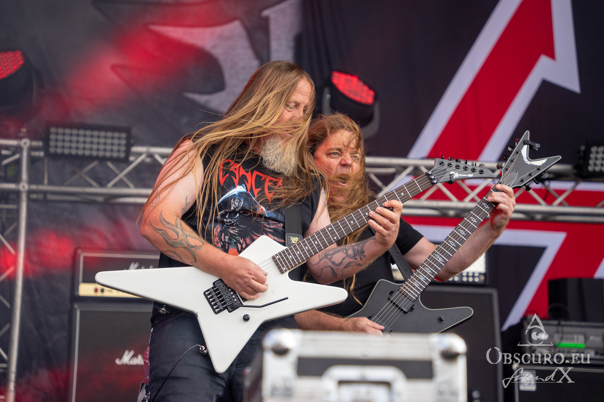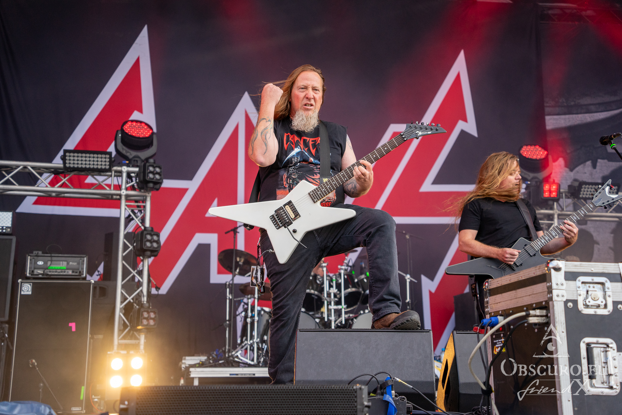 Each festival day at Party.San begins and ends with gun shots from the two guns flanking the main stage, one of them actually being called Esmiralda. The area is very spacious, surrounded by merch, drink, and food stalls. Behind the tower of the sound and light crew were two tents where you could sit and have some shade, while being able to watch and listen to the bands on the main stage. And there were even more benches to rest on or to have some food, all in good sight of the stage. The main stage was placed near the runway, so the area between the tower and the stage was tarred without any crowd barriers except the last one right in front of the stage. The second stage, tent stage, was just some 100m away, so you could have jumped stages within three to five minutes easily.