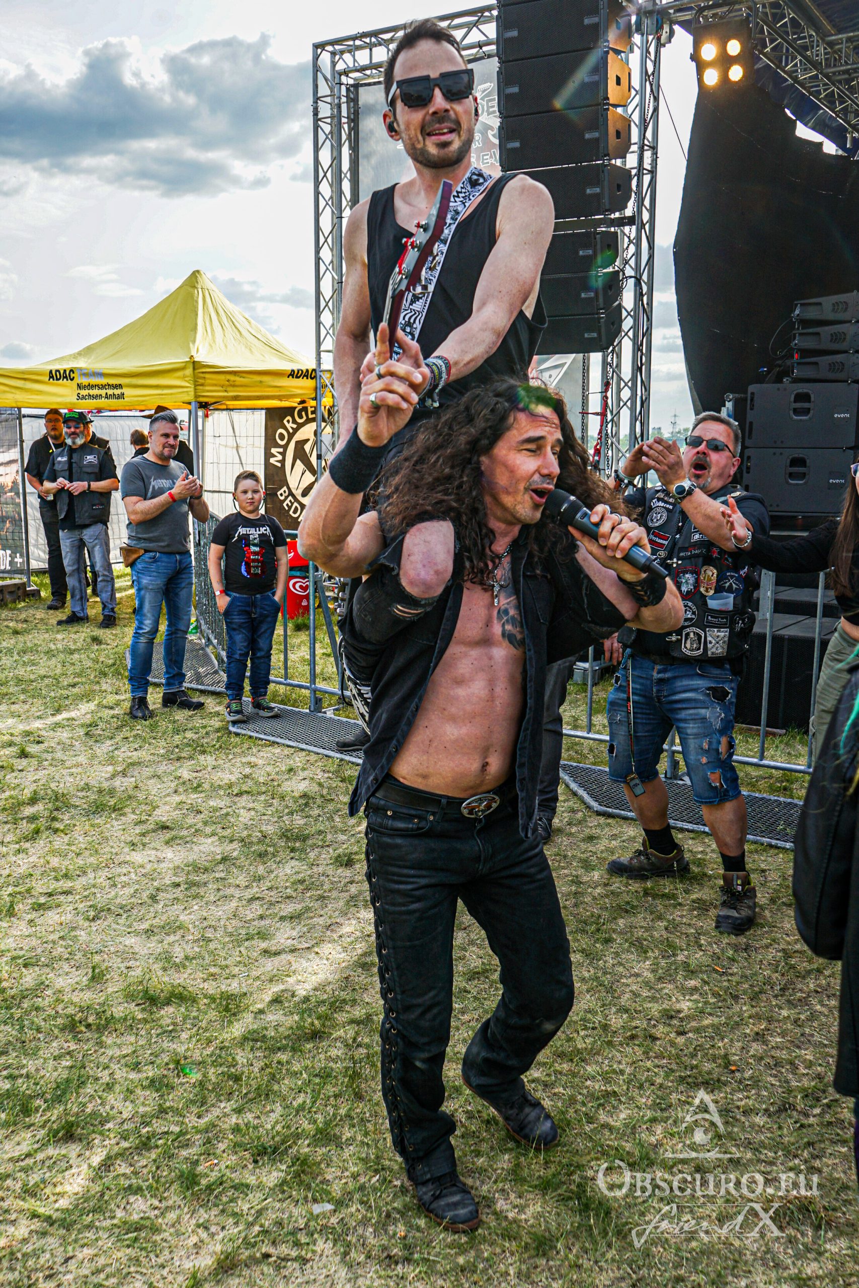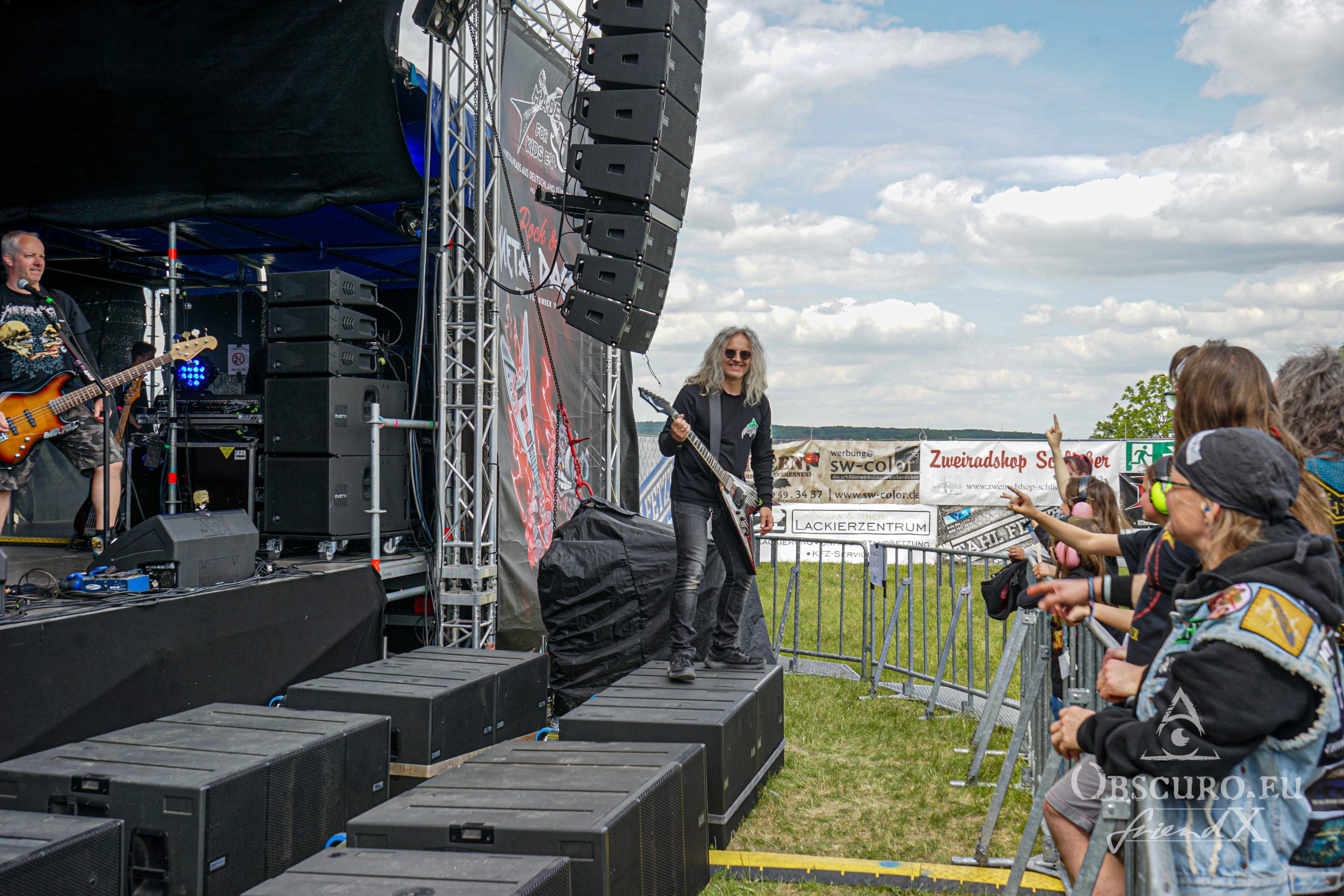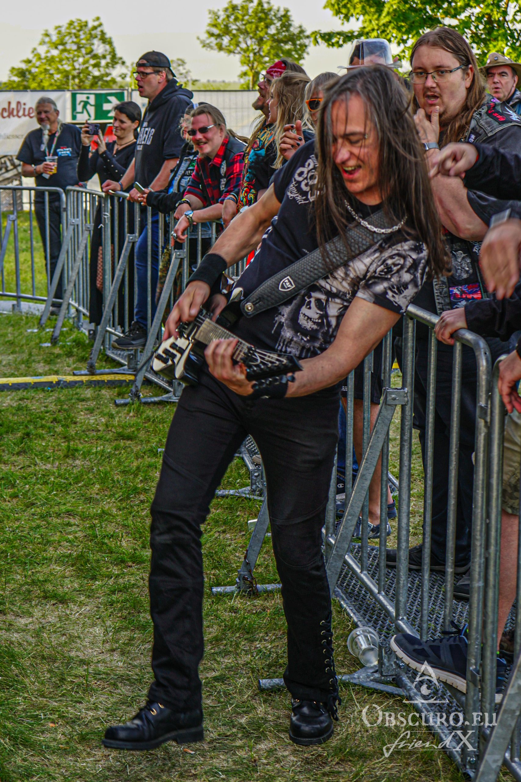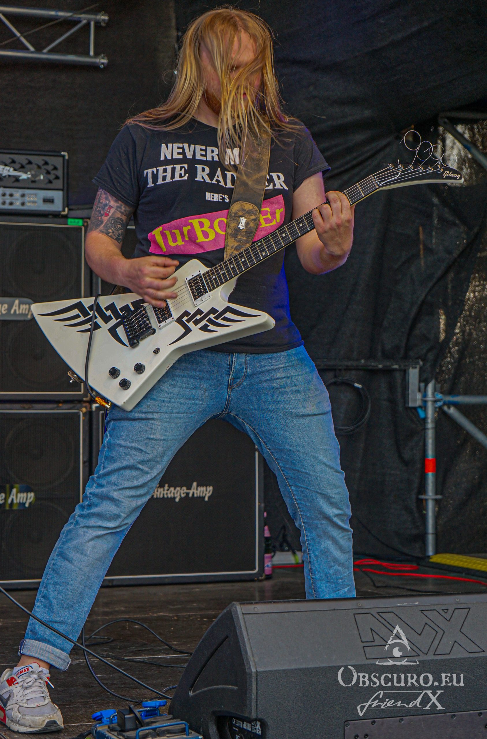 The Headliner on Friday faced a problem at arrival. Their drummer went ill while travelling and needed to go to the hospital immediately. Sh*t happens in the truest sense of the word. There was no time and no chance to find a substitute so shortly before the show. So Motorjesus had to make the decision, to cancel the show, or use a drum computer, even if it meant a loss of quality. They decided for the latter for the good of it. It would somehow have made no sense to drive all the way from Mönchengladbach to Oschersleben for nothing but a sick drummer. Their personal Jesus jumped in and mimicked as drummer along the drum computer. Motorjesus played a lovely set in best NWOBHM traditions combined with their own unique style.