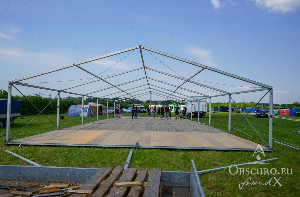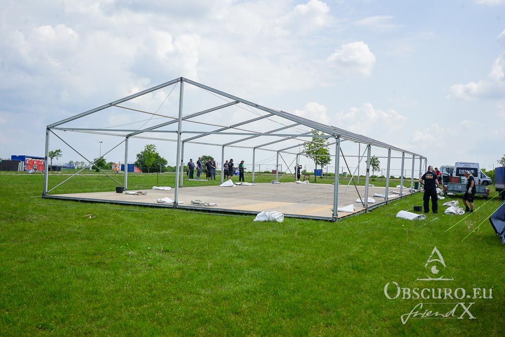 More than 12 hours after the work started, the tent and the basic structure of the stage are in place.
