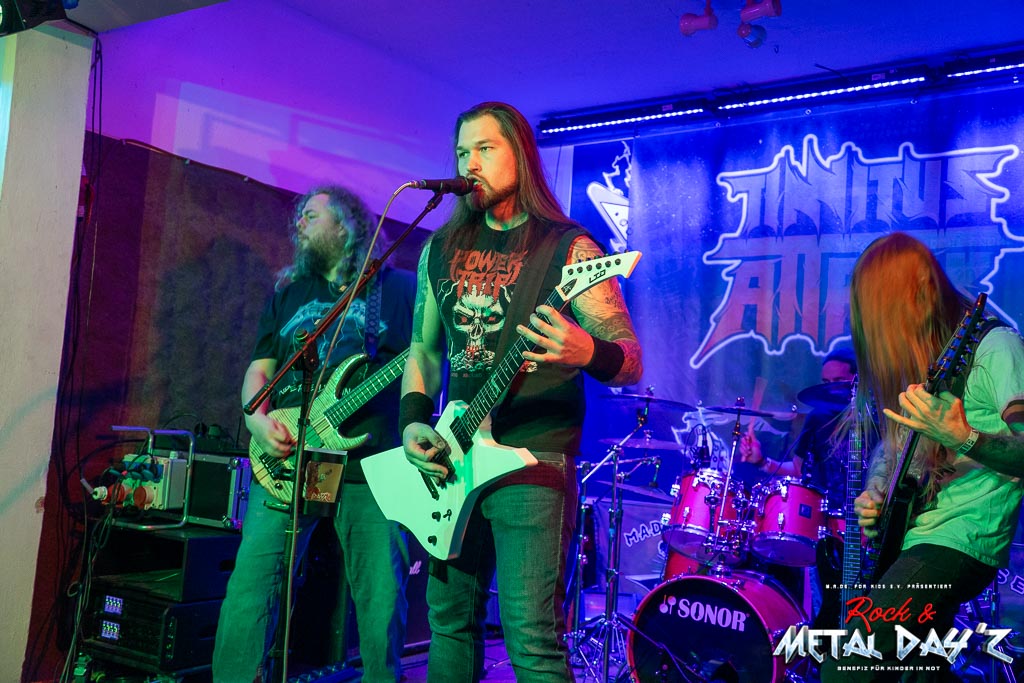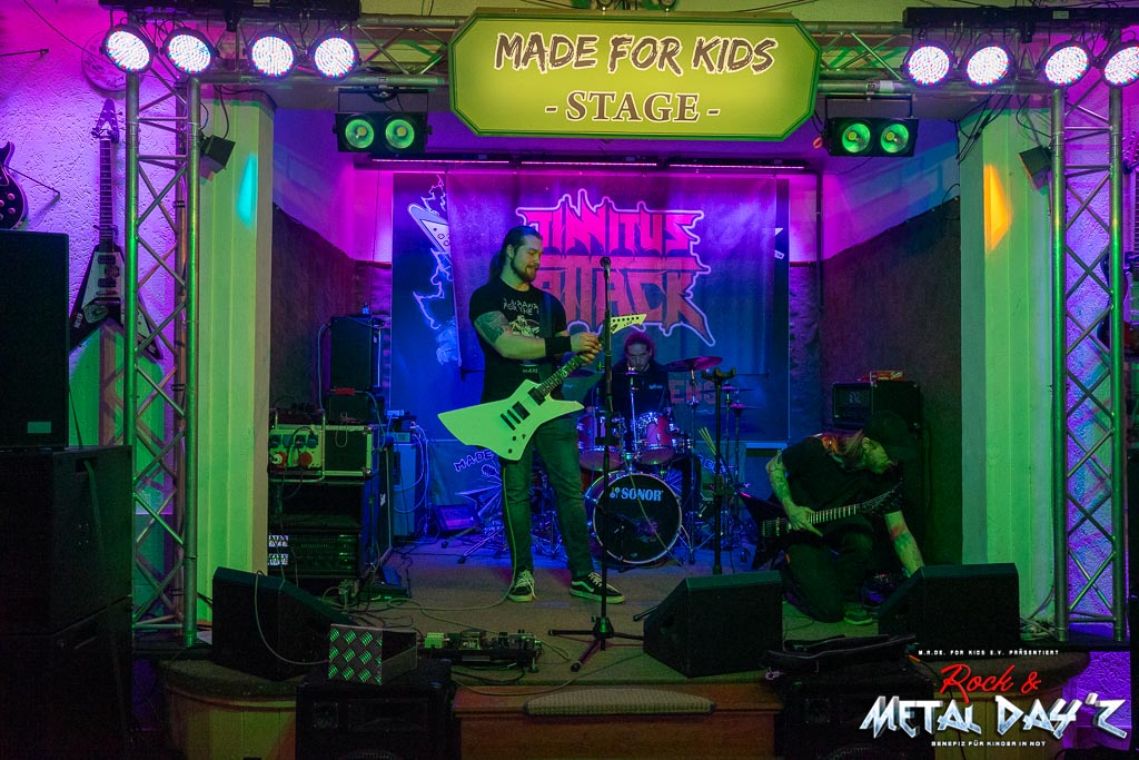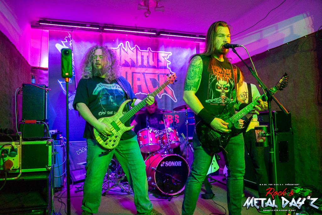 Ein frisch wiedergewählter Präsident Dreas Horn eröffnet gestenreich den Abend und Punkt 20:00 Uhr legen dann Tinnitus Attack aus Magdeburg einen brachialen Start hin. Thrash, Death und Black-Metal Einflüsse vermischen sich zu einem wahren musikalischen Orkan, freilich nicht ohne Melodien und Harmonien aussen vorzulassen.