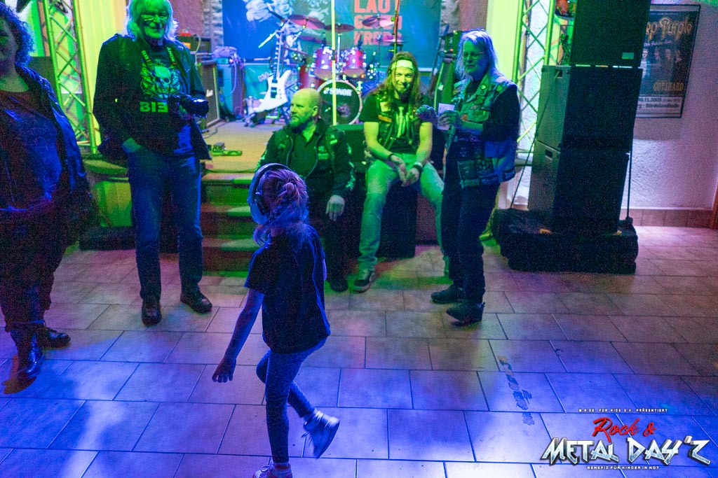 Es wird weiter gefeiert, getrunken und feinster Metal zweier bestens aufgelegter Bands bei tiefgründigen Gesprächen gefeiert. Aber die Bands waren noch nicht mal der Star des Abends… Schau selbst, sechs Jahre, Slipknot-Shirt und am abrocken wie eine ganz Grosse. Musikalische Früherziehung par excellence. Und da waren noch andere grossartige Eltern, regelmässige Gäste auf unserem Festival, die mit ihren Kindern alles richtig machen. Es ist ein wahre Freude, da die nächste Generation Metalheads gross werden zu sehen!