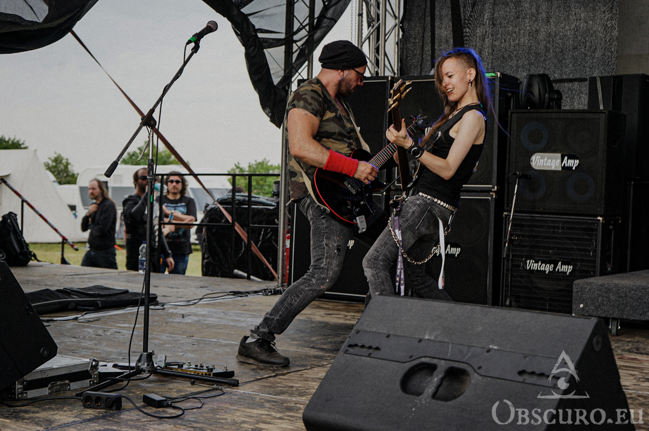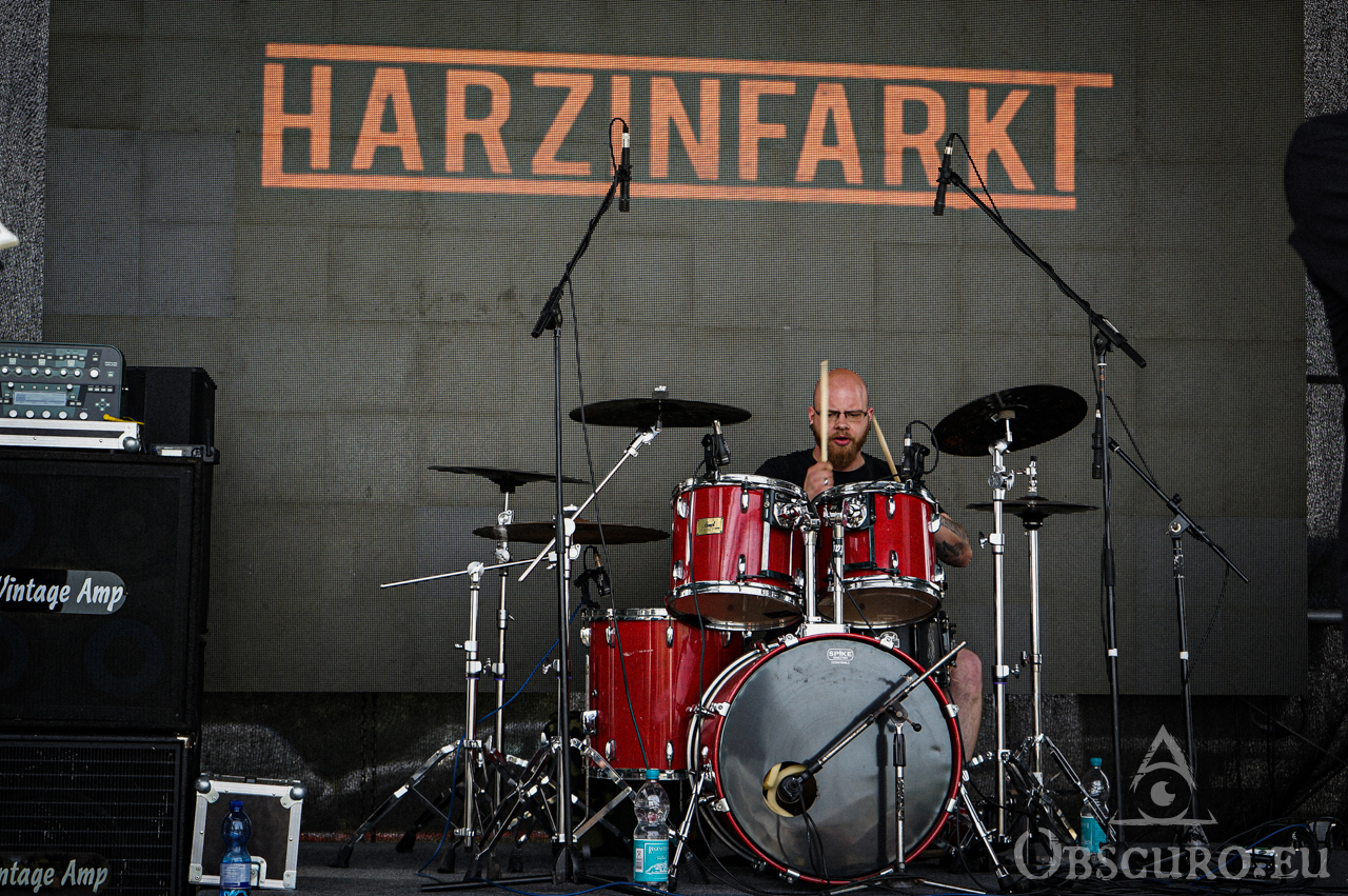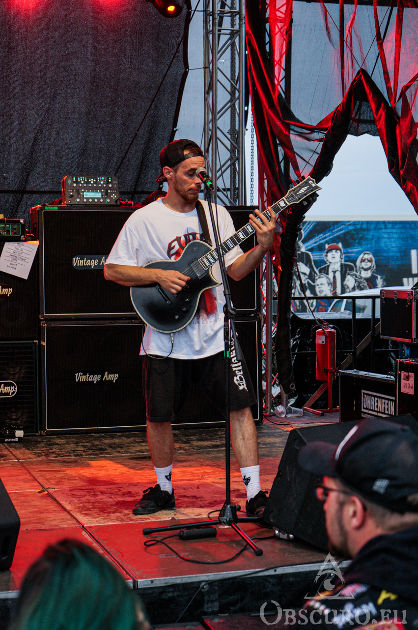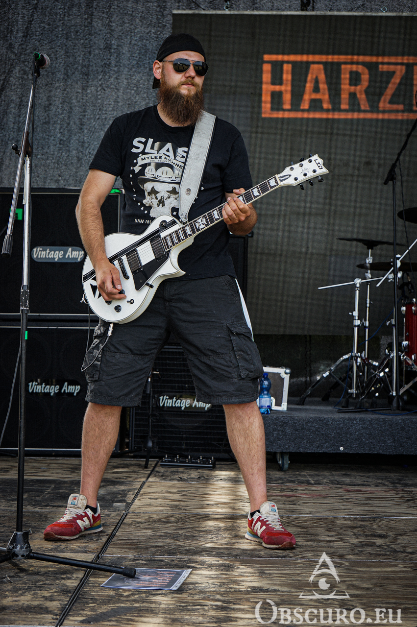I nearly miss Harzinfarkt entering the stage for this very same reason. Grab the camera, rush out of the tent. Thank the Highest Being making way and space in the first rows – not overcrowded early in the morning. Harzinfarkt play a genre mix between Metal, Deutschrock and Rock ‘n’ Roll with German lyrics of course. They are maybe the most local band of the festival being based just 12 km away at Schwanebeck. The could have come here by bike if they wanted to!