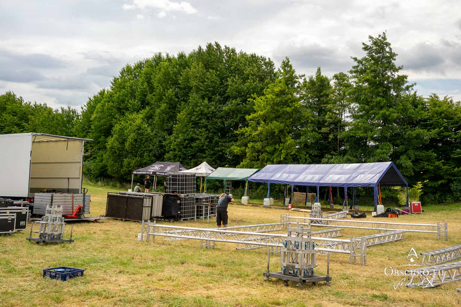 From Monday to Wednesday, the entire site will be built from scratch, with only the supply and backstage tents already in place. First, materials have to be brought in: construction fences, tents, kitchen utensils, tables, benches, pavilions – everything needed to make the festival a success, apart from good bands and spectators. Even a storm sweeping through the site in the afternoon does not stop the crew from setting up; what cannot be done is tackled with double the effort the next day.