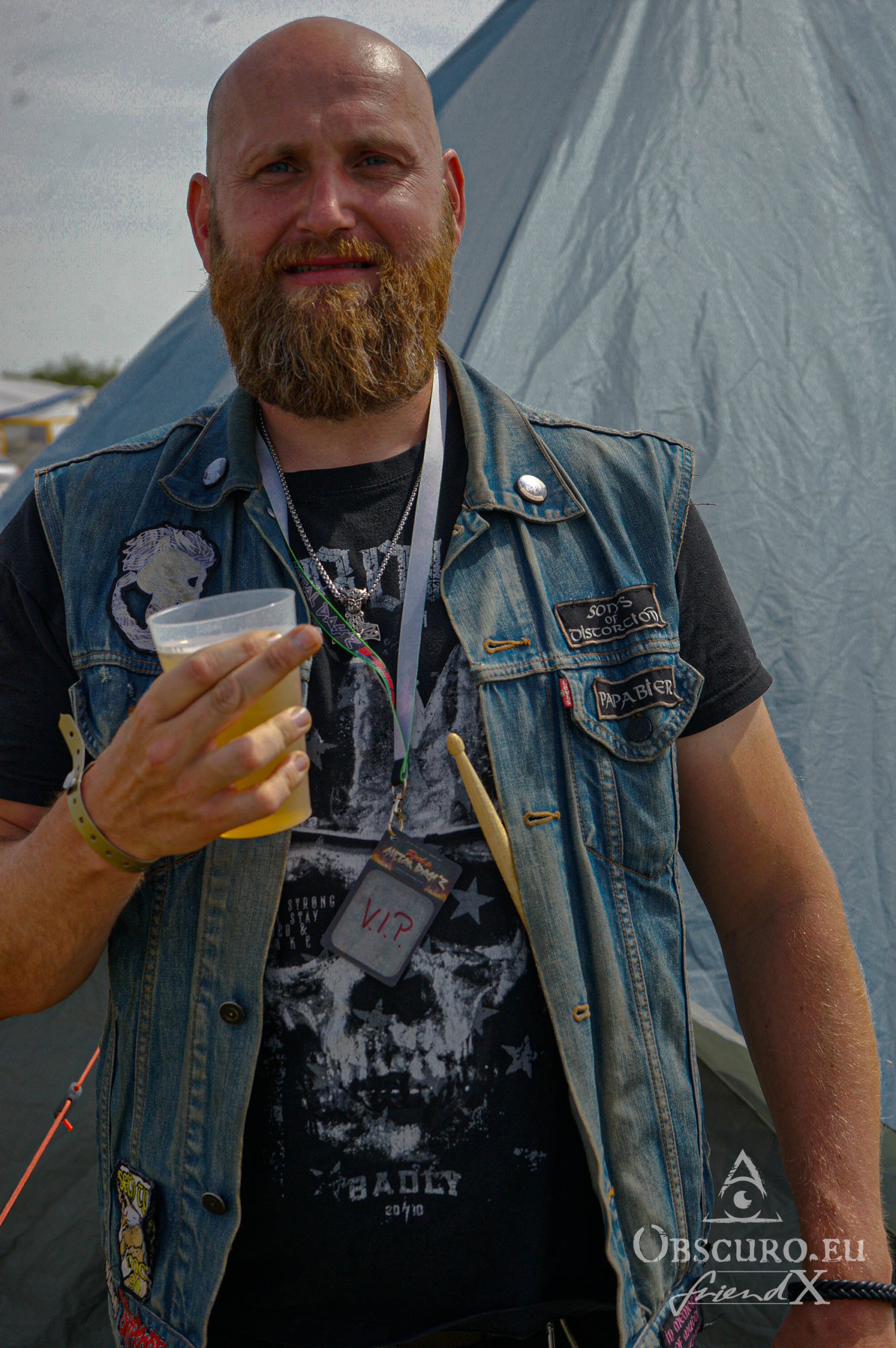 Remember this guy and his lovely stinky finger? He is a nice guy. He just lives his dreams at festivals. Like so many of us he can be a little Mr. Jekyll or Dr. Hyde, decide yourself which one you prefer. He is the head of Sons Of Distortion Metalclub from Berlin. On the other photo we have another kind of son of distortion, one of the youngest spectators. Well done parents, of course his ears are well protected with a “Mickey Mouse”. Whenever you bring your kids to festivals or concerts, please take care for their eardrum. Once damaged it will never recover.