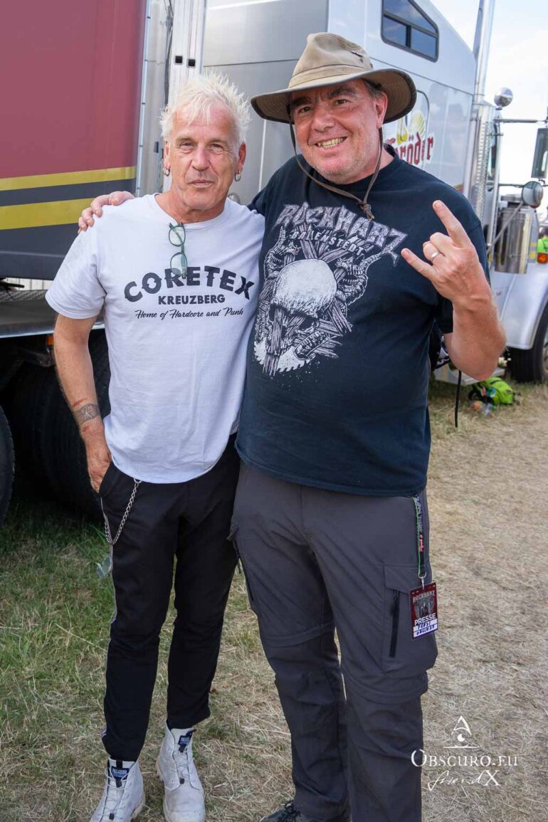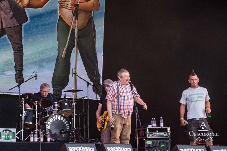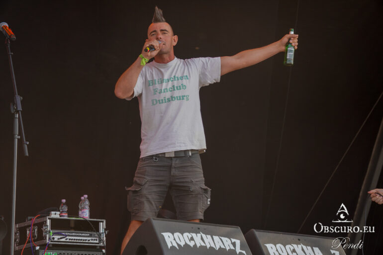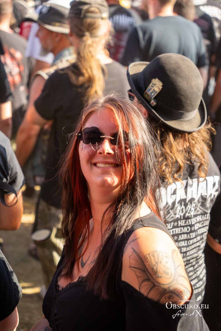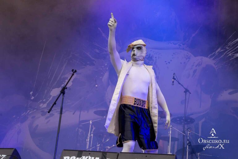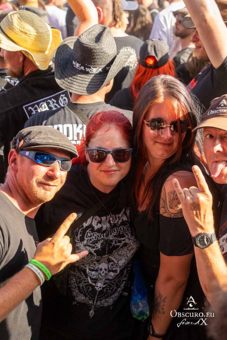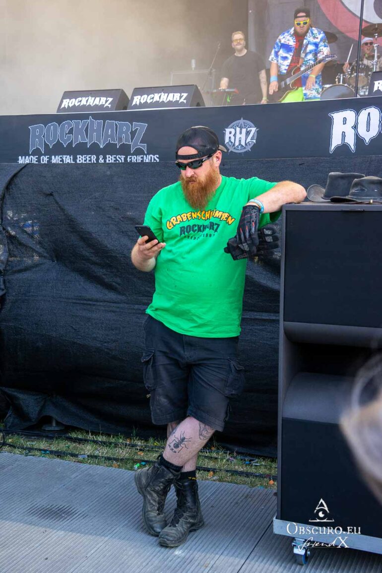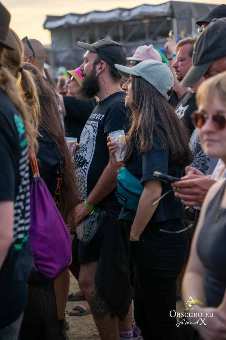 So we decide to wait in the little shade there is, cooling off until 15:00 when the infield finally opens completely and the stream of spectators spreads out in anticipation of what is to come, heading for the food and drink stands, the best spots in front of the double stage or the many merch stands. At 15:30, EXCREMENTORY GRINDFUCKERS are the first band of the festival to kick off with their extreme metal. Admittedly, their colourful stage outfits don’t quite match their musical style, but that doesn’t detract from the atmosphere, on the contrary.