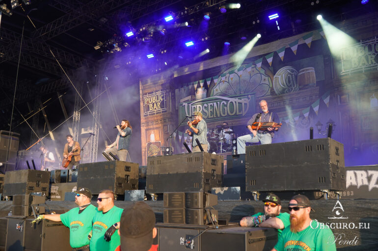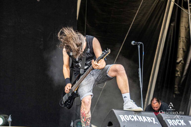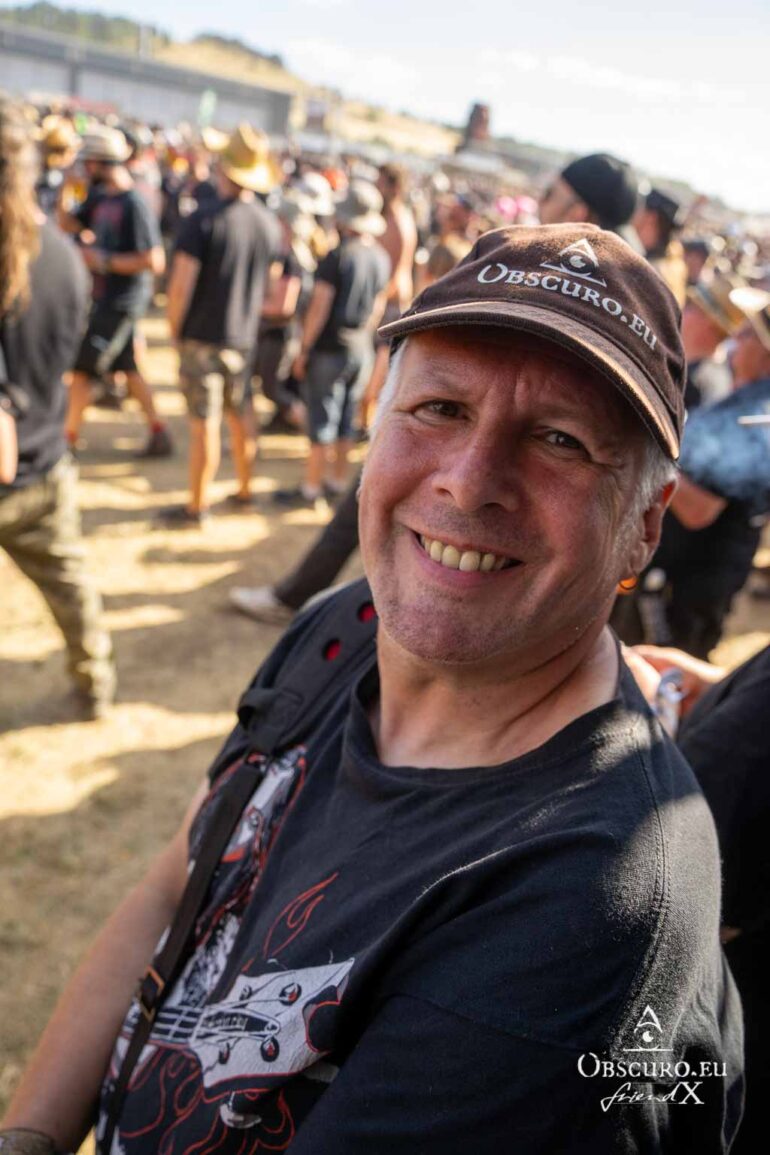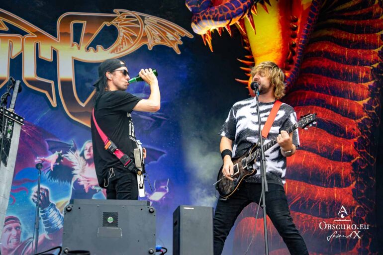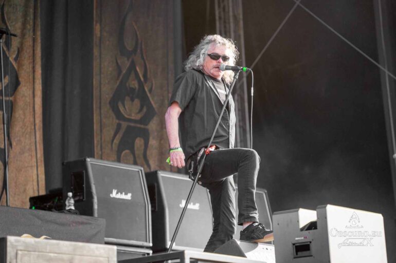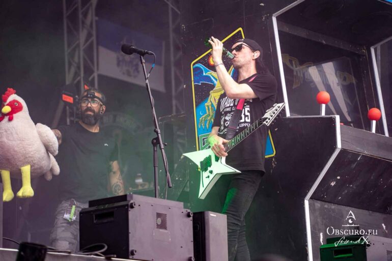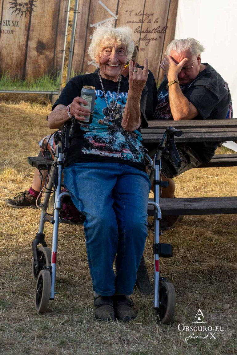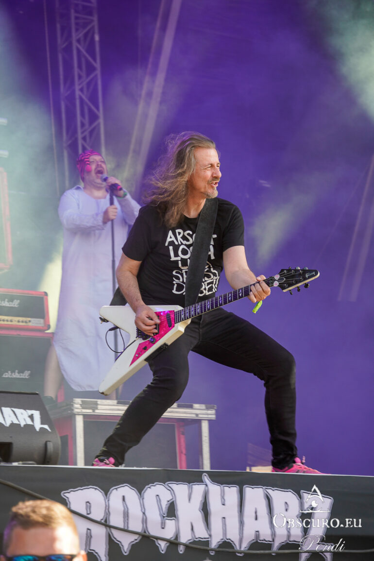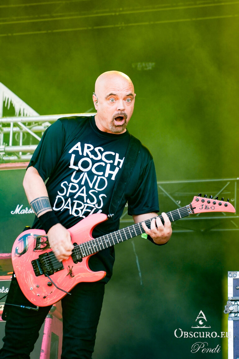So we decide to wait in the little shade there is, cooling off until 15:00 when the infield finally opens completely and the stream of spectators spreads out in anticipation of what is to come, heading for the food and drink stands, the best spots in front of the double stage or the many merch stands. At 15:30, EXCREMENTORY GRINDFUCKERS are the first band of the festival to kick off with their extreme metal. Admittedly, their colourful stage outfits don’t quite match their musical style, but that doesn’t detract from the atmosphere, on the contrary.