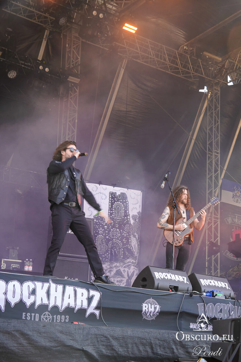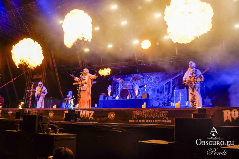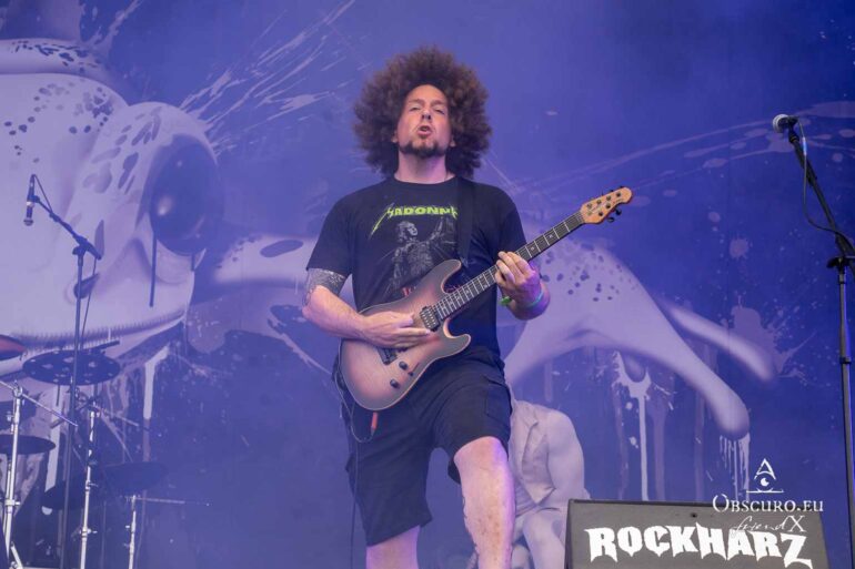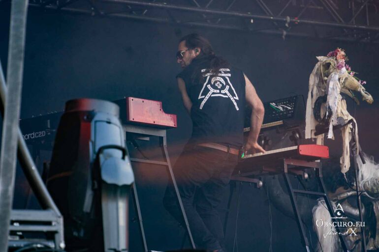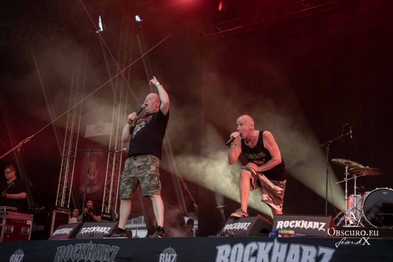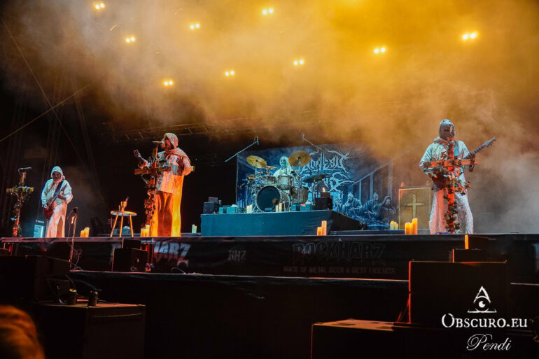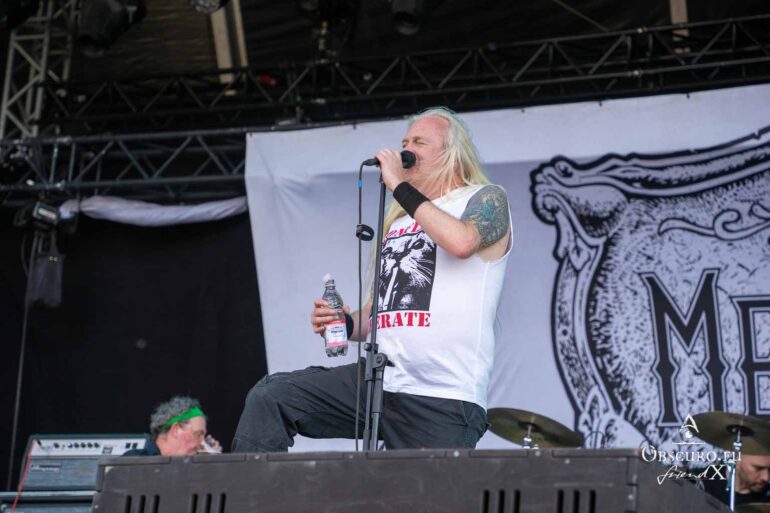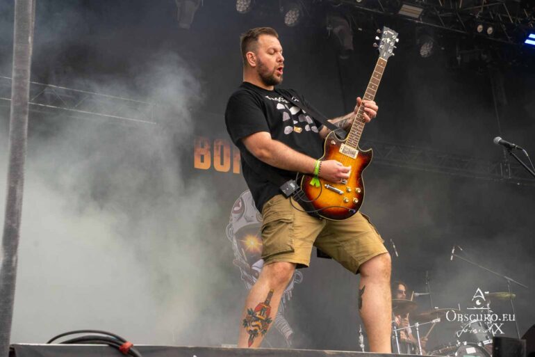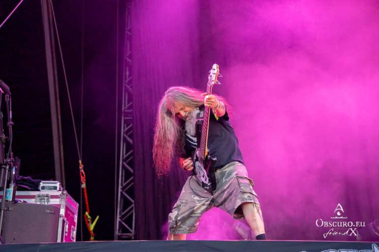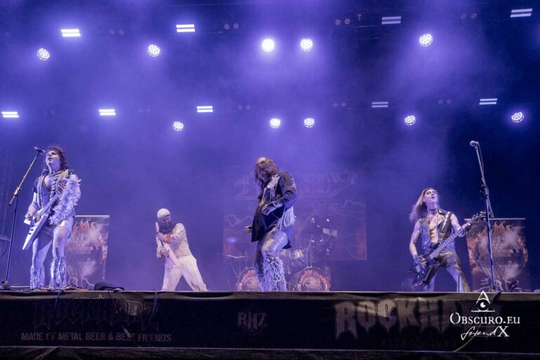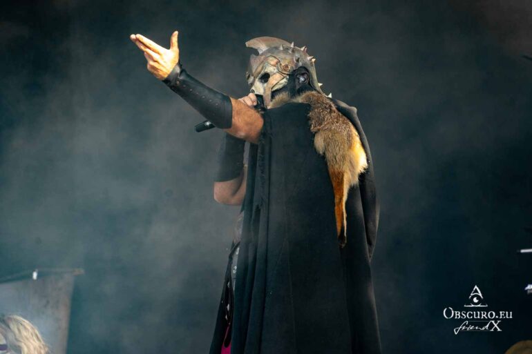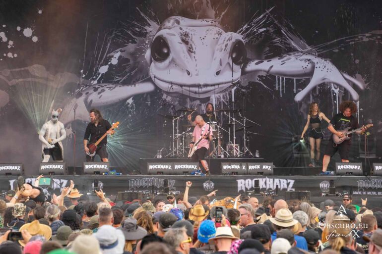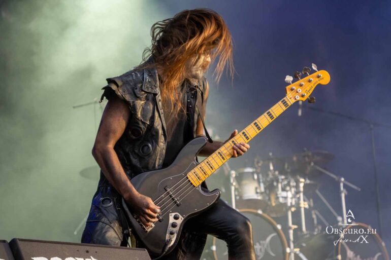 So we decide to wait in the little shade there is, cooling off until 15:00 when the infield finally opens completely and the stream of spectators spreads out in anticipation of what is to come, heading for the food and drink stands, the best spots in front of the double stage or the many merch stands. At 15:30, EXCREMENTORY GRINDFUCKERS are the first band of the festival to kick off with their extreme metal. Admittedly, their colourful stage outfits don’t quite match their musical style, but that doesn’t detract from the atmosphere, on the contrary.