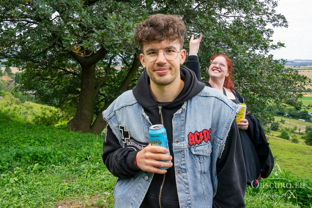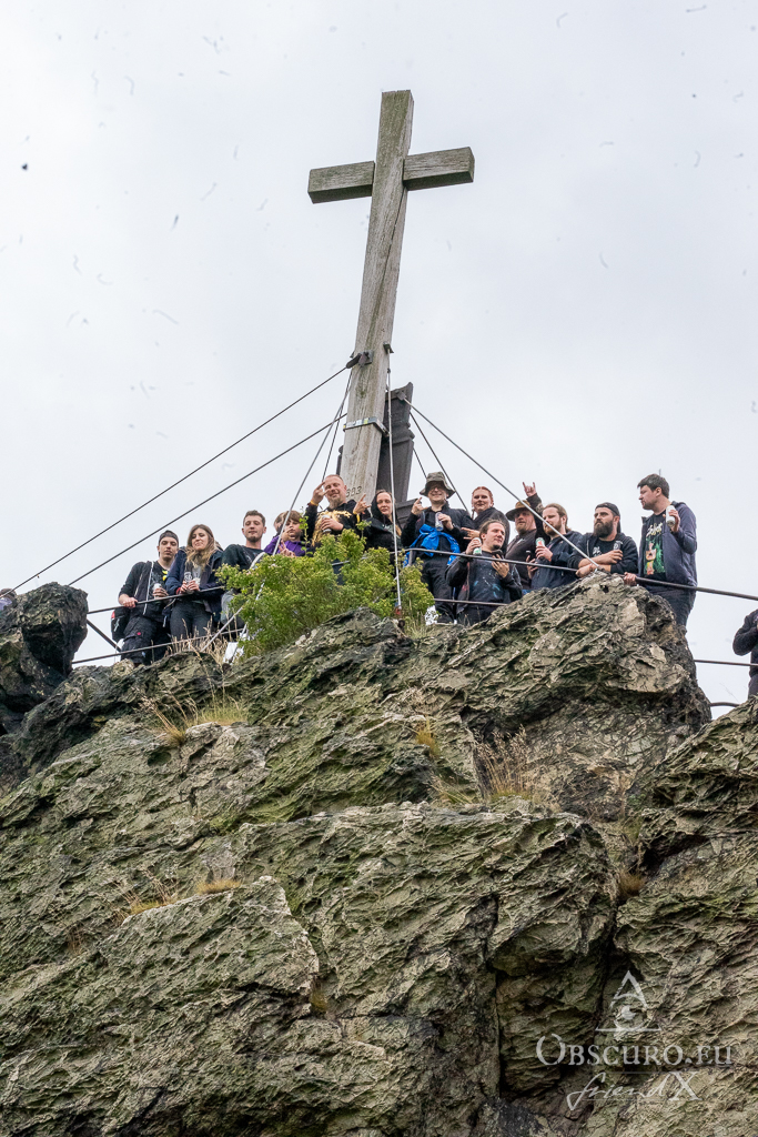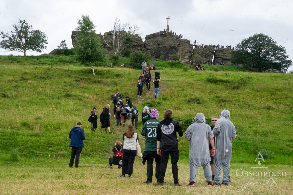 After a relaxed breakfast it is time for the traditional death march to the Teufelsmauer. It is not too hot, so it is easier to climb the hill than in the previous year. The view over the already packed campsite is adorable as usual and we can identify our site, lovely. And we identify the car of our first late comer arriving! And here we also pick up Tom who camps alone and settles over to our site afterwards.