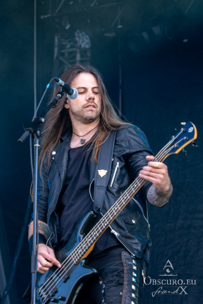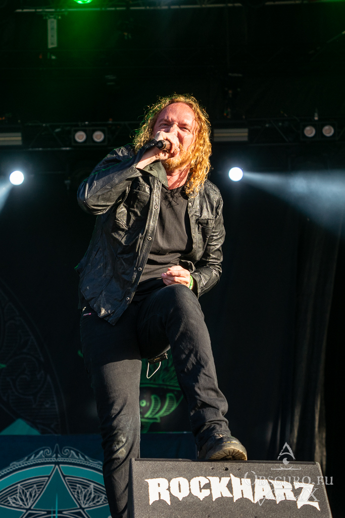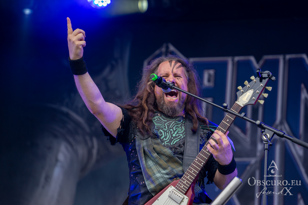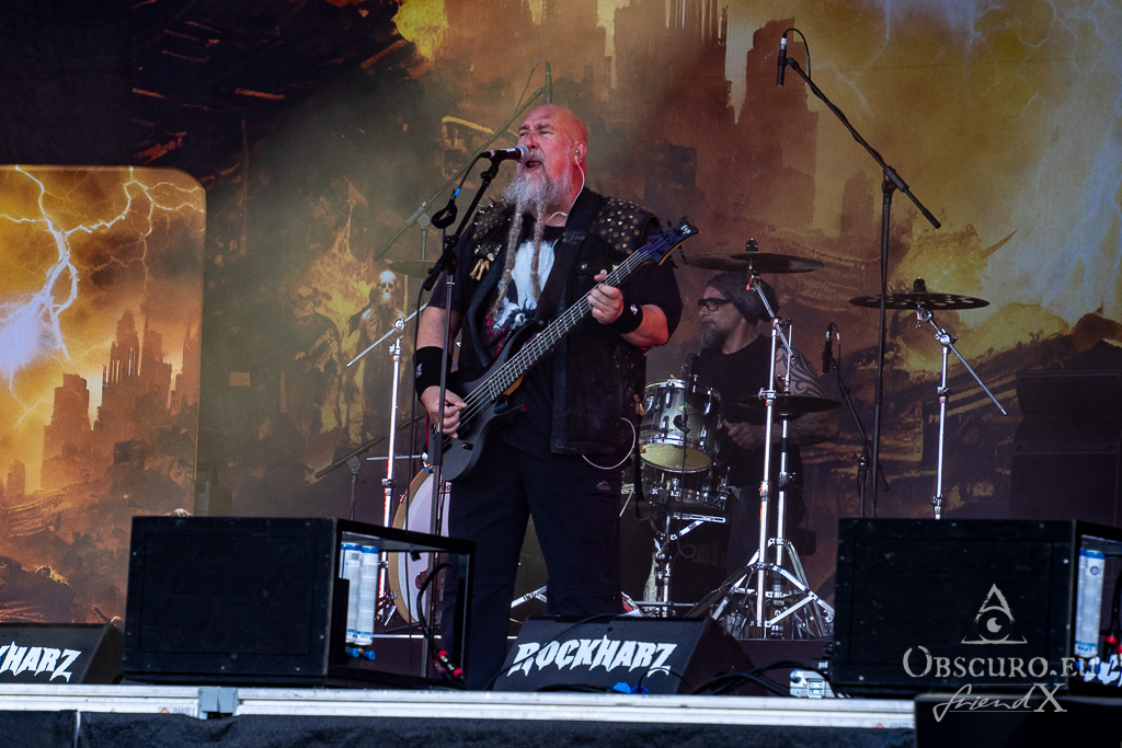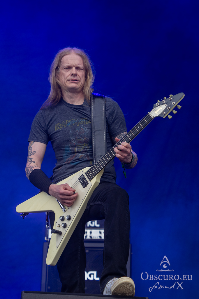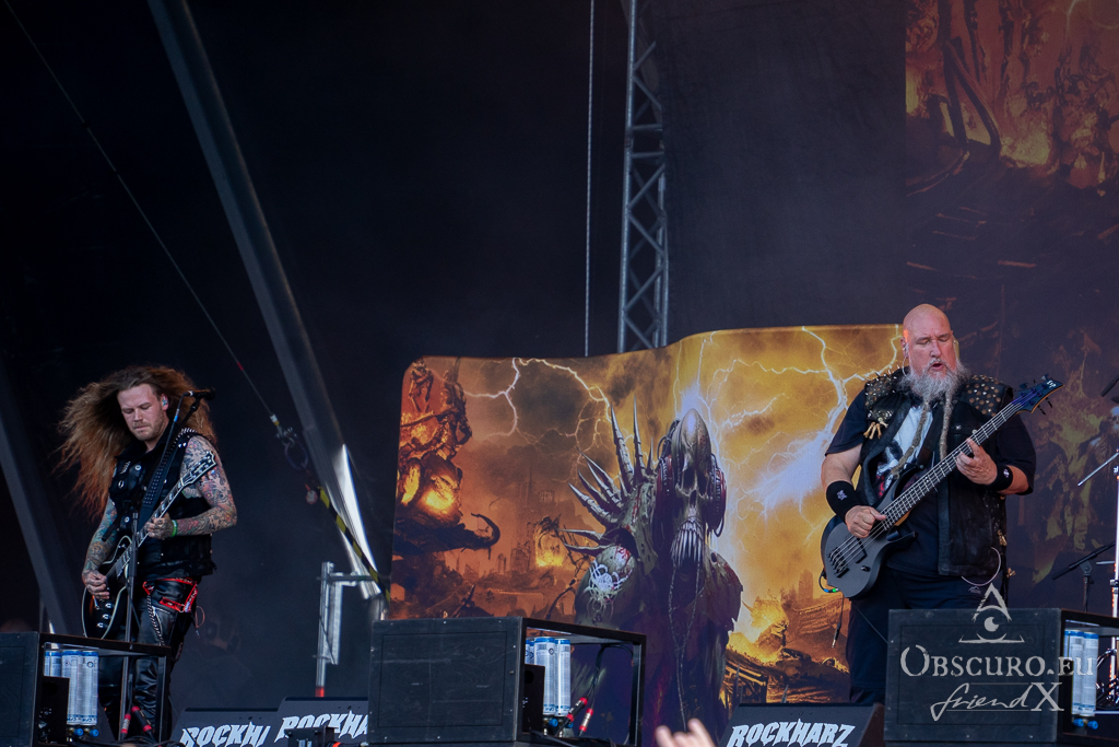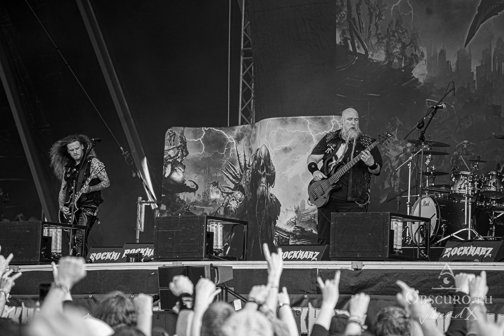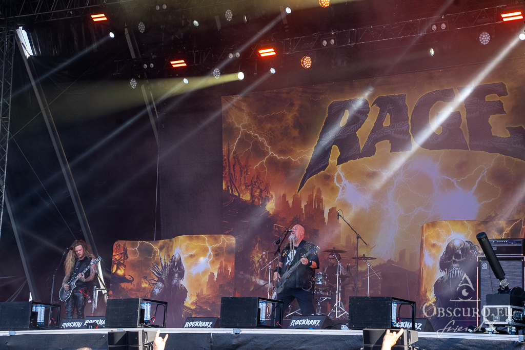 The water on the roof of the Rock Rage Stage is ready too and hits the bass equipment. It is not playable anymore and Peavy needs to rely on his vocal skills only. It is a bit of a strange sound without bass thunders but that is what can happen at an open-air concert. Good musicians overcome it as they do.
