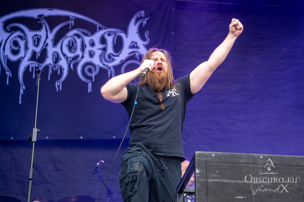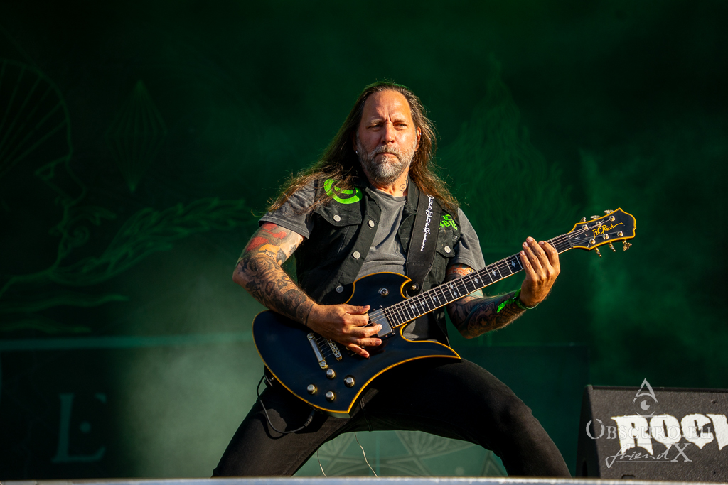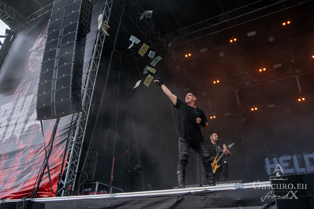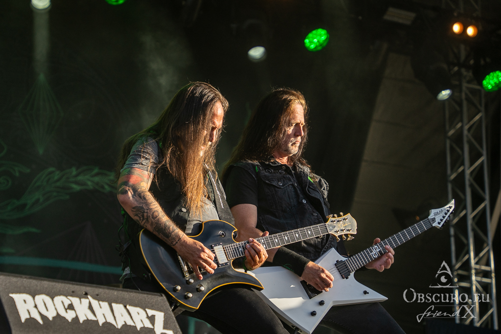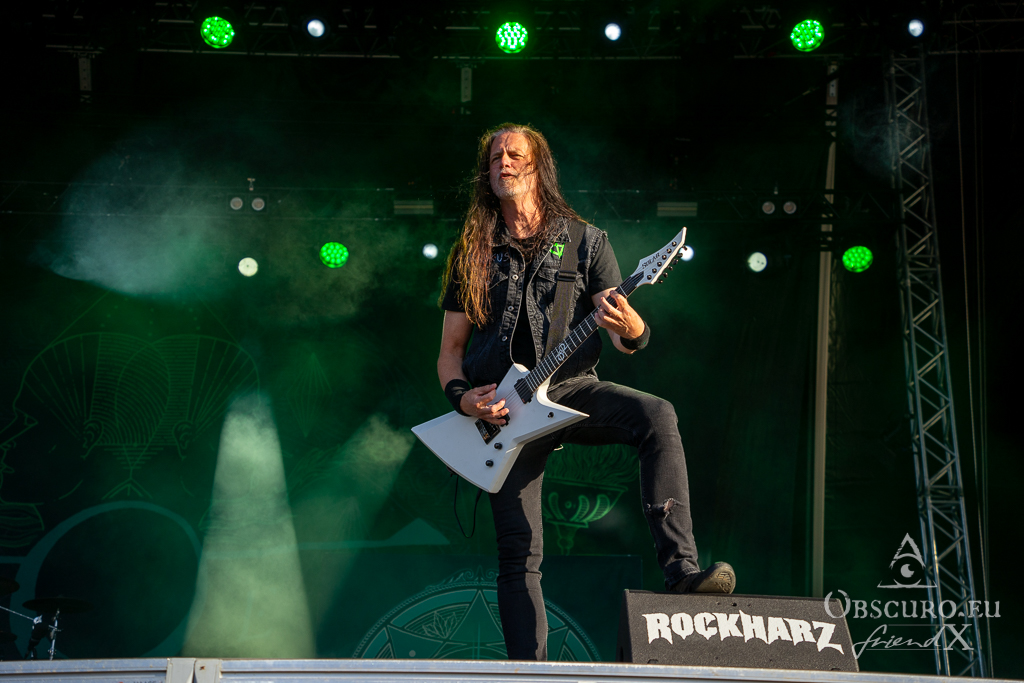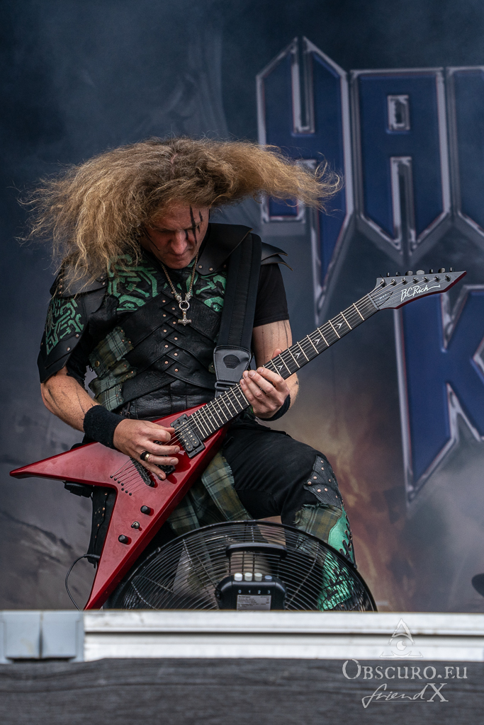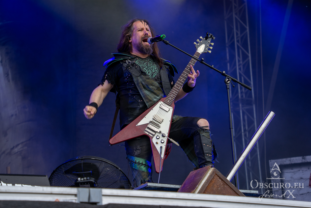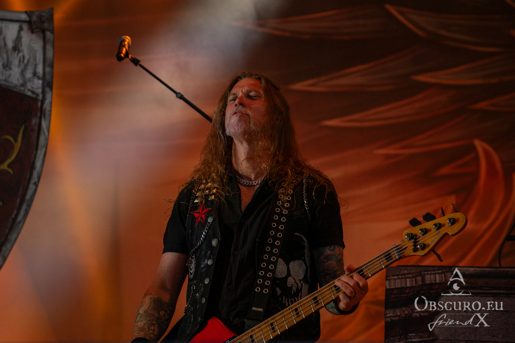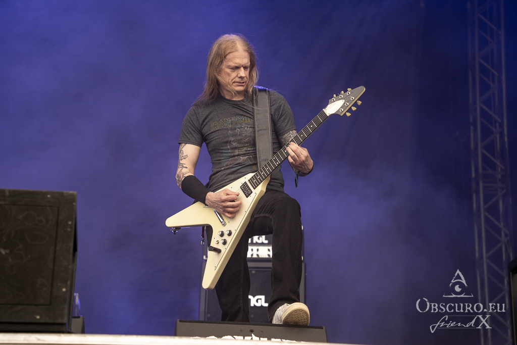 The water on the roof of the Rock Rage Stage is ready too and hits the bass equipment. It is not playable anymore and Peavy needs to rely on his vocal skills only. It is a bit of a strange sound without bass thunders but that is what can happen at an open-air concert. Good musicians overcome it as they do.